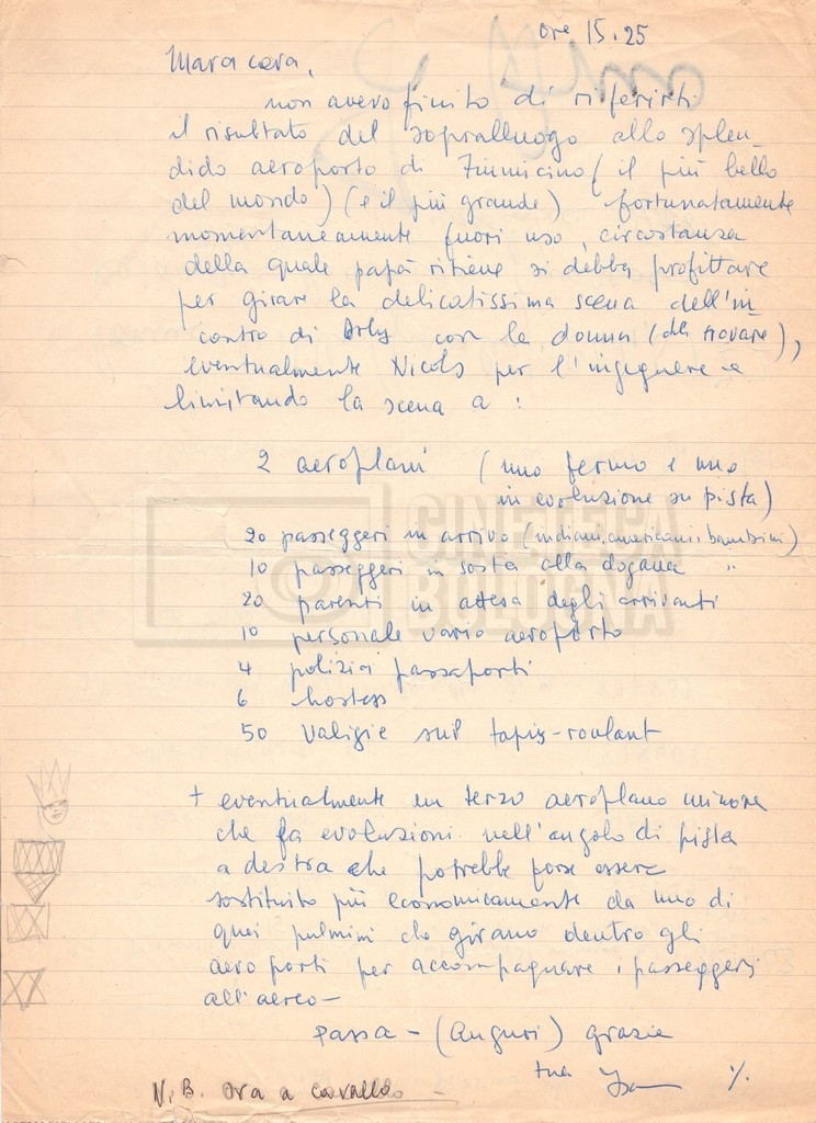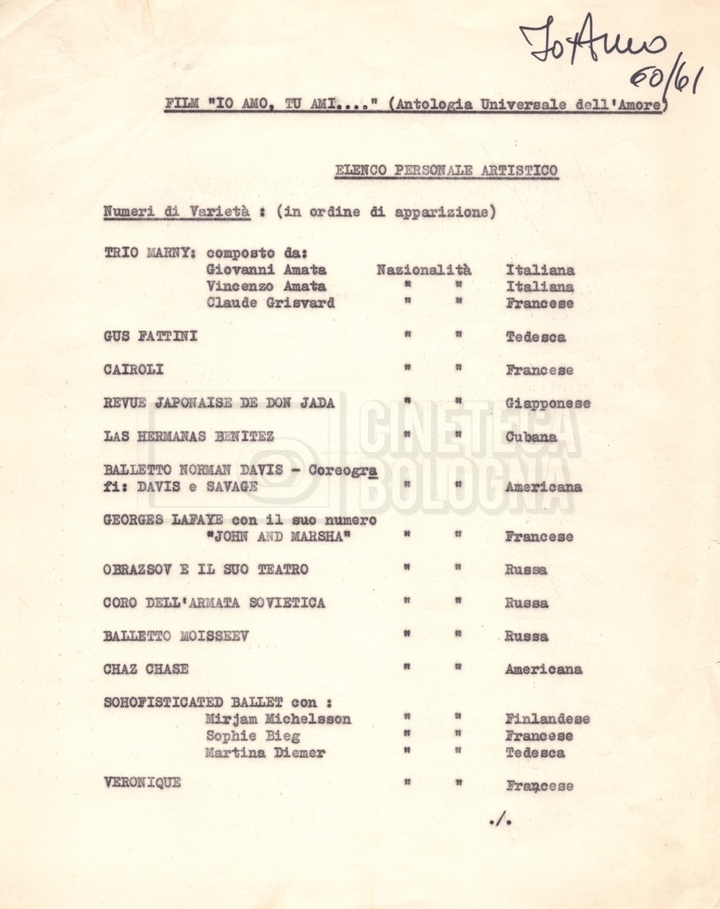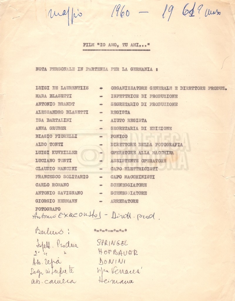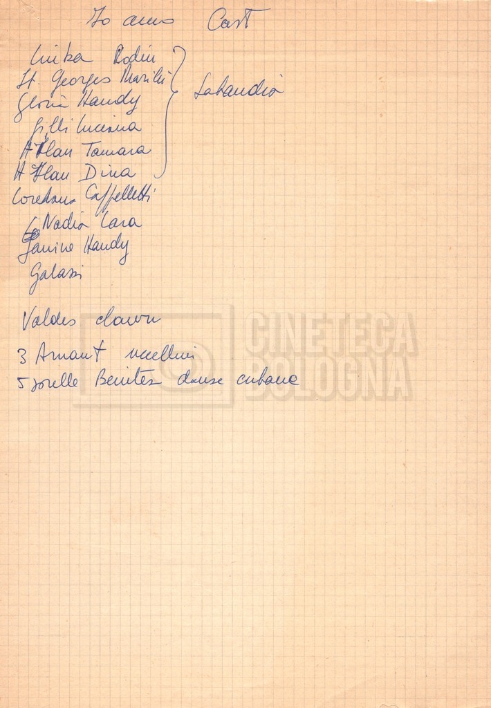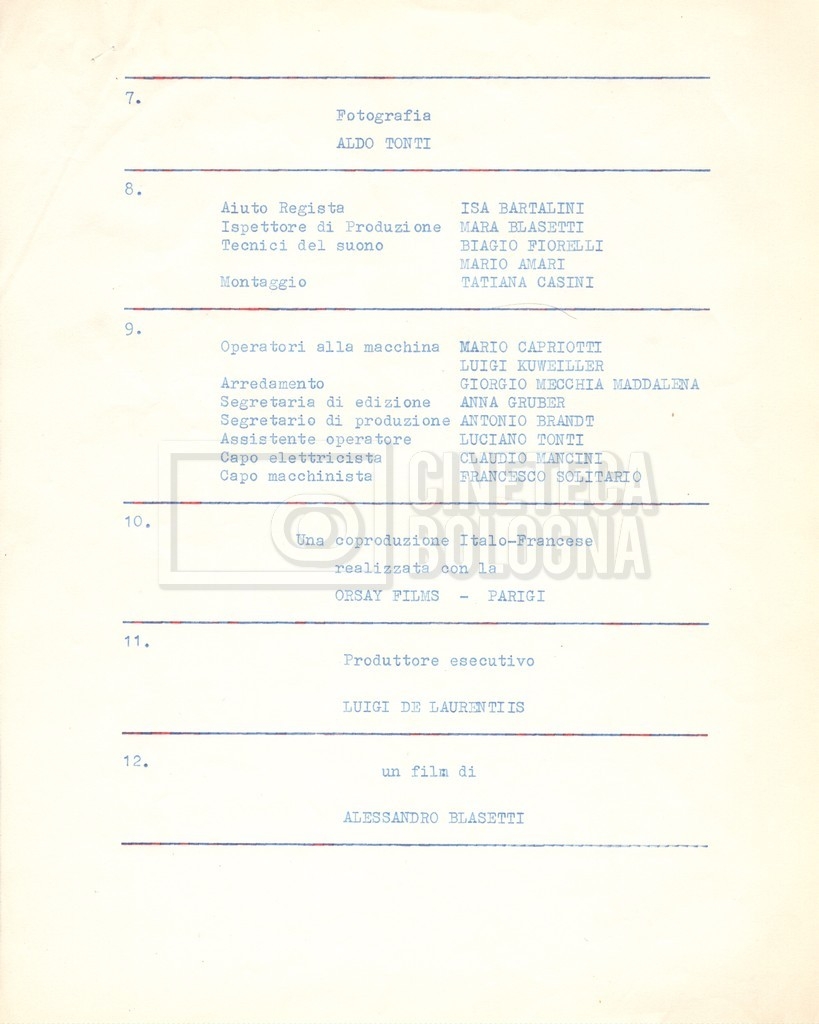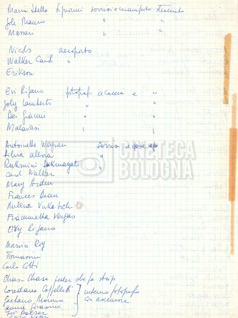 - Diversi appunti mss., tra cui una nota di aggiornamento di Isa Bartalini, aiuto regista.