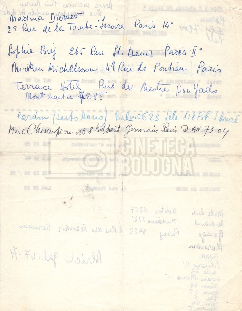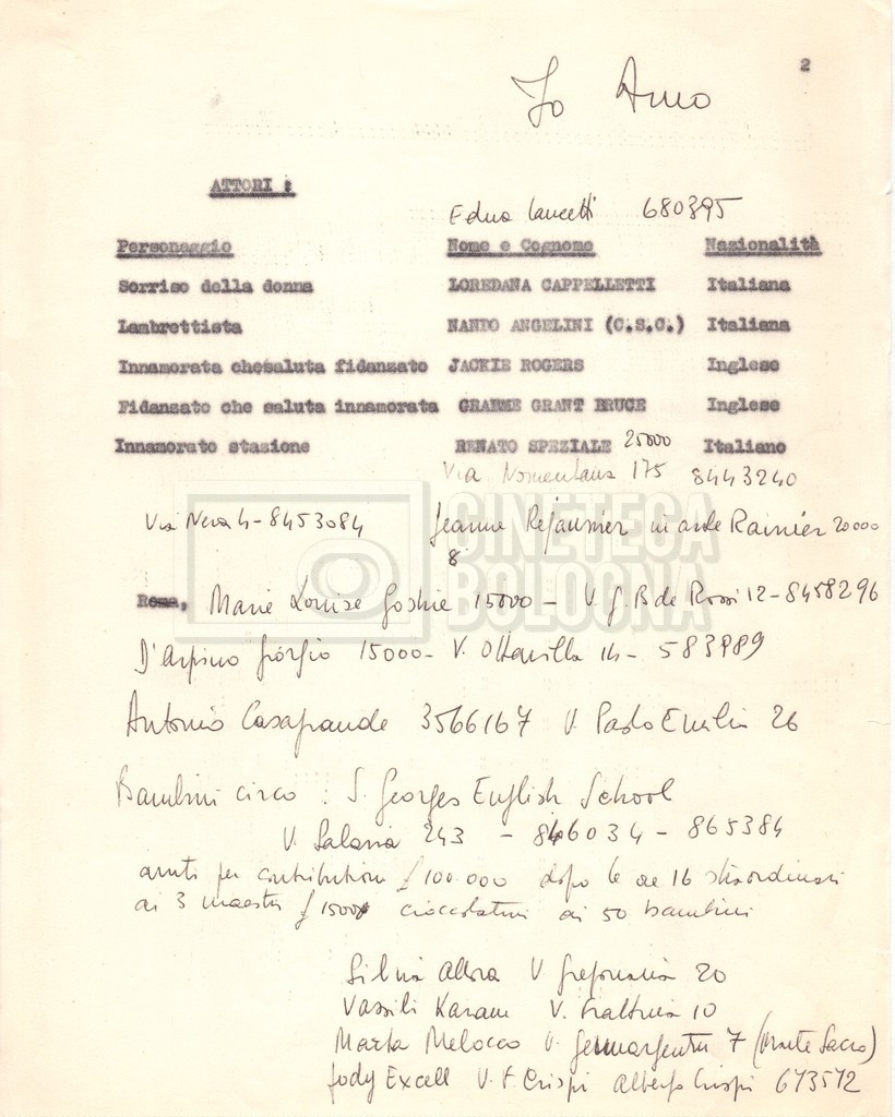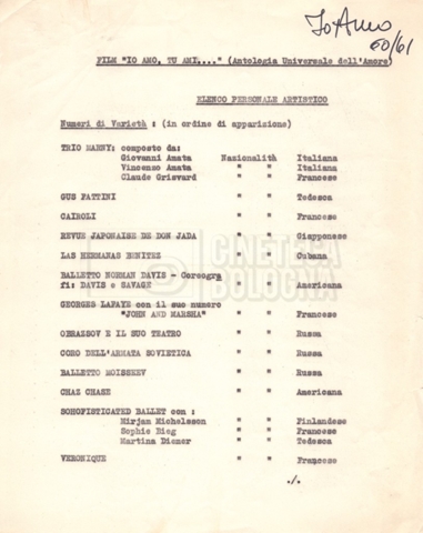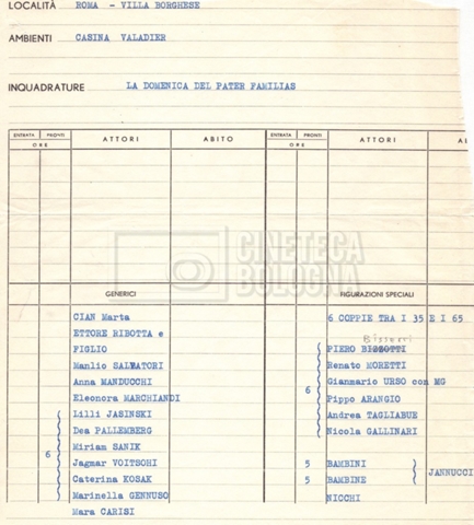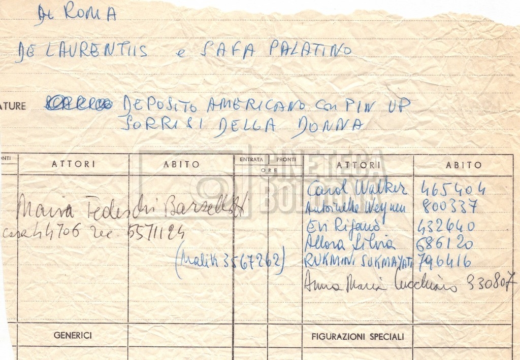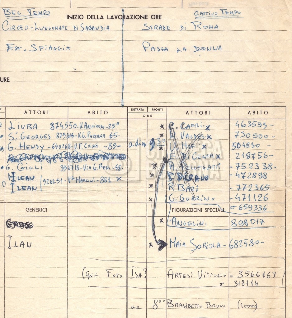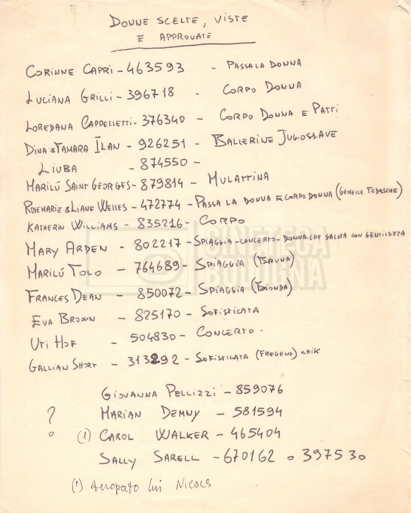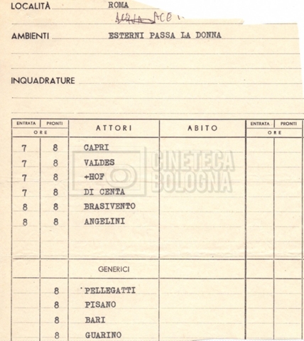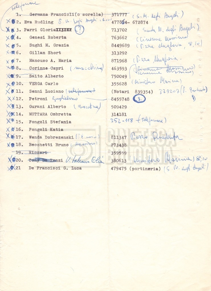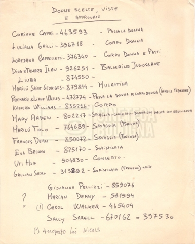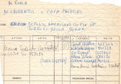 - Elenchi del cast artistico e tecnico, per le varie location europee, per le comparse, talvolta con l'indicazione dei recapiti;