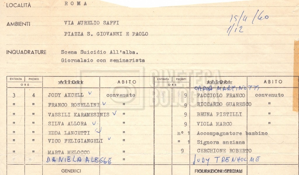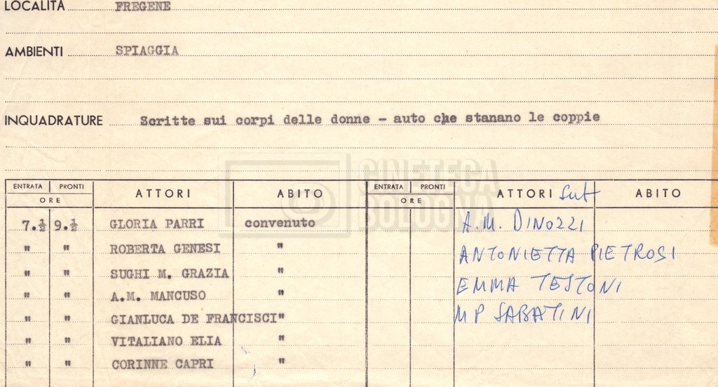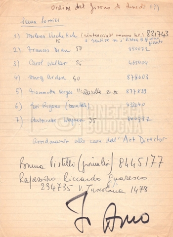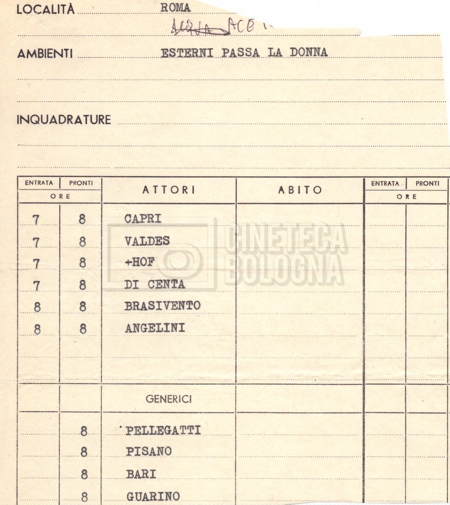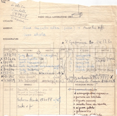 - Ordini del giorno, convocazioni degli attori per singole scene e note di personale in partenza per le varie location;