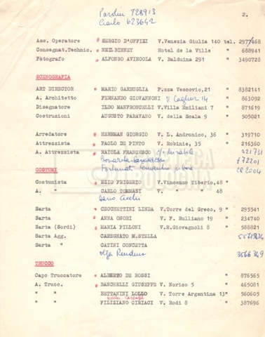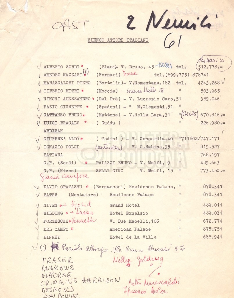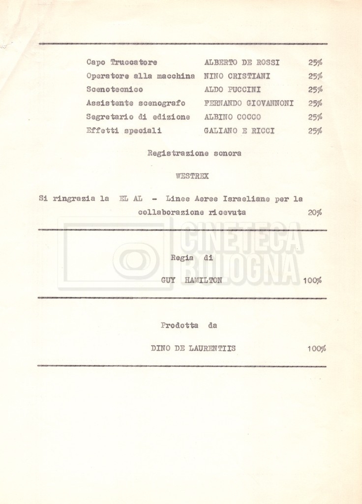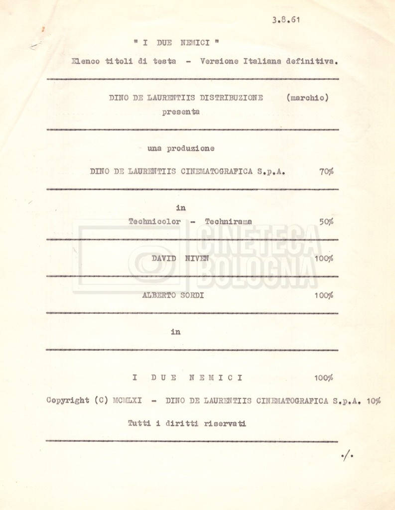 Torna alla banca dati “Cast e unit lists” Documento storico Fondo Mara Blasetti / “Film Mara girati” / I due nemici Ambiti e contenuto Contiene:- Elenchi del cast artistico e tecnico, talvolta con l'indicazione dei recapiti, tra cui un elenco del cast israeliano;- I titoli di testa e di coda nella versione italiana e per il mercato americano. Informazioni archivistiche Cronologia: 1961 Numero di ordinamento definitivo: 1.6.1 Numero di ordinamento provvisorio: 4.1.A Descrizione fisica: fascicolo Immagini digitalizzate Informazioni sul film titolo originale: The Best of Enemies altri titoli: I due nemici regia: Hamilton, Guy anno: 1961 paese di produzione: Regno Unito - Italia lingua principale: inglese altre lingue: italiana Documenti correlati Vai alla banca dati