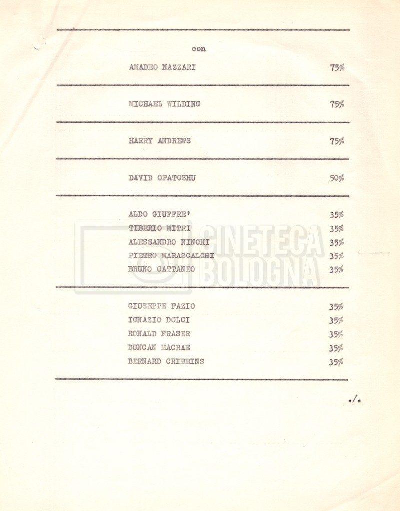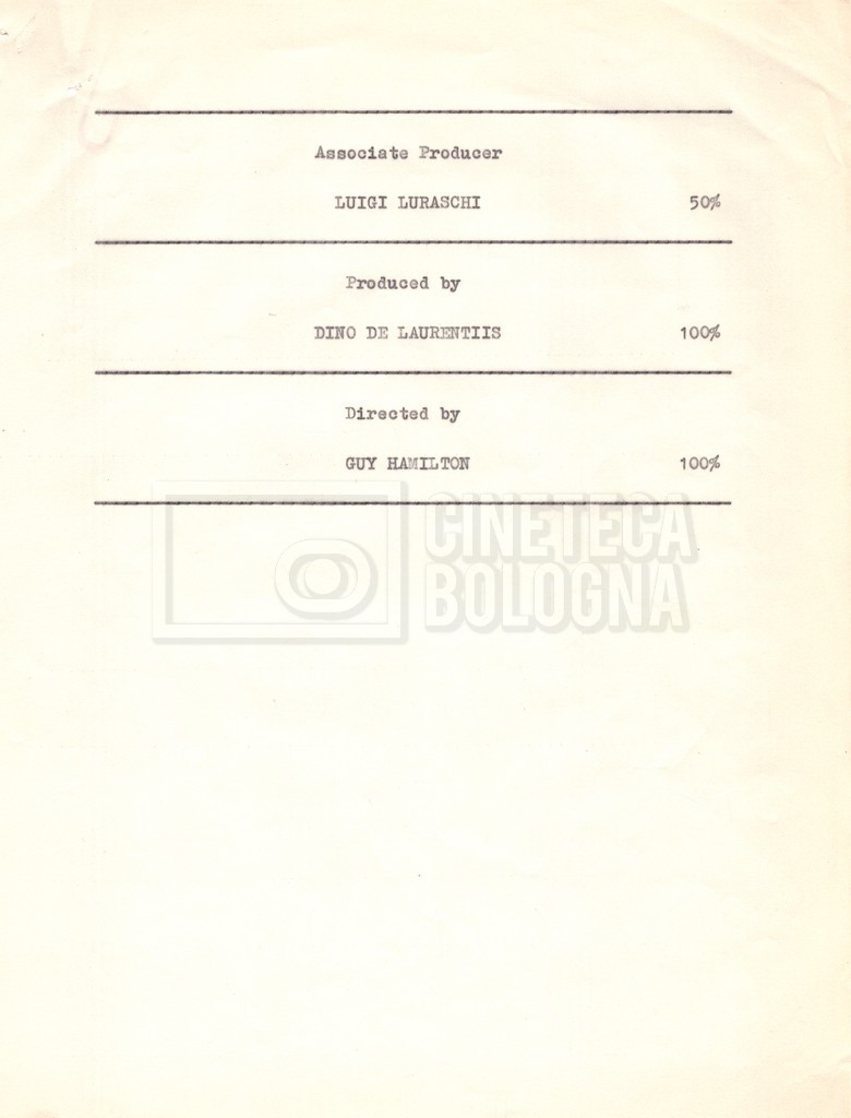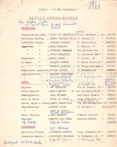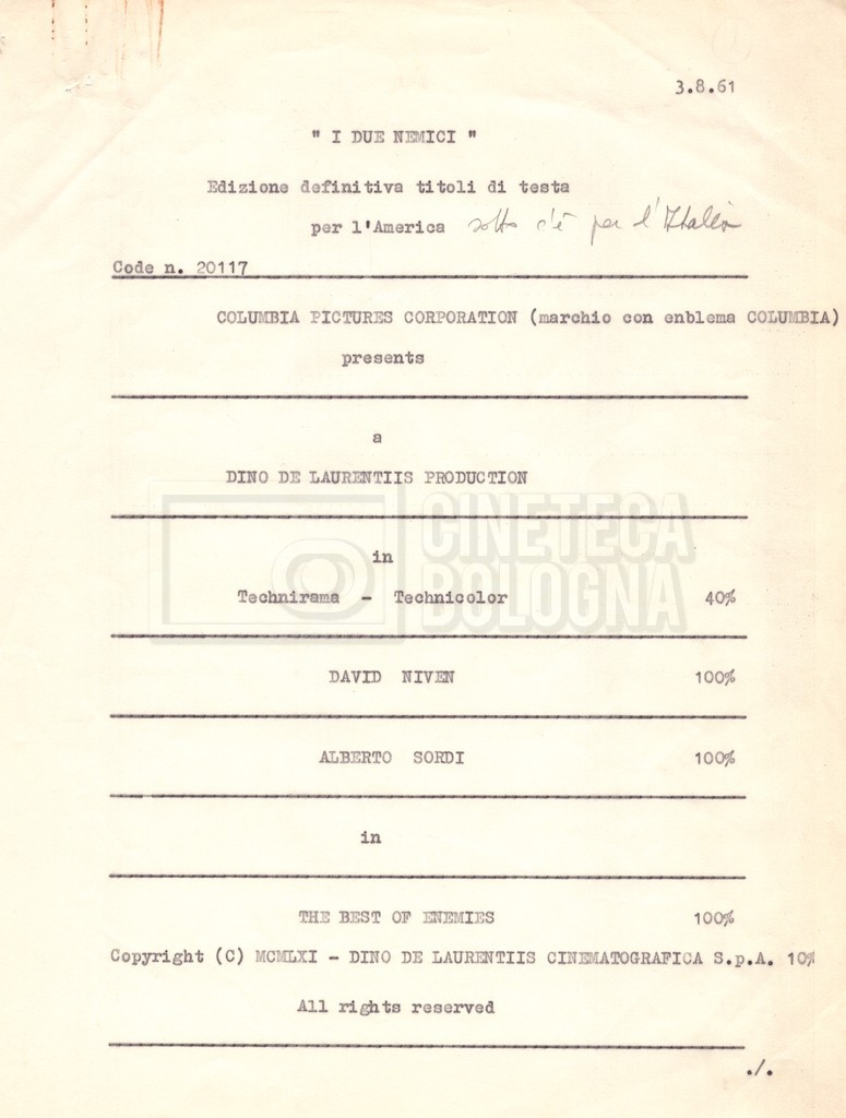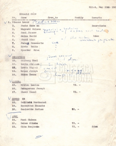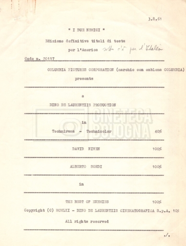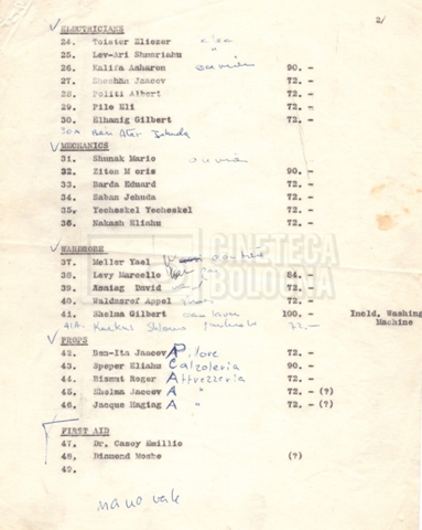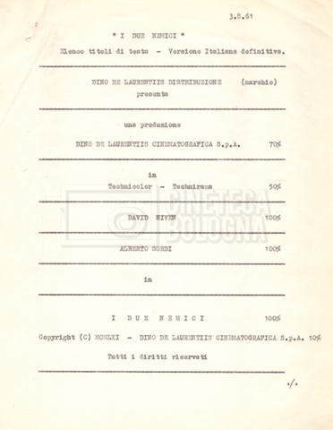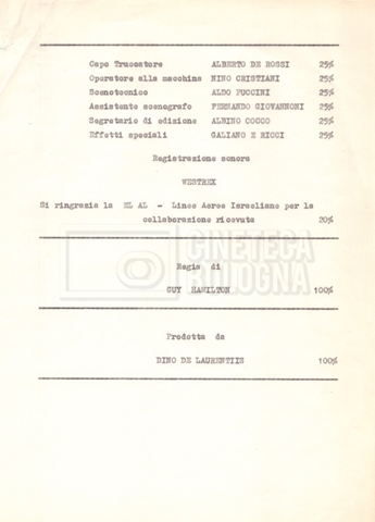 Torna alla banca dati “Cast e unit lists” Documento storico Fondo Mara Blasetti / “Film Mara girati” / I due nemici Ambiti e contenuto Contiene:– Elenchi del cast artistico e tecnico, talvolta con l’indicazione dei recapiti, tra cui un elenco del cast israeliano;– I titoli di testa e di coda nella versione italiana e per il mercato americano. Informazioni archivistiche Cronologia: 1961 Numero di ordinamento definitivo: 1.6.1 Numero di ordinamento provvisorio: 4.1.A Descrizione fisica: fascicolo Immagini digitalizzate Informazioni sul film titolo originale: The Best of Enemies altri titoli: I due nemici regia: Hamilton, Guy anno: 1961 paese di produzione: Regno Unito – Italia lingua principale: inglese altre lingue: italiana Documenti correlati Vai alla banca dati DOCUMENTO STORICO Corrispondenza con il regista Guy Hamilton e la moglie Kerima (Miriam Charriére) DOCUMENTO STORICO “I due nemici”