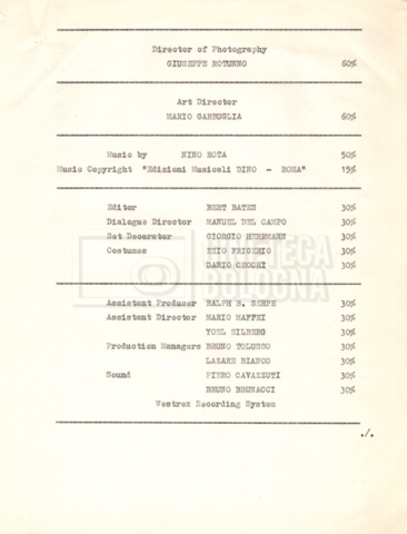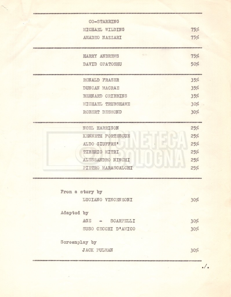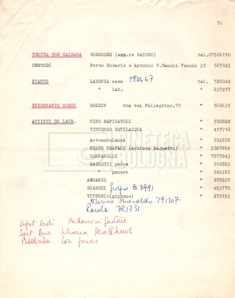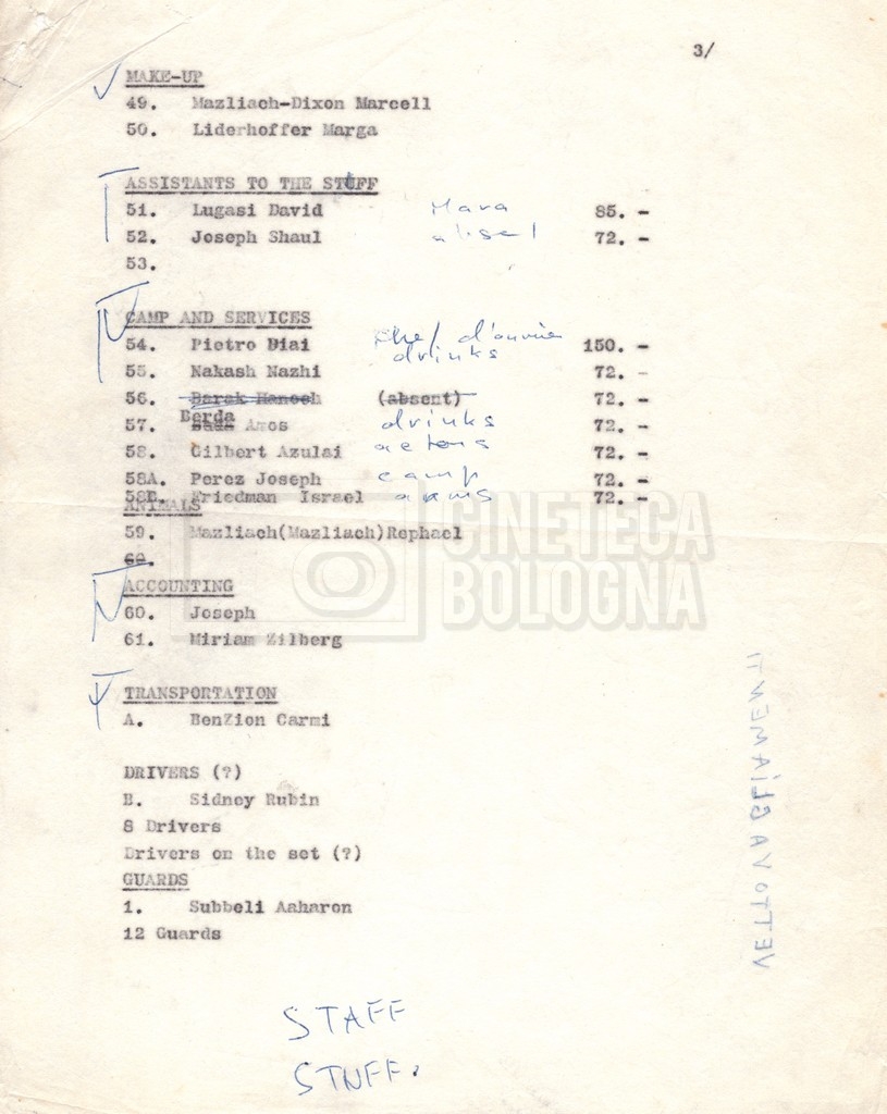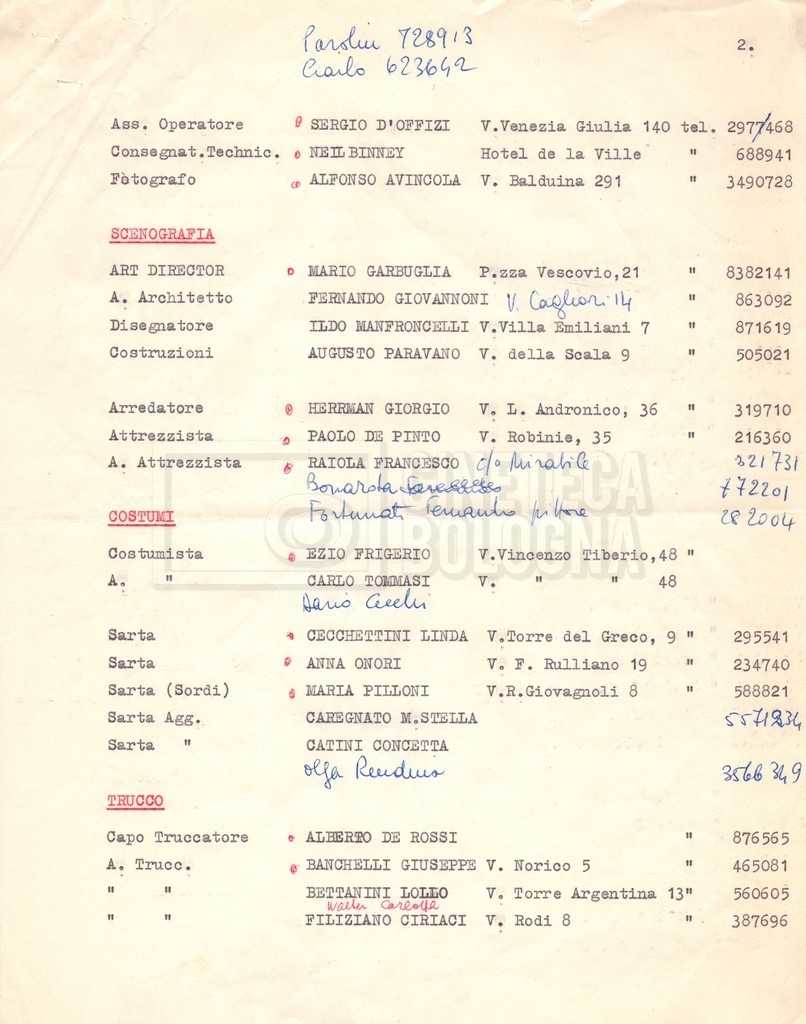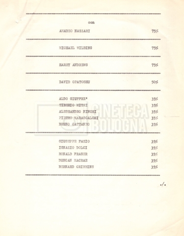 Torna alla banca dati “Cast e unit lists” Documento storico Fondo Mara Blasetti / “Film Mara girati” / I due nemici Ambiti e contenuto Contiene:– Elenchi del cast artistico e tecnico, talvolta con l’indicazione dei recapiti, tra cui un elenco del cast israeliano;– I titoli di testa e di coda nella versione italiana e per il mercato americano. Informazioni archivistiche Cronologia: 1961 Numero di ordinamento definitivo: 1.6.1 Numero di ordinamento provvisorio: 4.1.A Descrizione fisica: fascicolo Immagini digitalizzate Informazioni sul film titolo originale: The Best of Enemies altri titoli: I due nemici regia: Hamilton, Guy anno: 1961 paese di produzione: Regno Unito – Italia lingua principale: inglese altre lingue: italiana Documenti correlati Vai alla banca dati DOCUMENTO STORICO Corrispondenza con il regista Guy Hamilton e la moglie Kerima (Miriam Charriére) DOCUMENTO STORICO “I due nemici”