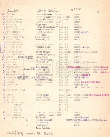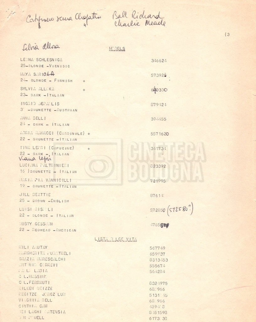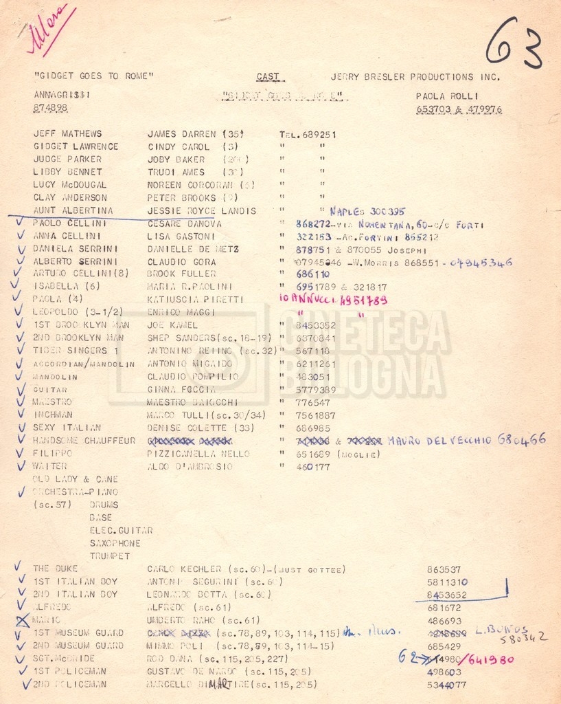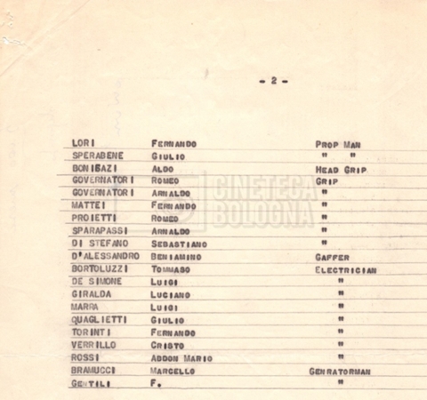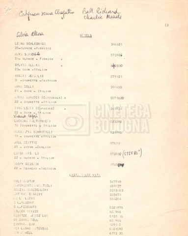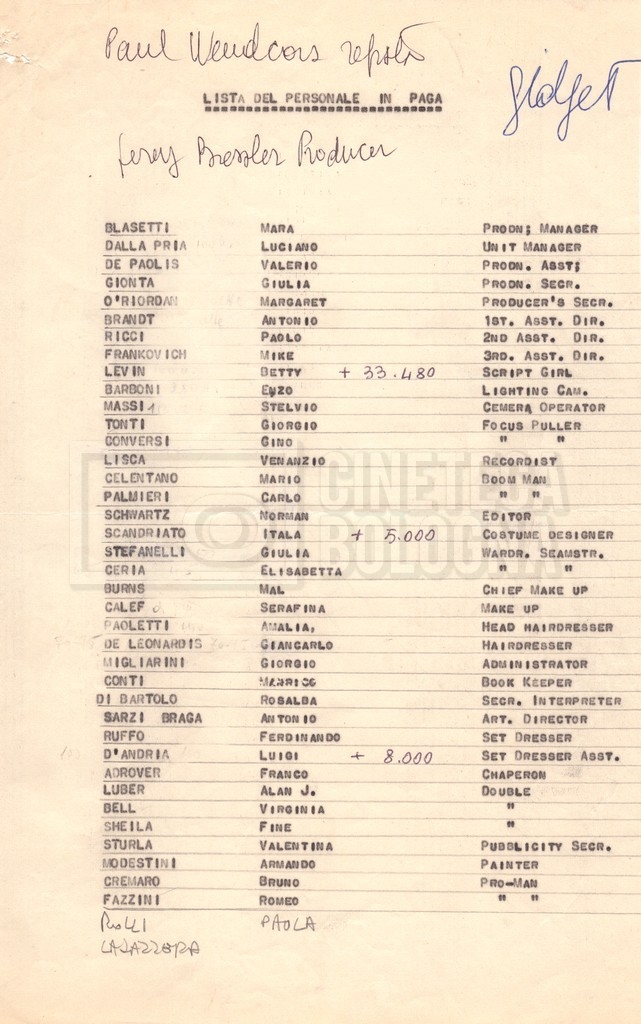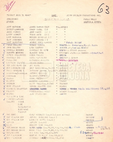 Torna alla banca dati “Cast e unit lists” Documento storico Fondo Mara Blasetti / “Film Mara girati” / Gidget Goes to Rome Ambiti e contenuto Contiene elenchi del cast artistico e tecnico, talvolta con l’indicazione dei recapiti. Informazioni archivistiche Cronologia: 1962 Numero di ordinamento definitivo: 1.9.1 Numero di ordinamento provvisorio: 4.1.A Descrizione fisica: fascicolo Immagini digitalizzate Informazioni sul film titolo originale: Gidget Goes to Rome altri titoli: Gidget a Roma regia: Wendkos, Paul anno: 1963 paese di produzione: Stati Uniti lingua principale: inglese altre lingue: italiana Documenti correlati Vai alla banca dati DOCUMENTO STORICO Gestione delle riprese e corrispondenza DOCUMENTO STORICO “Gidget Goes to Rome”