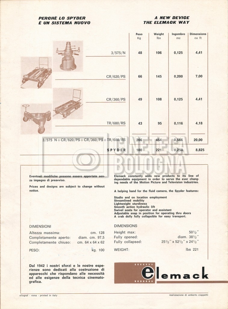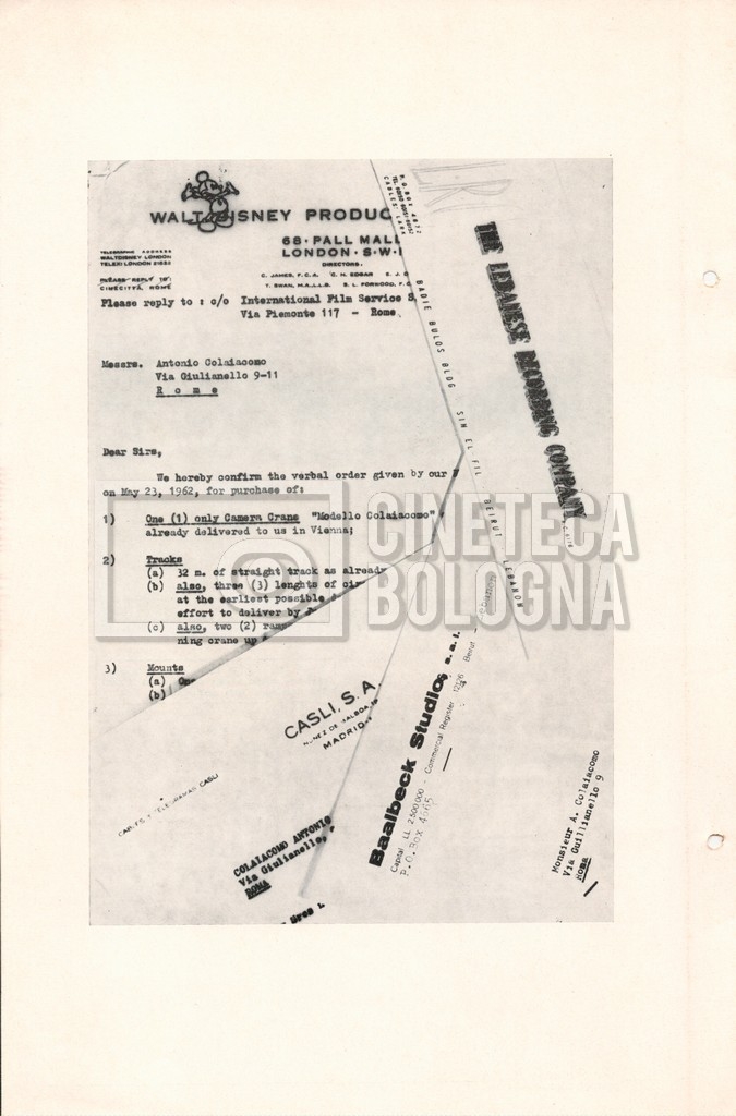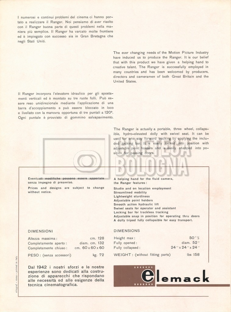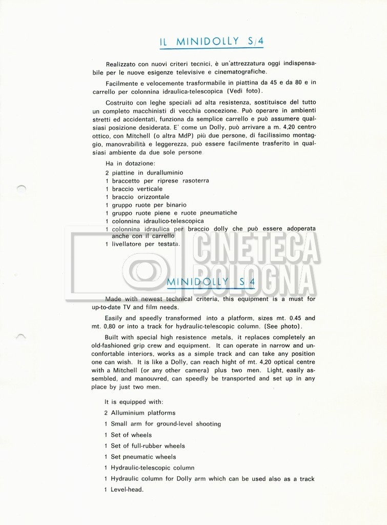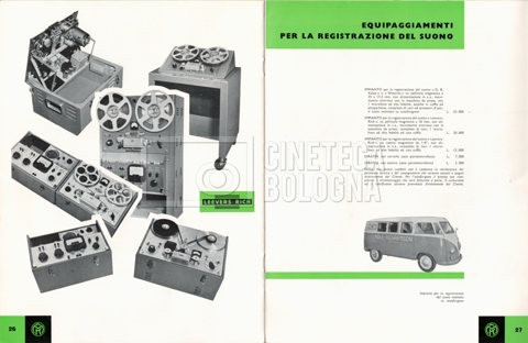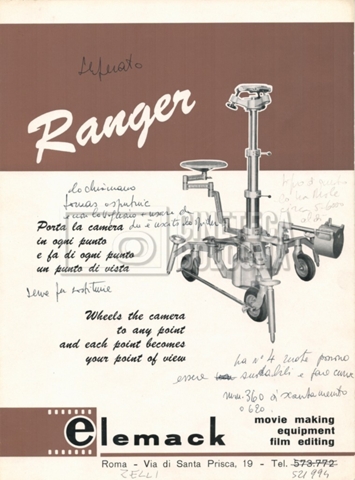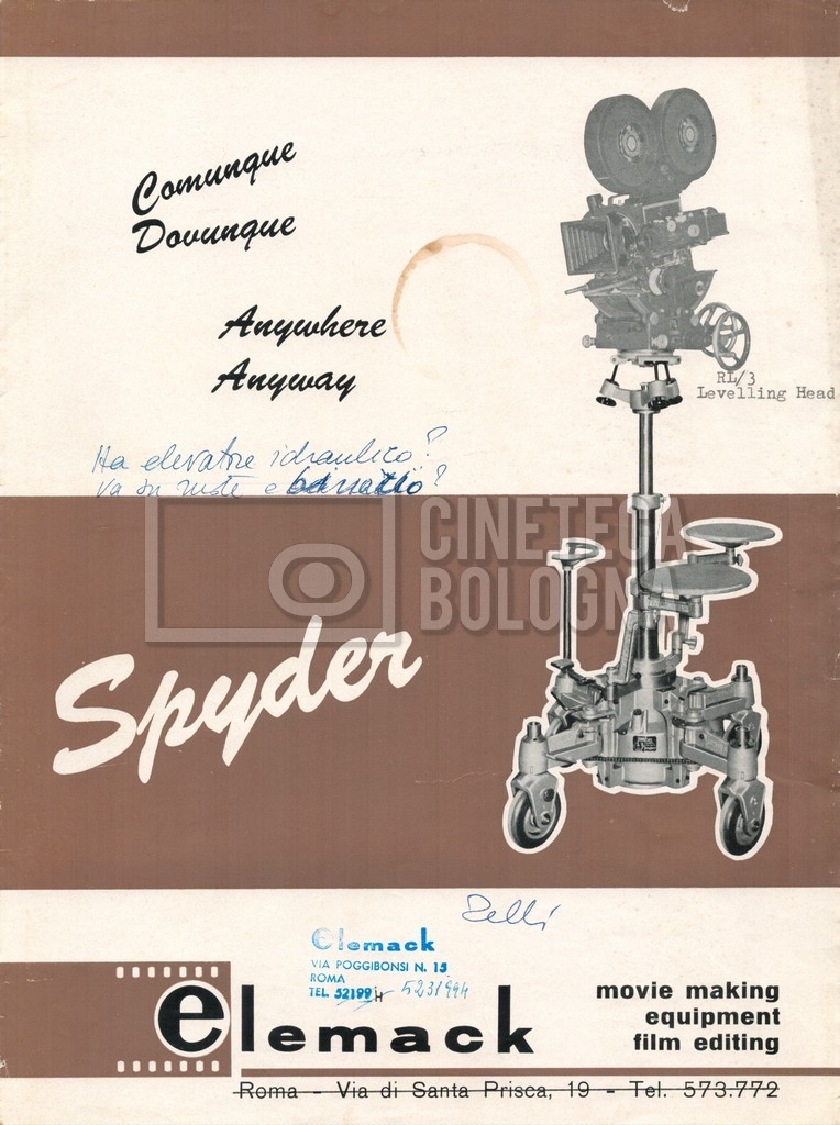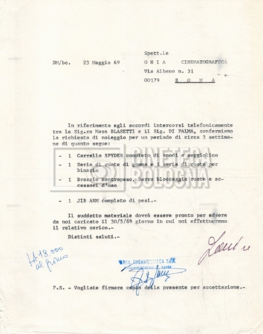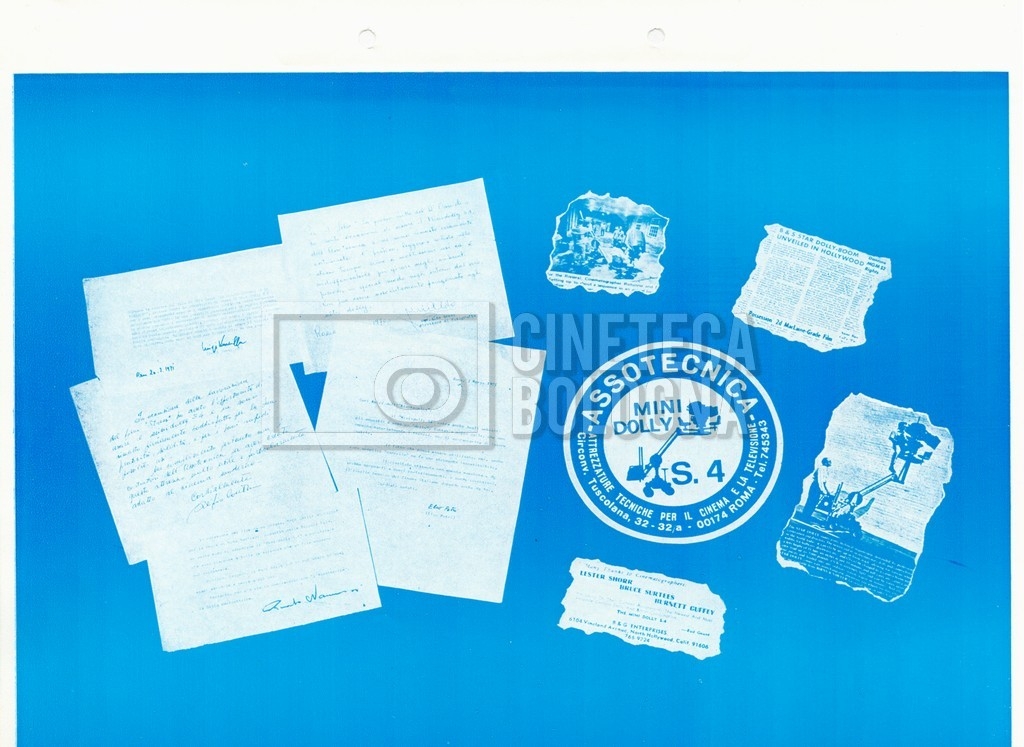 – Un catalogo delle attrezzature ‘Elemack’, con allegata una lettera della società ‘ONIA cinematografica’ di Roma, nella quale si conferma una richiesta di noleggio, voluta da Mara Blasetti (23 maggio 1969). Delle attrezzature in oggetto sono presenti quattro opuscoli.