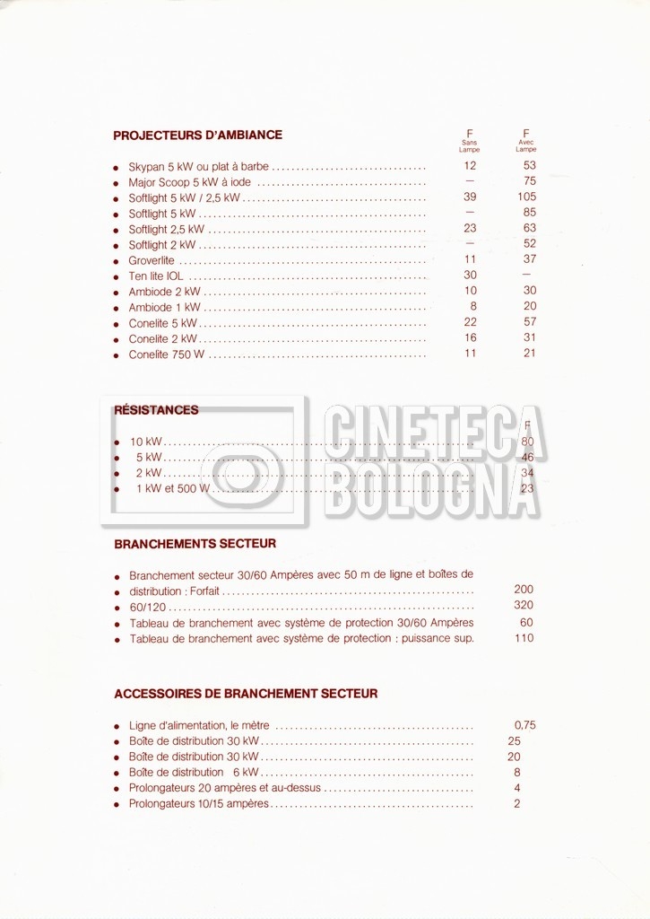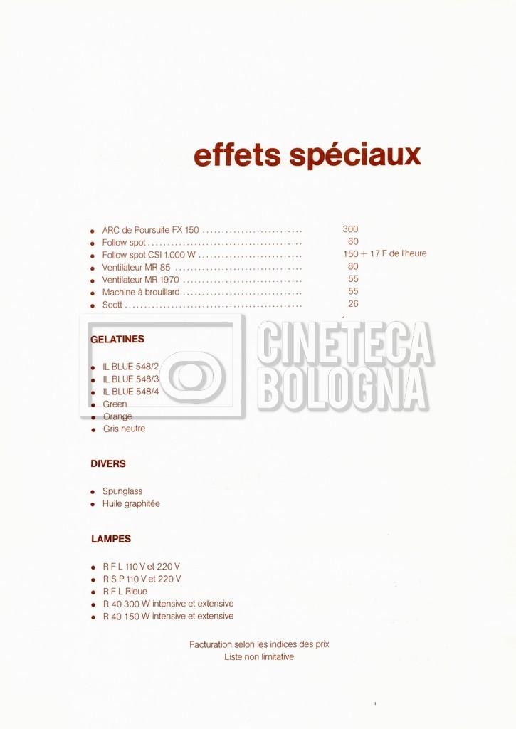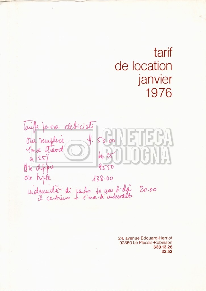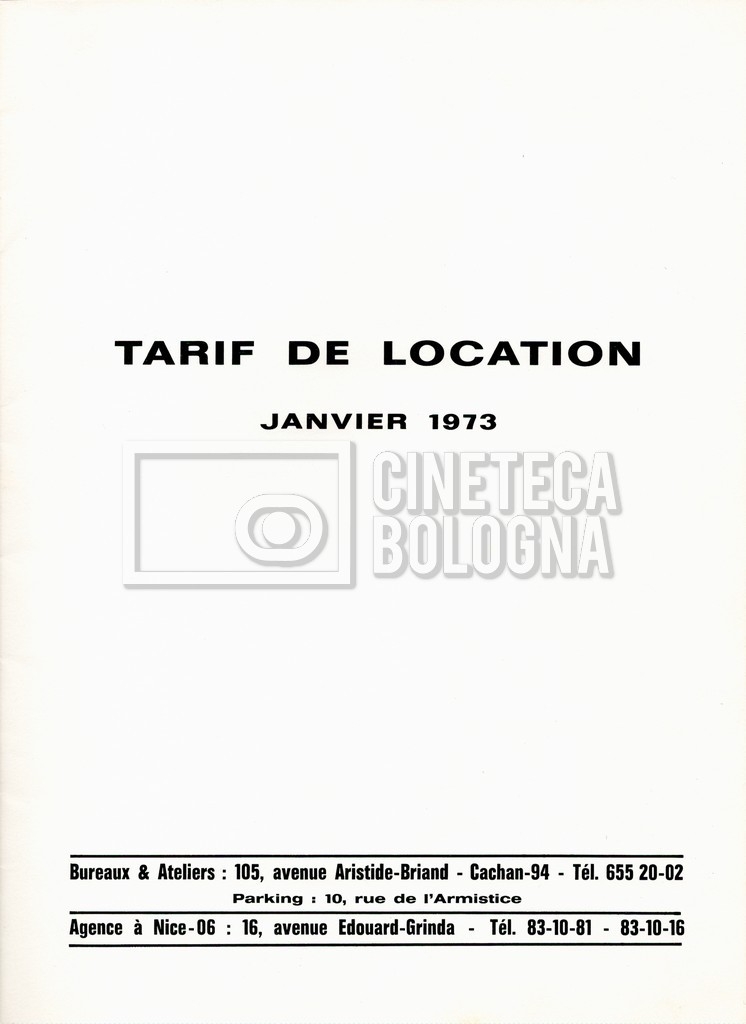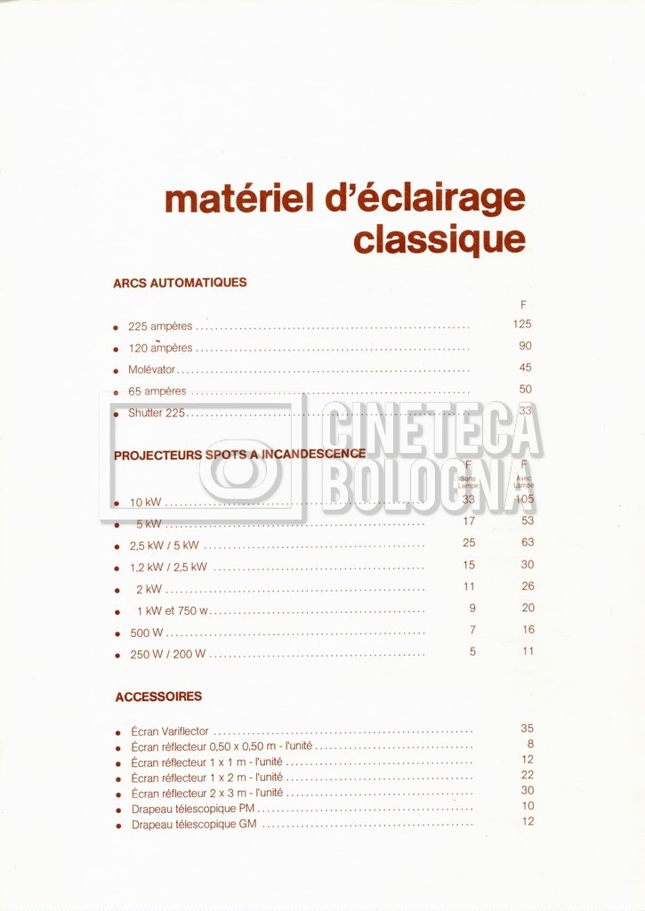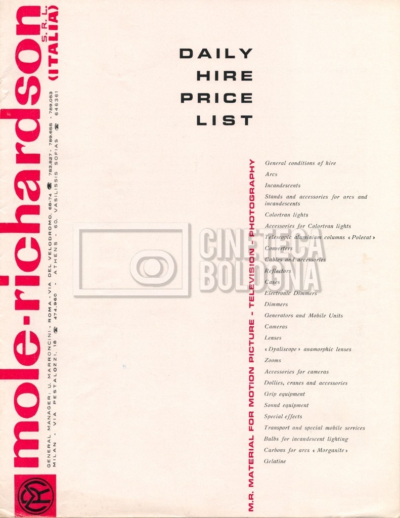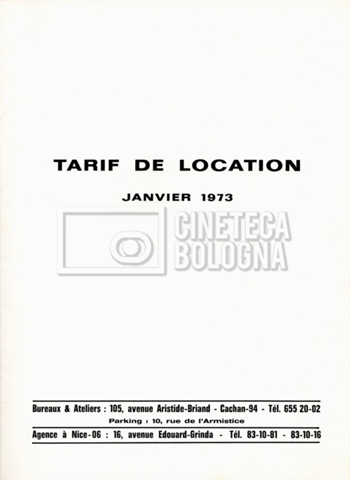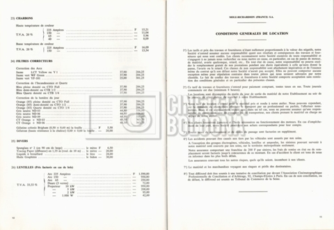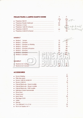 – Un tariffario per il noleggio di attrezzatura della ‘Mole-Richardson’ in Francia (gennaio 1973);