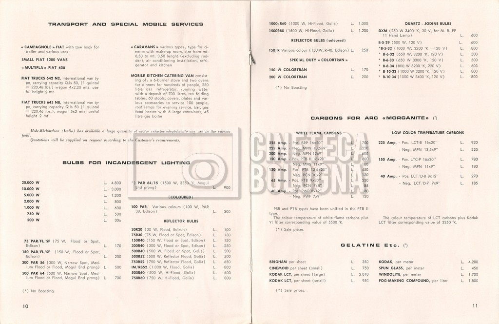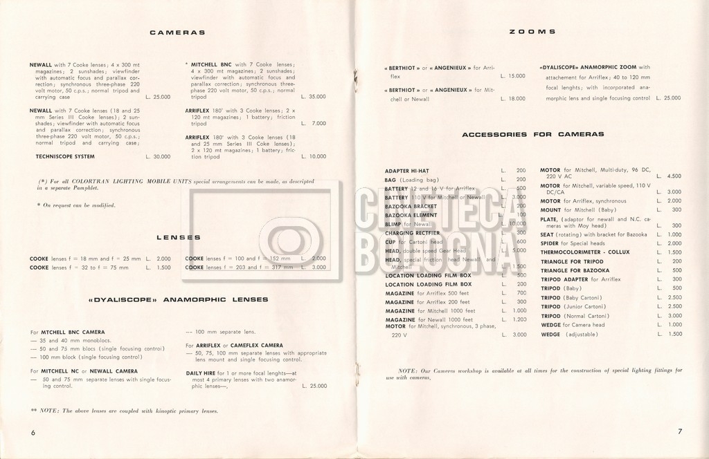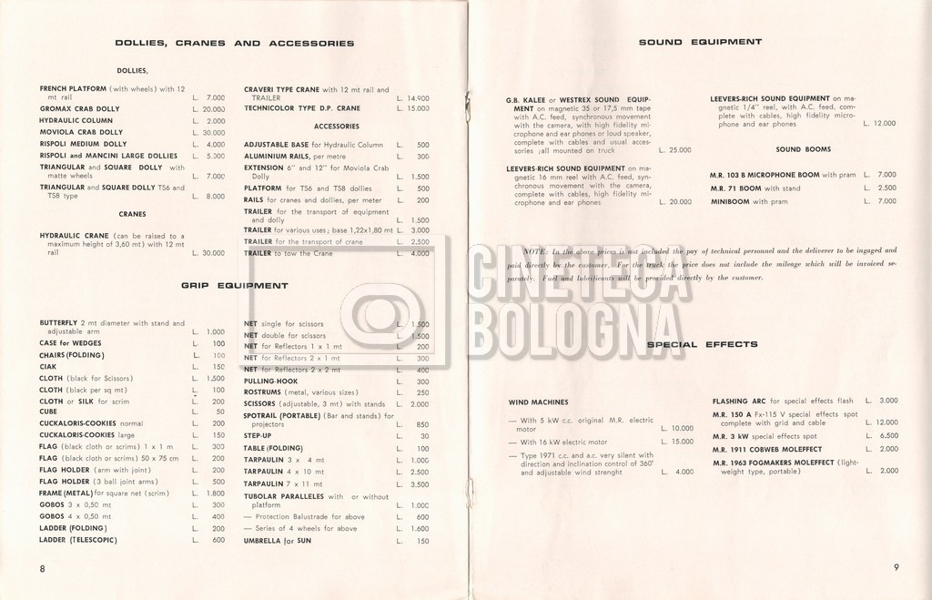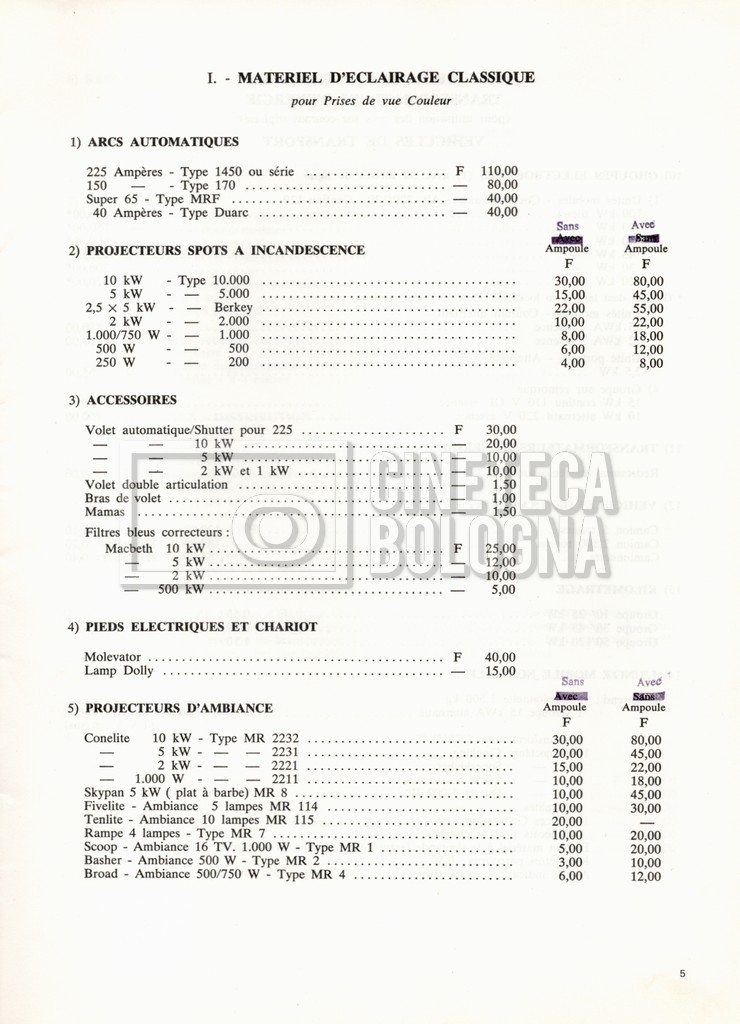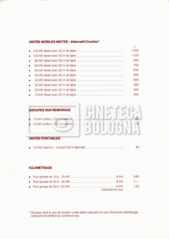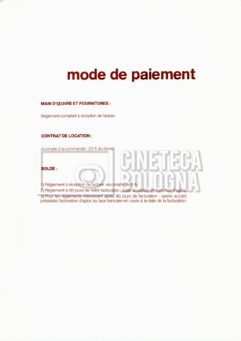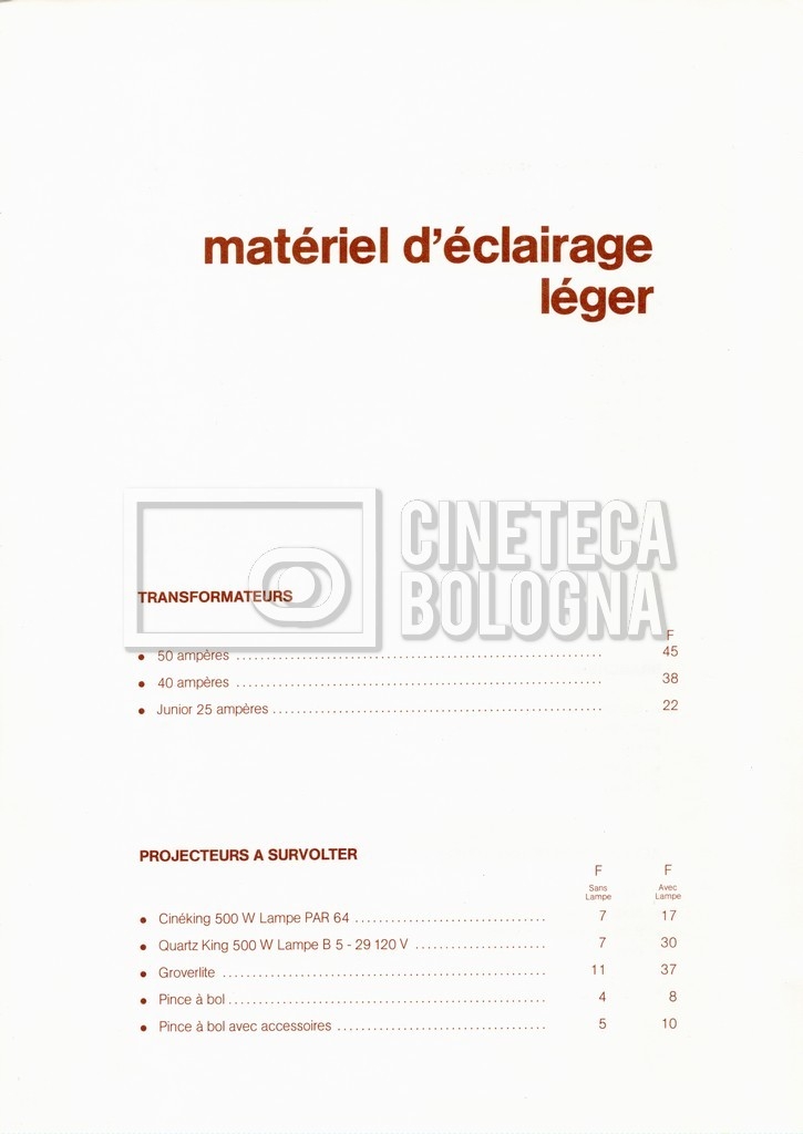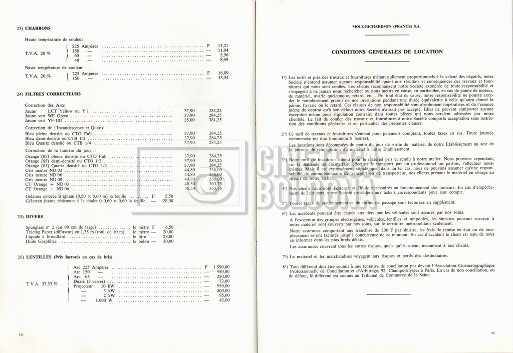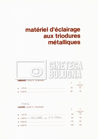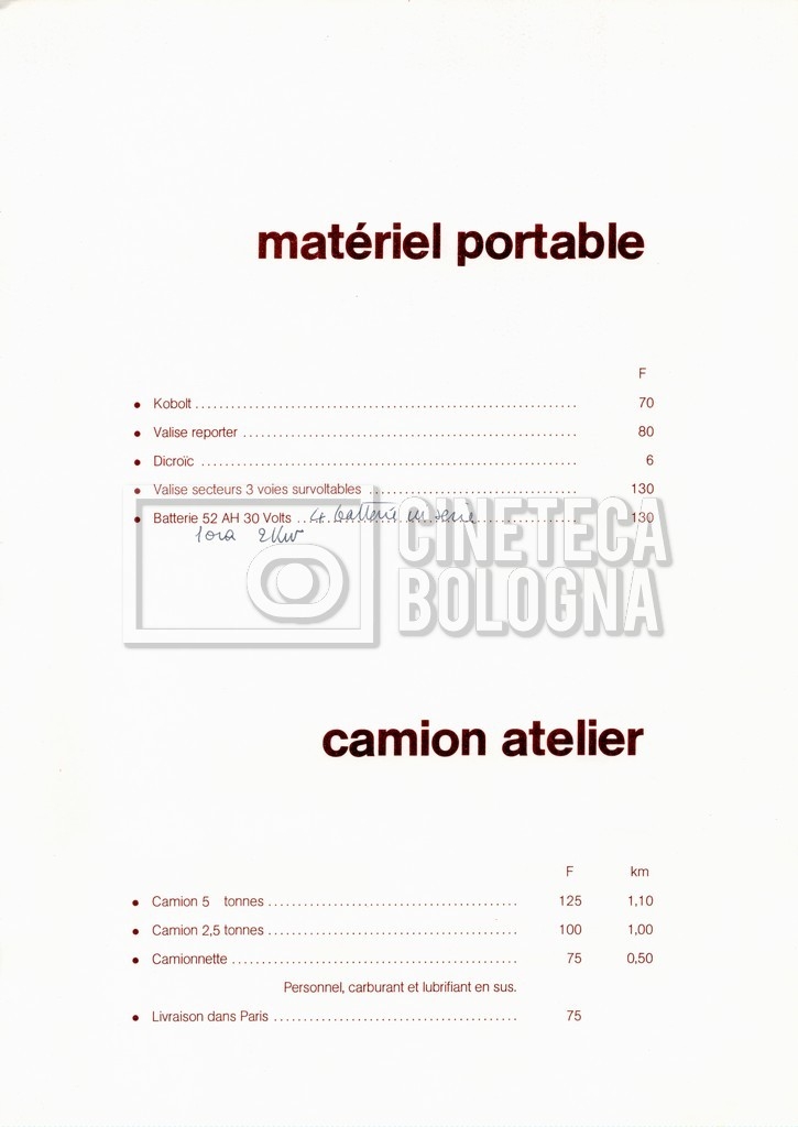 – Un tariffario per il noleggio di attrezzatura della ‘Mole-Richardson’ in Francia (gennaio 1973);