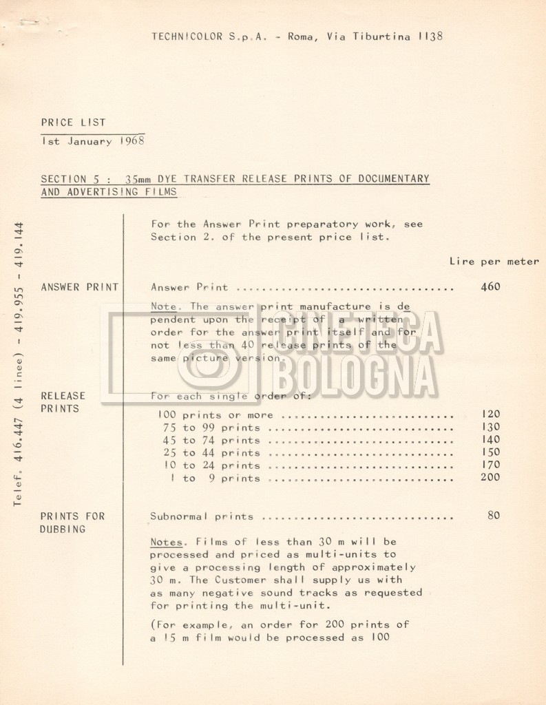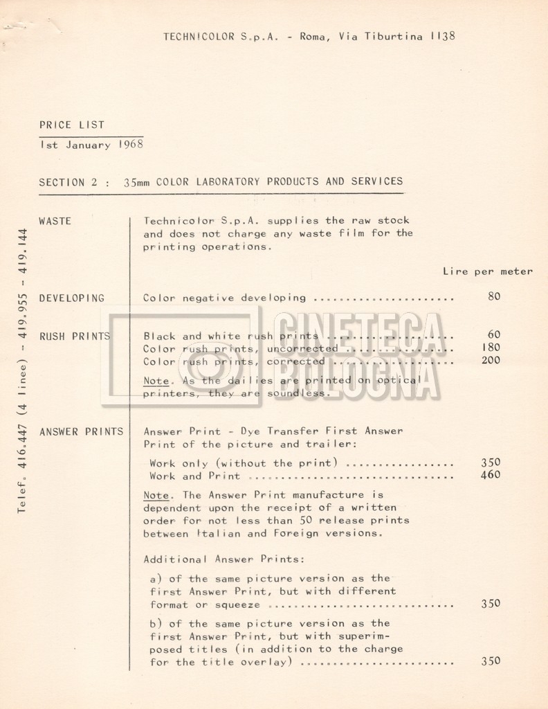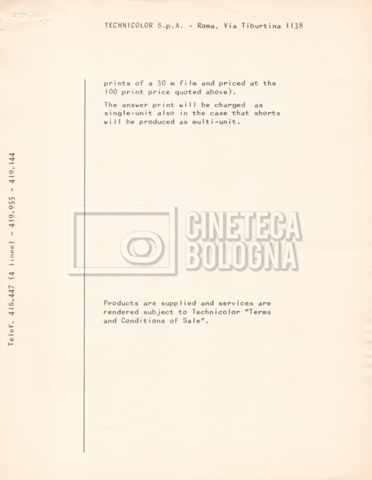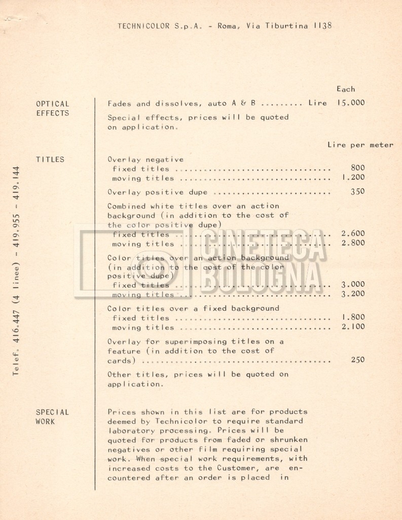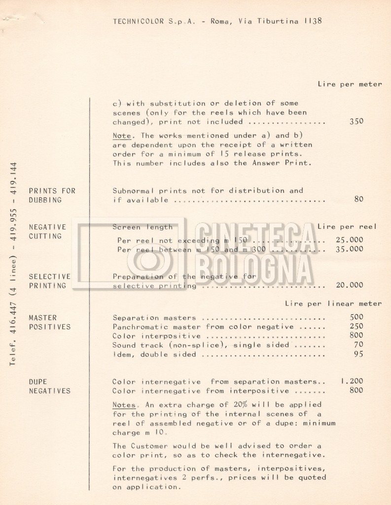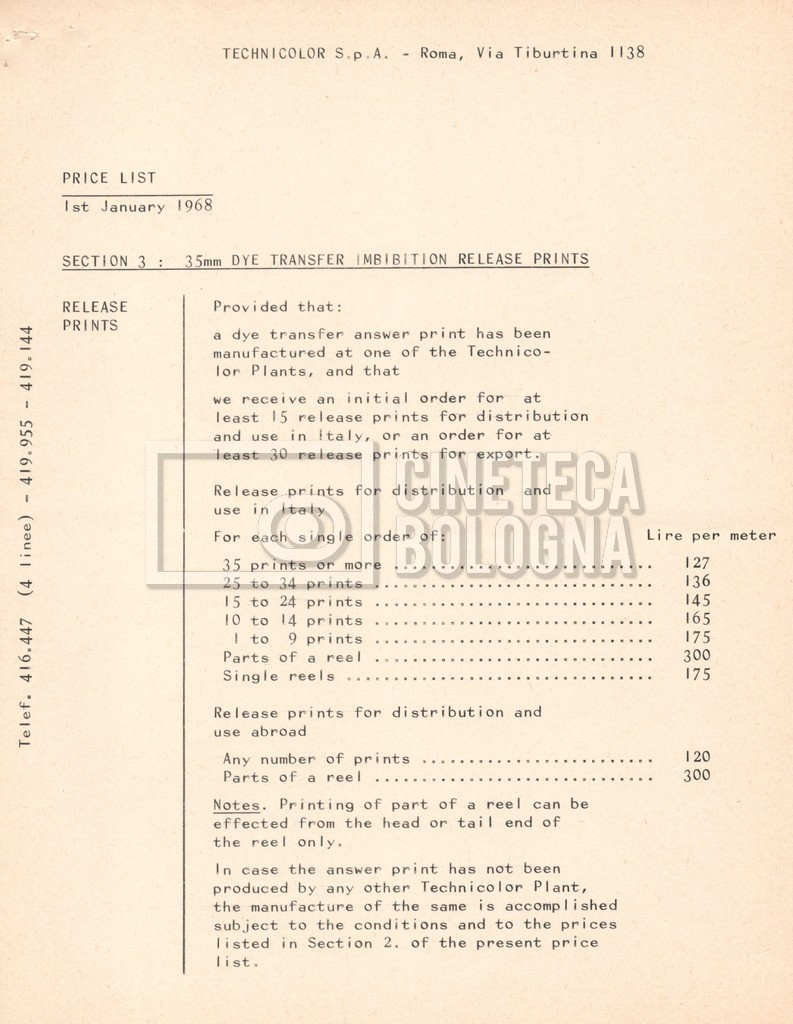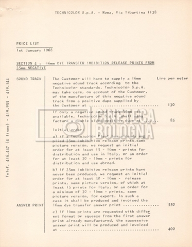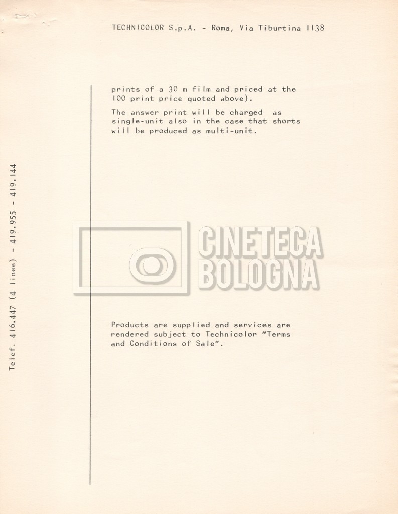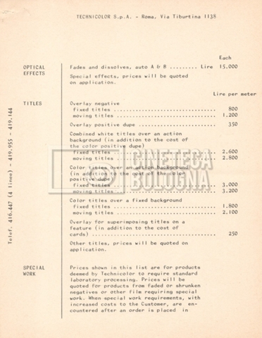 – Due listini prezzi per servizi di postproduzione e trattamento delle pellicole della società ‘Techincolor’, di cui uno in inglese (1 gennaio 1968) e uno in italiano (1 giugno 1970).