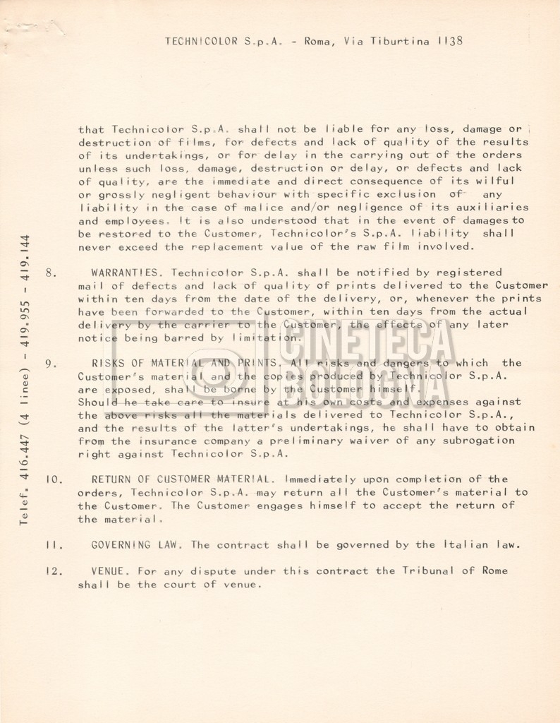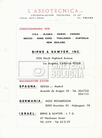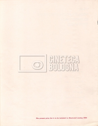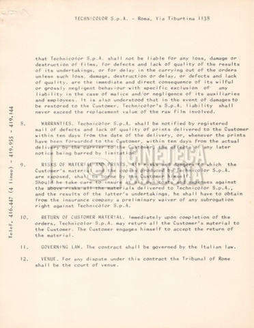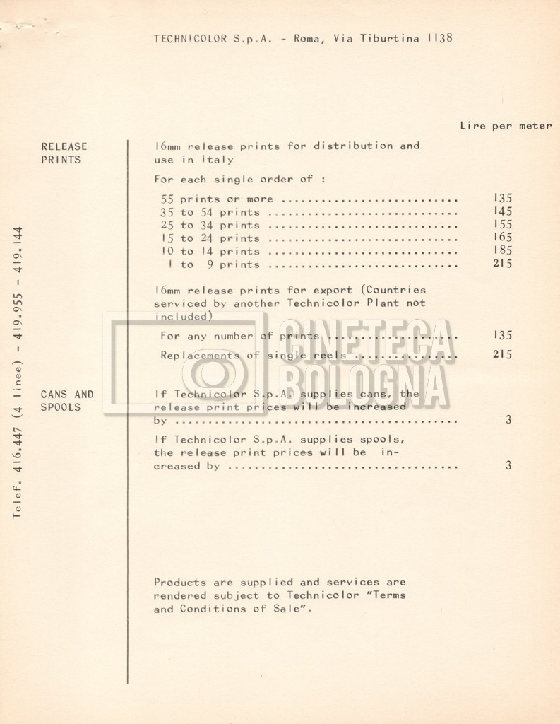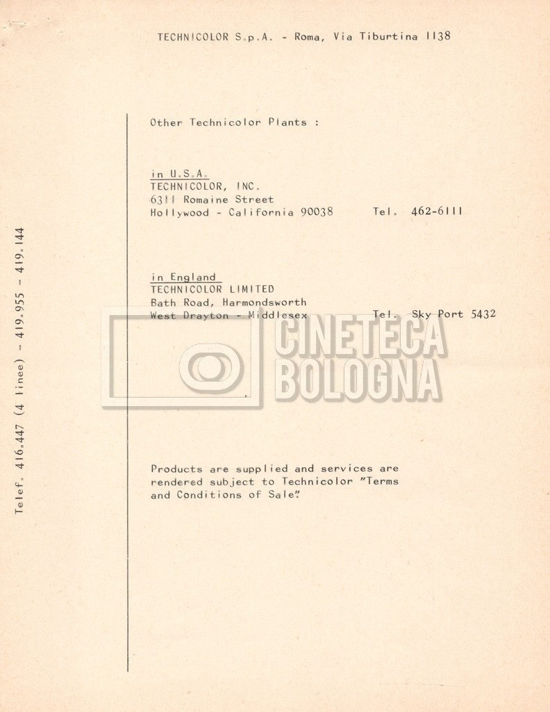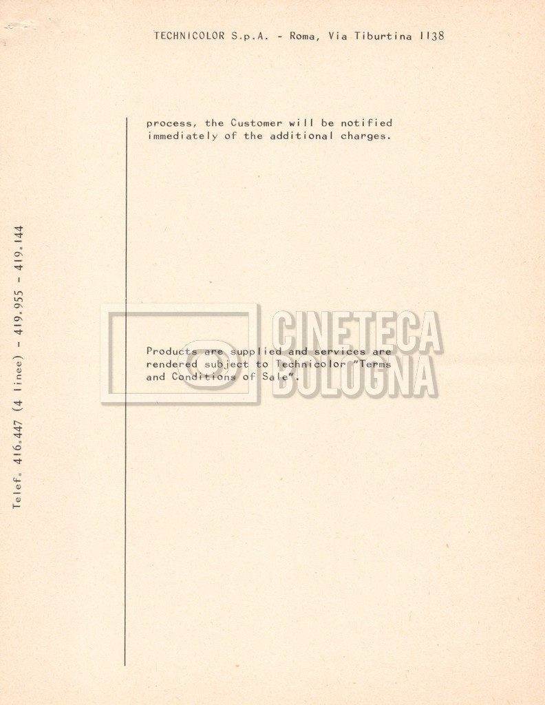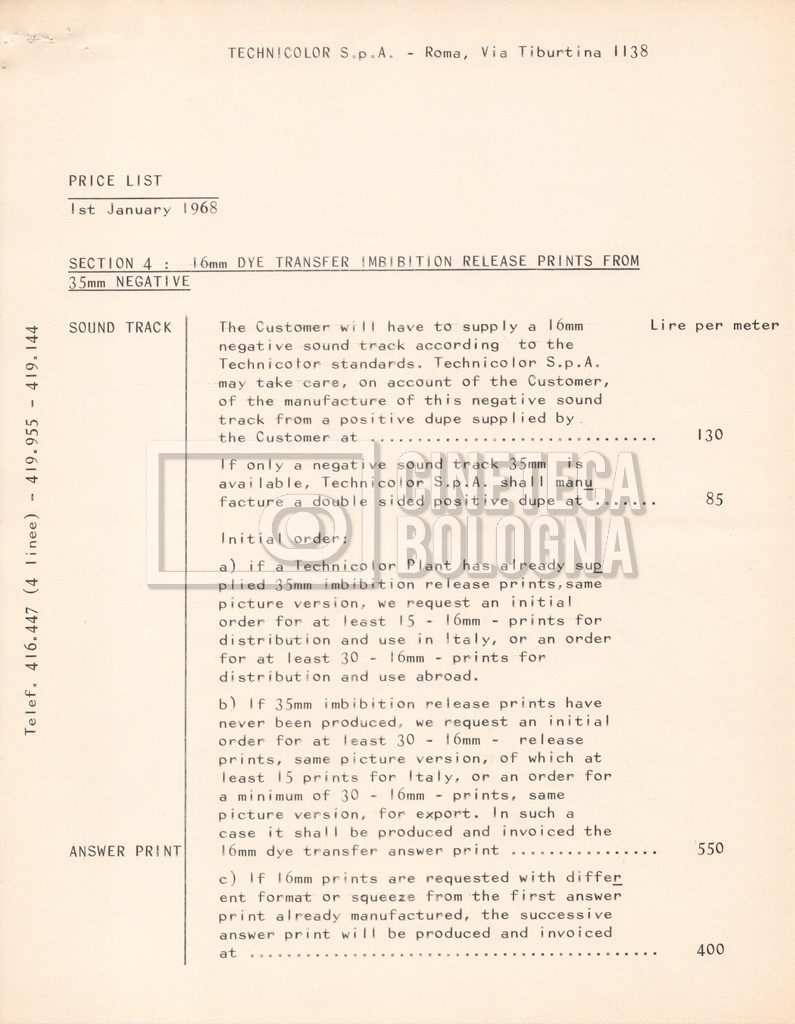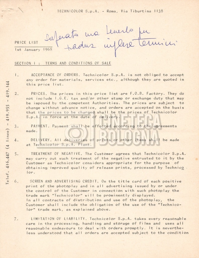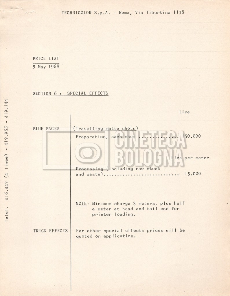 – Due listini prezzi per servizi di postproduzione e trattamento delle pellicole della società ‘Techincolor’, di cui uno in inglese (1 gennaio 1968) e uno in italiano (1 giugno 1970).