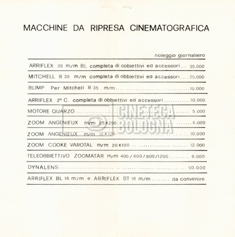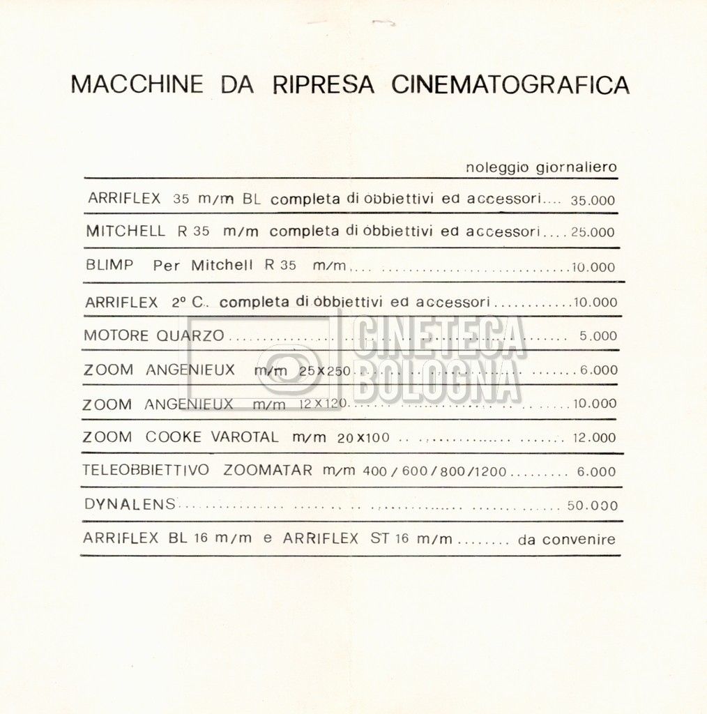 – Un tariffario per il noleggio di attrezzatura della società ‘Cinenoleggio’ (1982);