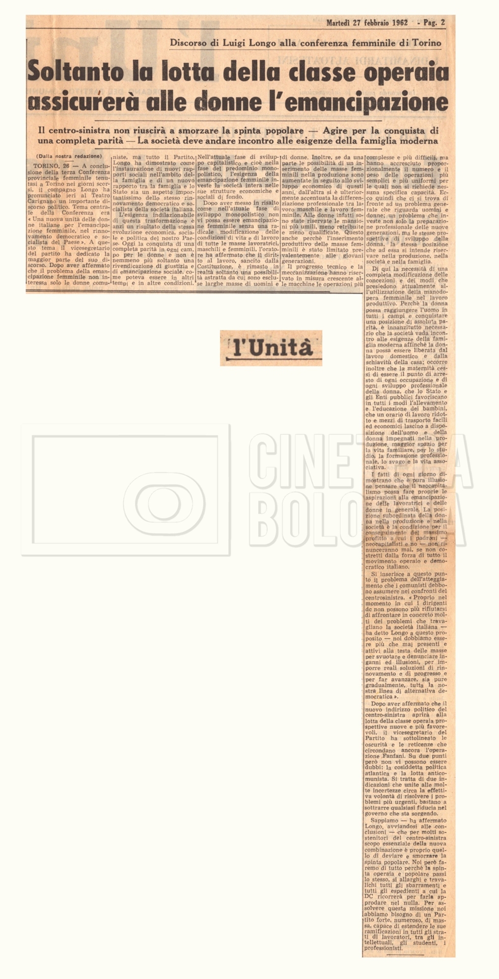 – Un articolo dal titolo “Soltanto la lotta della classe operaia assicurerà alle donne l’emancipazione” (“L’Unità”, 27 febbraio 1962);