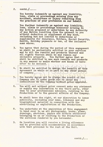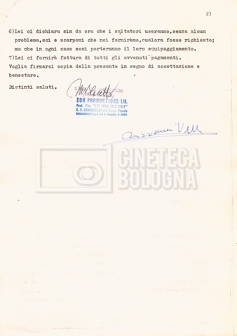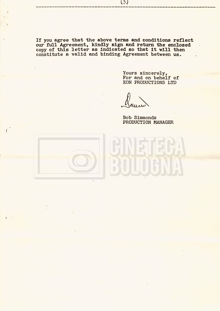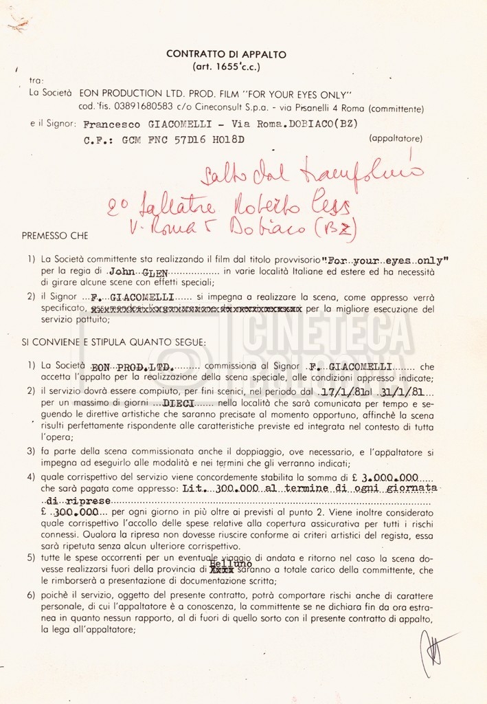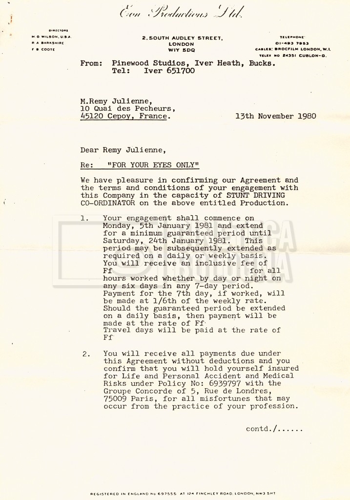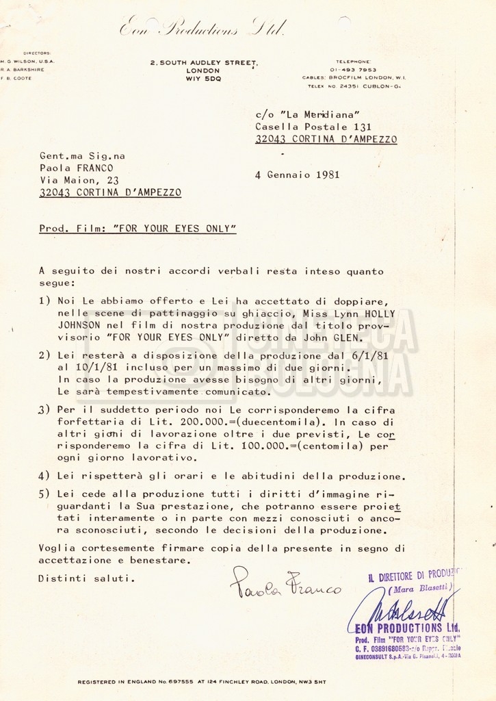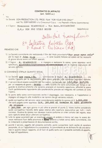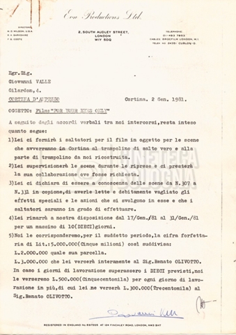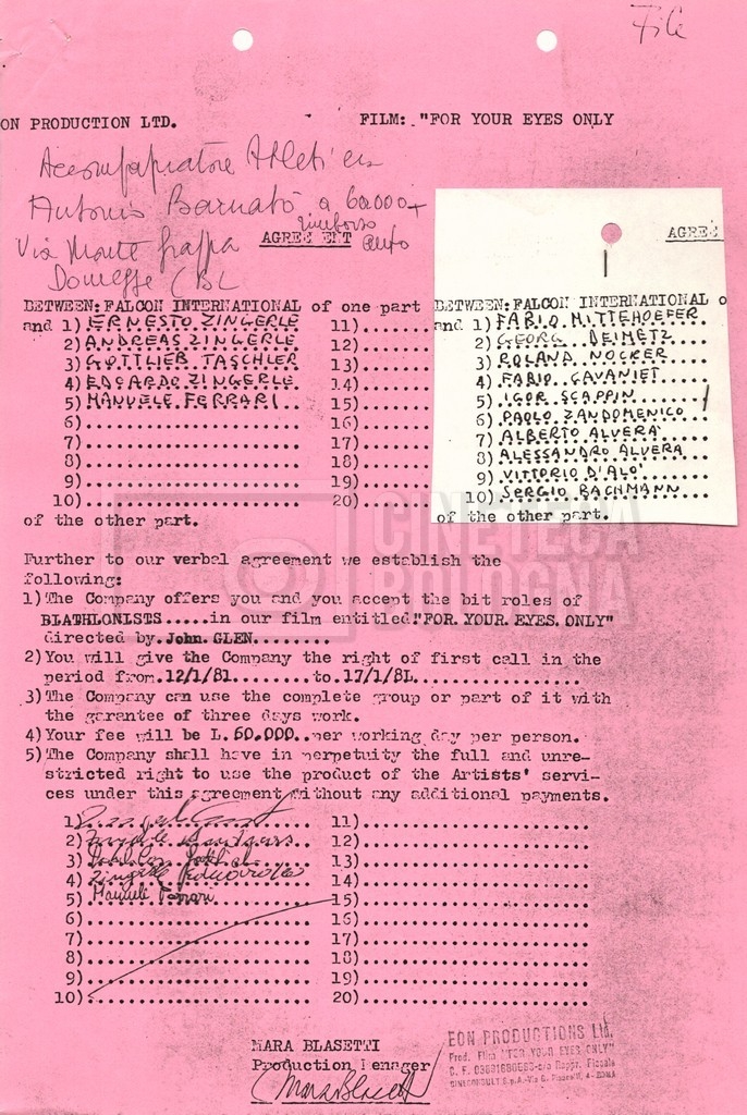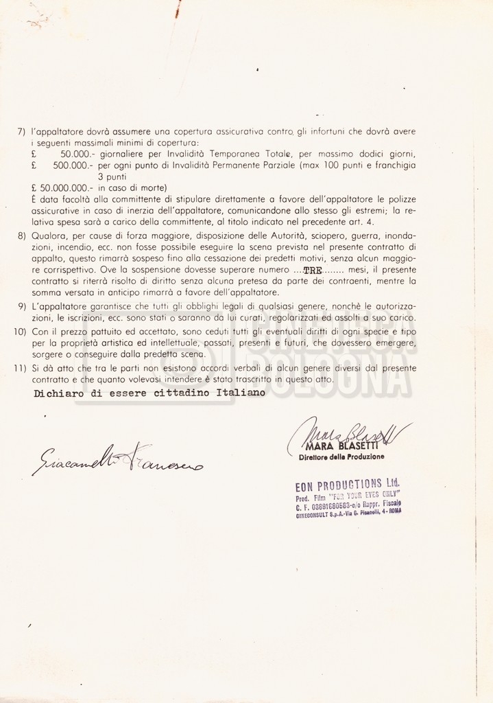 – Una lettera inviata a Mara Blasetti da Tom Pevser, della ‘Eon production’, con allegati copie dei contratti dello stuntman Rémy Julienne (10 giugno 1981);