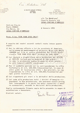 - Una lettera inviata a Mara Blasetti da Tom Pevser, della 'Eon production', con allegati copie dei contratti dello stuntman Rémy Julienne (10 giugno 1981);