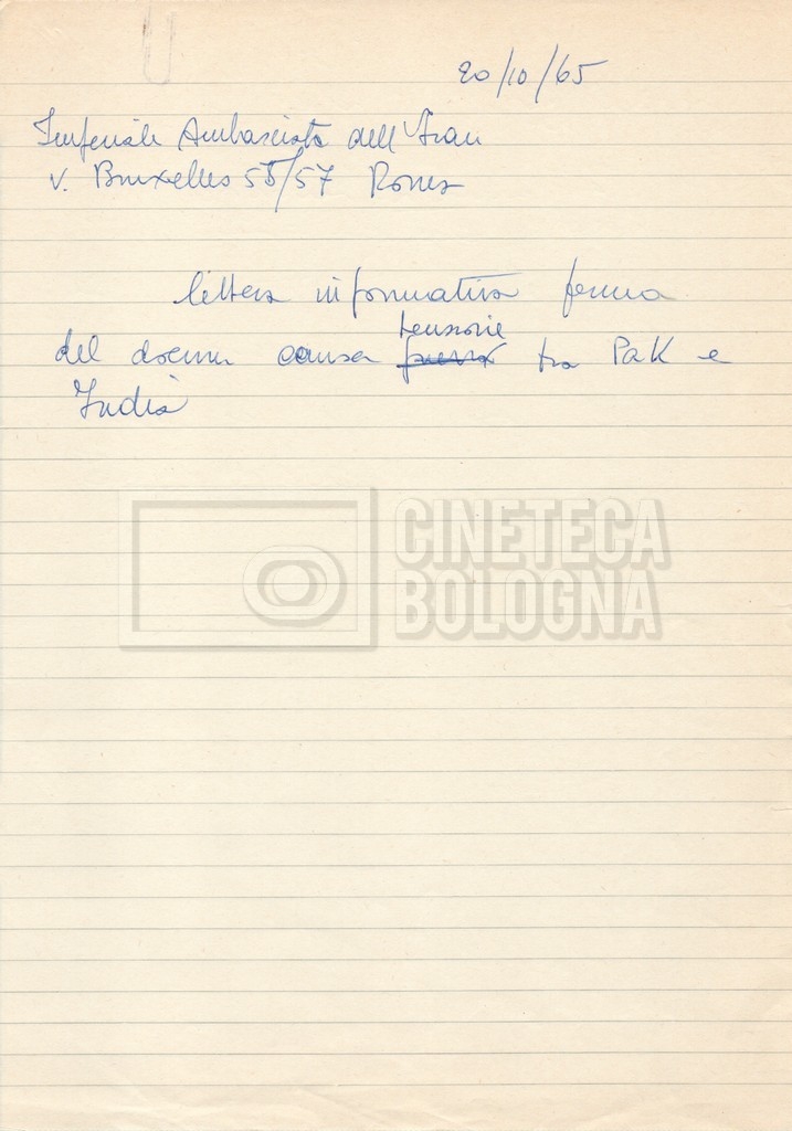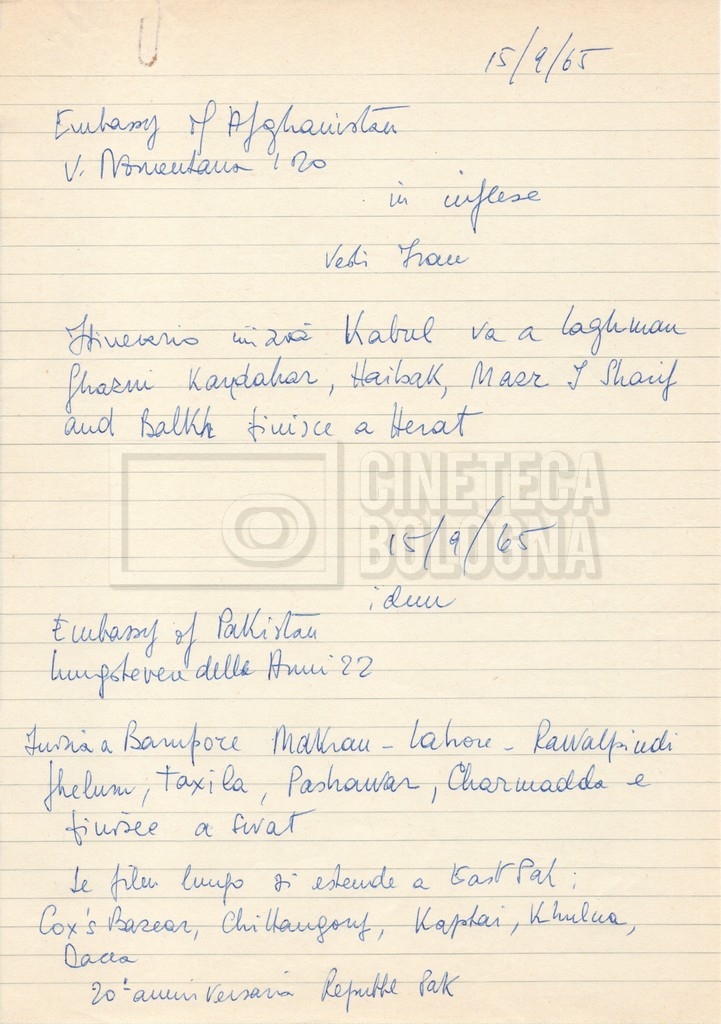 – Carteggio con le ambasciate di Iran, Pakistan e Afghanistan riguardante le autorizzazioni a girare nei rispettivi paesi (15 – 30 settembre 1965);