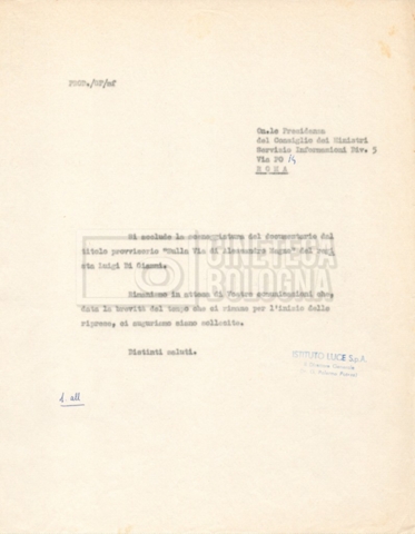 Contiene corrispondenza in copia, in entrata e in uscita, tra l”Istituto Luce’ e diversi enti e società, relativa alla realizzazione del documentario, in particolare si segnalano: