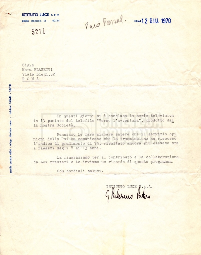 – Carteggio tra Mara Blasetti e il dottor Palermo Patera, direttore generale dell”Istituto Luce’, riguardante la breve partecipazione di Mara Blasetti alla produzione della serie TV Verso l’Avventura (12 e 17 giugno 1970);