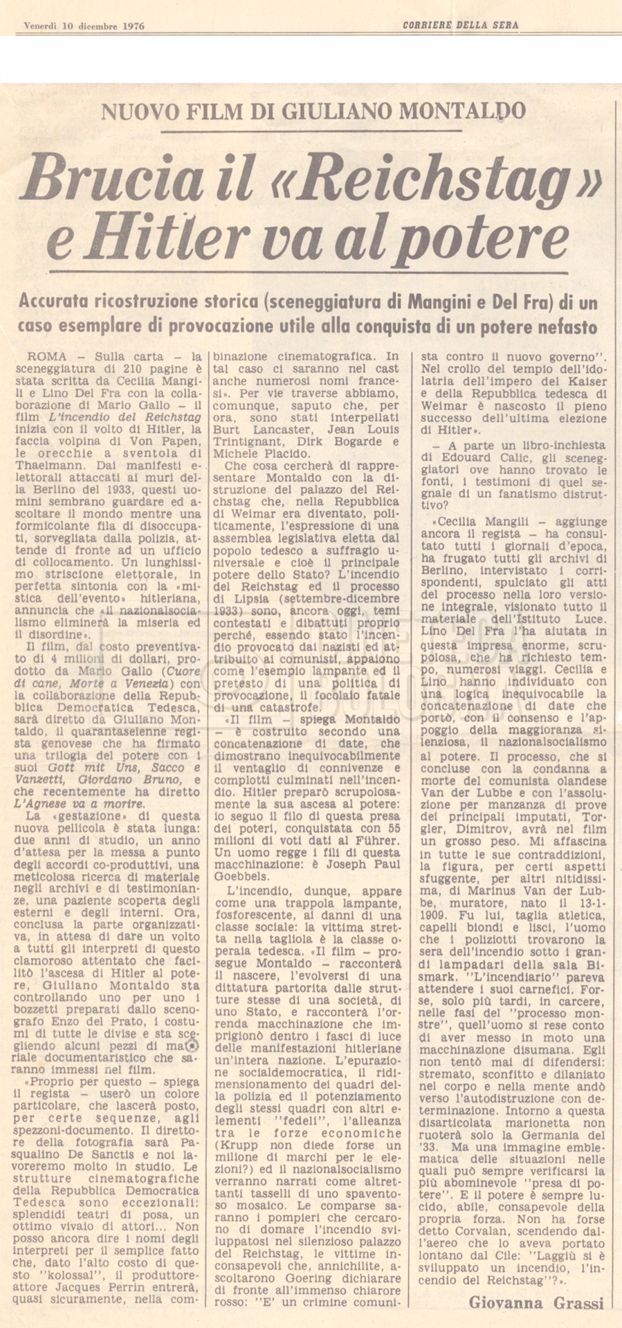 – Un articolo sulla fase preparatoria del film, con un intervento del regista Giuliano Montaldo (“Corriere della Sera”, dicembre 1976).