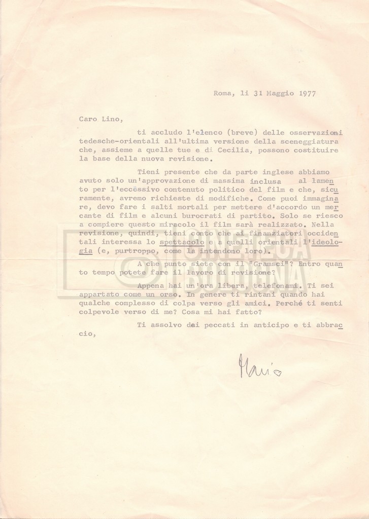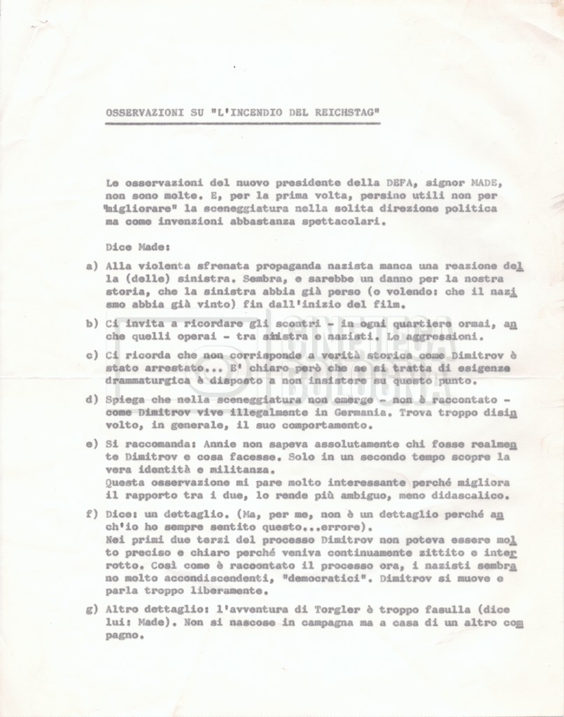 – Una lettera di Mario Gallo a Lino Del Fra in merito alle modifiche da apportare alla sceneggiatura, con allegato un elenco delle osservazioni da parte del presidente della ‘DEFA’, coinvolta nel progetto;
