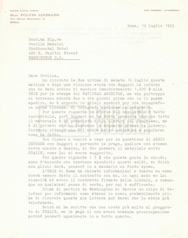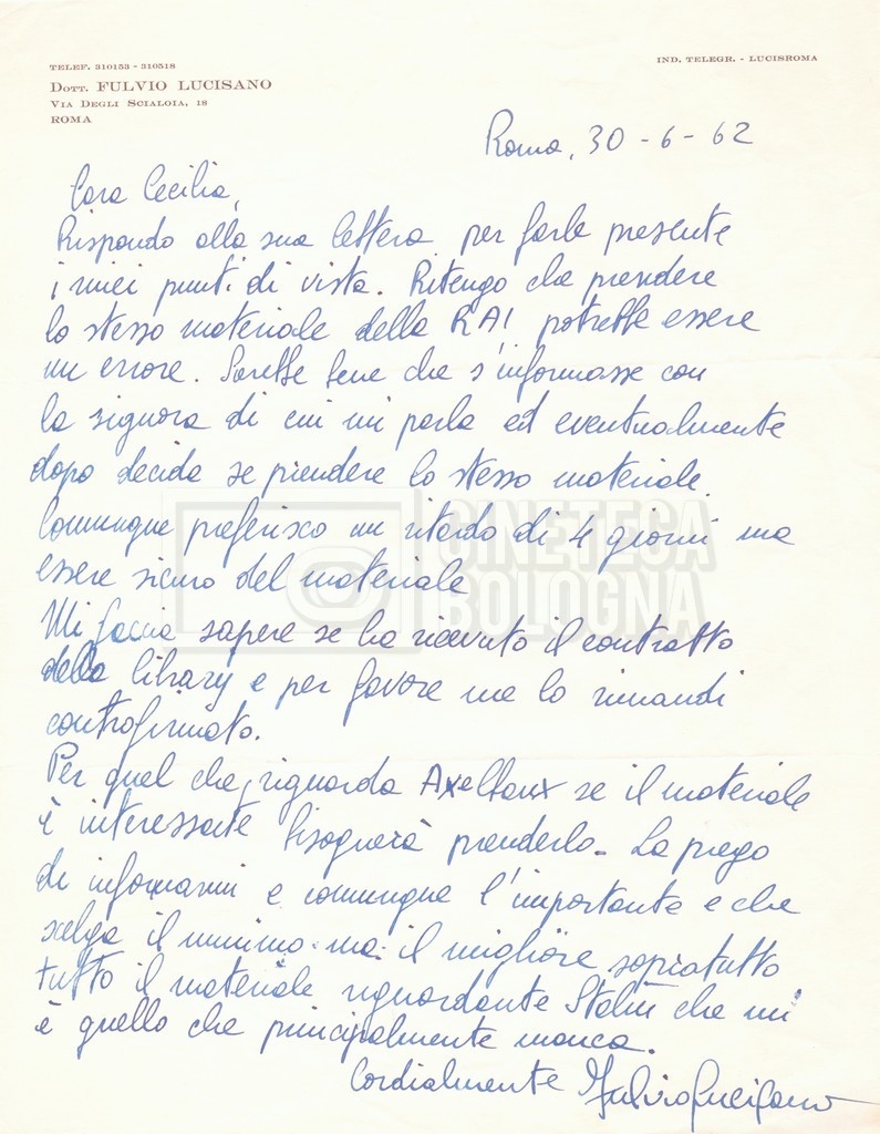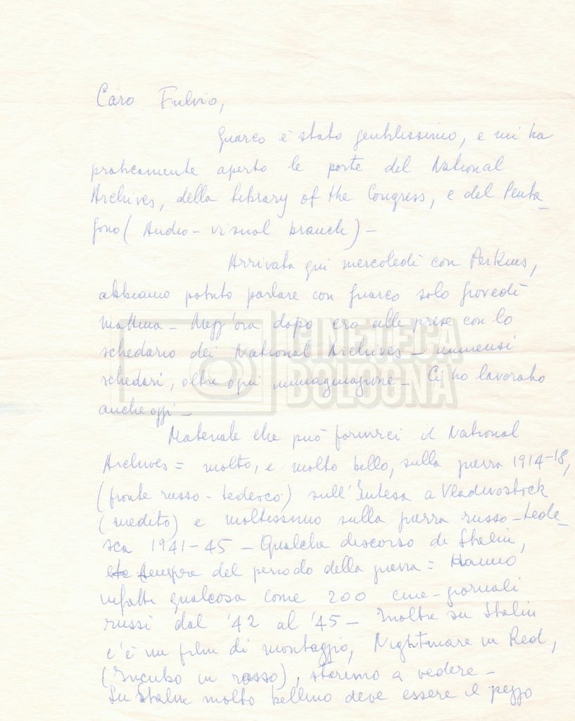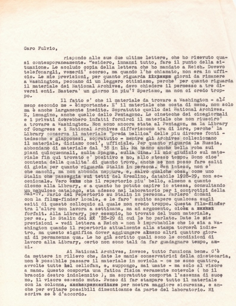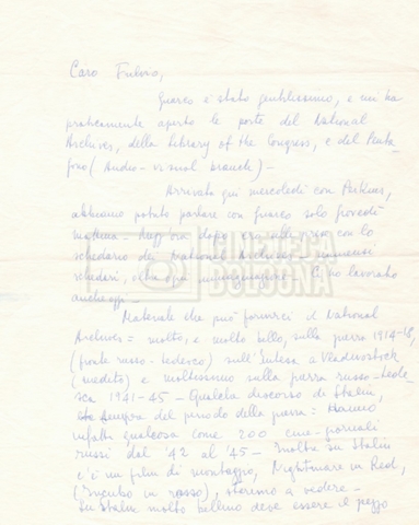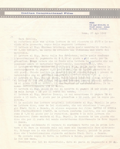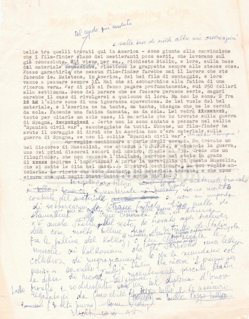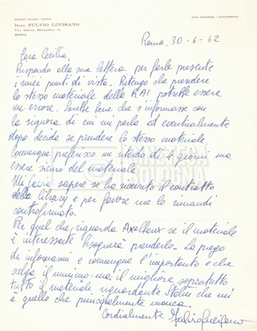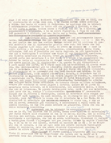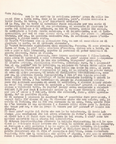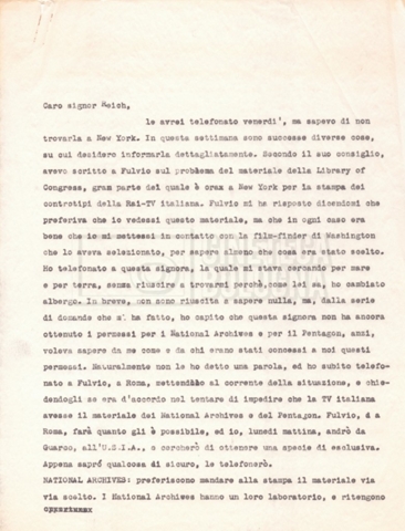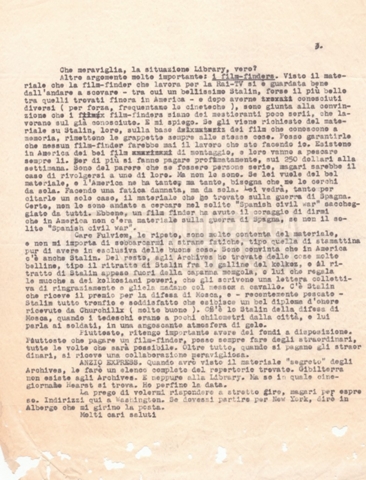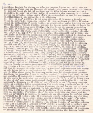 Torna alla banca dati “Corrispondenza Lucisano – Mangini (USA e Inghilterra)” Documento storico Fondo Cecilia Mangini – Lino Del Fra / “Collaborazioni con altri” / “Processo a Stalin” Ambiti e contenuto Contiene corrispondenza riguardante la ricerca e la consultazione dei materiali di studio. Informazioni archivistiche Cronologia: 28 maggio 1962 – 04 gennaio 1963 Numero di ordinamento definitivo: 10.3.11 Numero di ordinamento provvisorio: 59.08 Descrizione fisica: fascicolo Immagini digitalizzate Documenti correlati Vai alla banca dati DOCUMENTO STORICO “Franco Fortini; ‘Stalin’; le varie stesure del testo di Fortini; fotocopie; gli originali sono alla fondazione Fortini a Siena” DOCUMENTO STORICO “Rassegna stampa; la preparazione; Del Fra, Mangini e Fortini ritirano la firma; le recensioni; lettera al Nouvel Observateur” DOCUMENTO STORICO Storia della realizzazione del film DOCUMENTO STORICO “Presentazione di ‘Stalin’ (anche nella lettera a Pennacchi)” DOCUMENTO STORICO “Lettera pre-contratto da Lucisano a Del Fra” DOCUMENTO STORICO “Lettera a noi di Fortini, dopo il primo incontro per il testo; risposta di Lino” DOCUMENTO STORICO “Telegrammi di Fortini (gli originali a Siena). L’originale è stato ritrovato poco tempo fa dentro un libro” DOCUMENTO STORICO “Lettera di Del Fra a Deutscher; lettera di Fortini a Del Fra; lettera di Deutscher a Del Fra; lettera di Del Fra a Mangini per tentativo Deutscher” DOCUMENTO STORICO “Lettere di Lino Del Fra a Cecilia Mangini (in ‘United States of America’ e in Inghilterra)” DOCUMENTO STORICO “Telegramma a Nikita Krutshev” DOCUMENTO STORICO “Dichiarazione di Natalia Sedova” DOCUMENTO STORICO “Testo con correzioni di Lucisano” DOCUMENTO STORICO Materiale preparatorio e appunti DOCUMENTO STORICO “Corrispondenza Fortini; Rottura con Lucisano; Lettera di Trockji accolto come esule in Messico” DOCUMENTO STORICO “Conti USA e GB” DOCUMENTO STORICO Corrispondenza tra Cecilia Mangini e Lino Del Fra DOCUMENTO STORICO Appunti e rassegna stampa DOCUMENTO STORICO Rassegna stampa