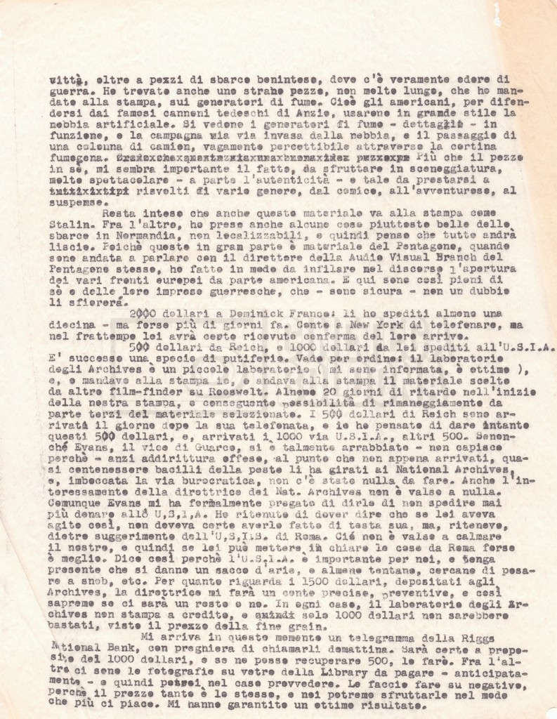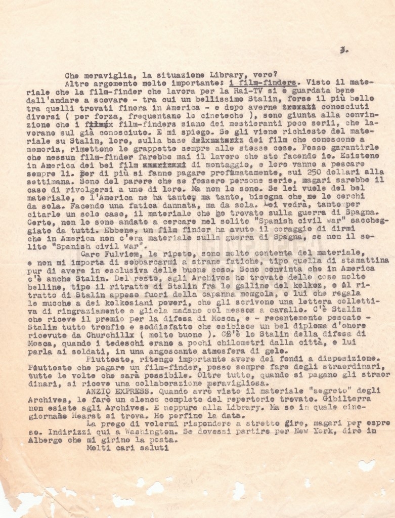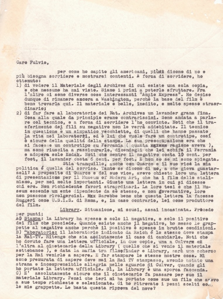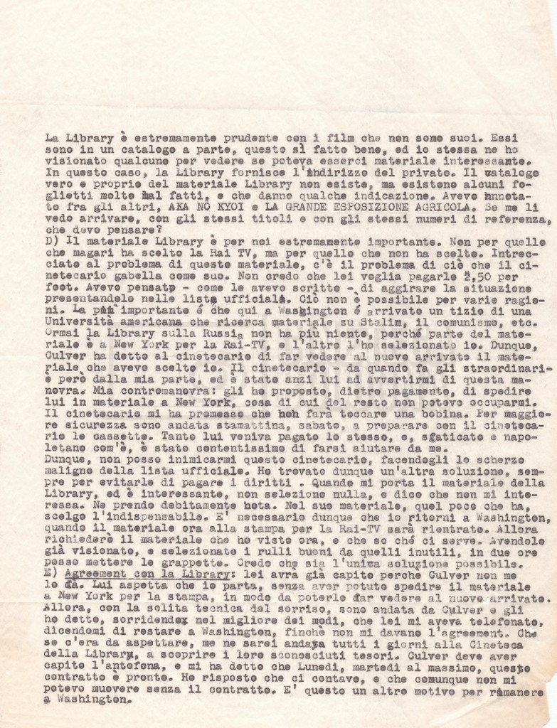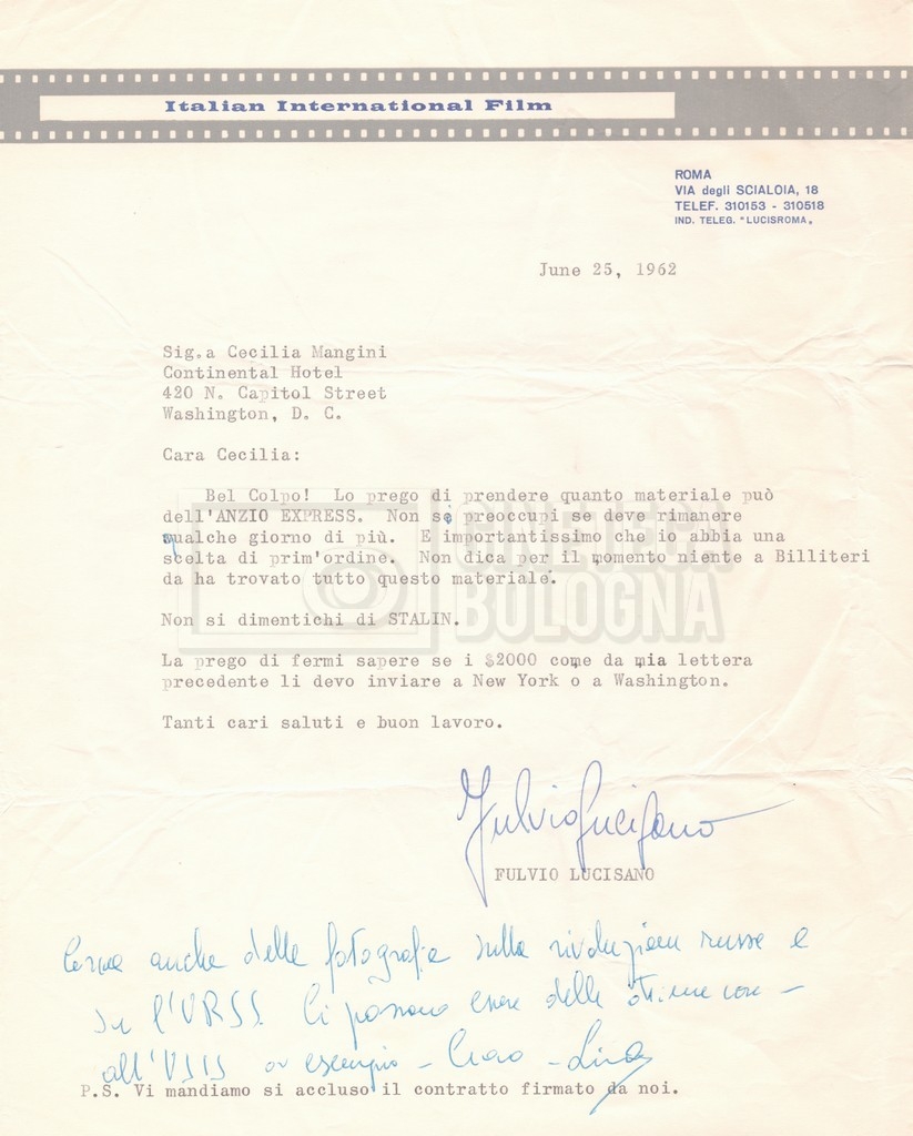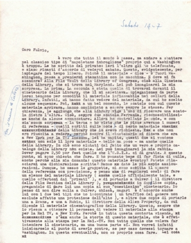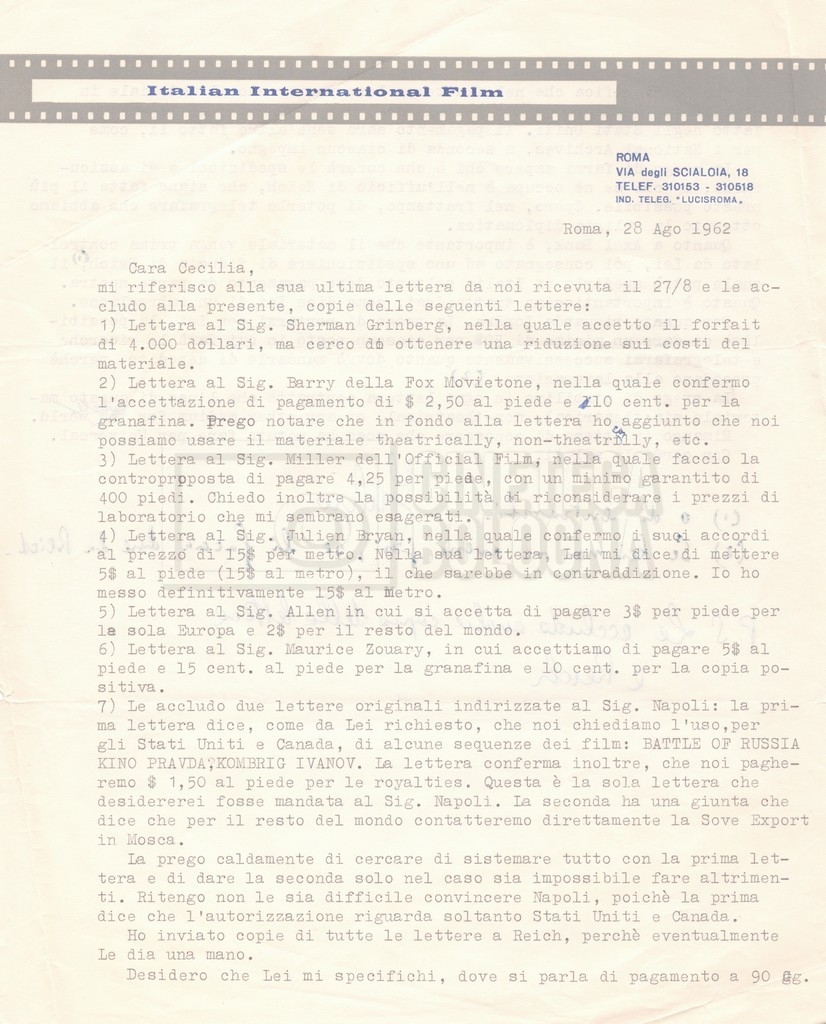 Torna alla banca dati “Corrispondenza Lucisano – Mangini (USA e Inghilterra)” Documento storico Fondo Cecilia Mangini – Lino Del Fra / “Collaborazioni con altri” / “Processo a Stalin” Ambiti e contenuto Contiene corrispondenza riguardante la ricerca e la consultazione dei materiali di studio. Informazioni archivistiche Cronologia: 28 maggio 1962 – 04 gennaio 1963 Numero di ordinamento definitivo: 10.3.11 Numero di ordinamento provvisorio: 59.08 Descrizione fisica: fascicolo Immagini digitalizzate Documenti correlati Vai alla banca dati DOCUMENTO STORICO “Franco Fortini; ‘Stalin’; le varie stesure del testo di Fortini; fotocopie; gli originali sono alla fondazione Fortini a Siena” DOCUMENTO STORICO “Rassegna stampa; la preparazione; Del Fra, Mangini e Fortini ritirano la firma; le recensioni; lettera al Nouvel Observateur” DOCUMENTO STORICO Storia della realizzazione del film DOCUMENTO STORICO “Presentazione di ‘Stalin’ (anche nella lettera a Pennacchi)” DOCUMENTO STORICO “Lettera pre-contratto da Lucisano a Del Fra” DOCUMENTO STORICO “Lettera a noi di Fortini, dopo il primo incontro per il testo; risposta di Lino” DOCUMENTO STORICO “Telegrammi di Fortini (gli originali a Siena). L’originale è stato ritrovato poco tempo fa dentro un libro” DOCUMENTO STORICO “Lettera di Del Fra a Deutscher; lettera di Fortini a Del Fra; lettera di Deutscher a Del Fra; lettera di Del Fra a Mangini per tentativo Deutscher” DOCUMENTO STORICO “Lettere di Lino Del Fra a Cecilia Mangini (in ‘United States of America’ e in Inghilterra)” DOCUMENTO STORICO “Telegramma a Nikita Krutshev” DOCUMENTO STORICO “Dichiarazione di Natalia Sedova” DOCUMENTO STORICO “Testo con correzioni di Lucisano” DOCUMENTO STORICO Materiale preparatorio e appunti DOCUMENTO STORICO “Corrispondenza Fortini; Rottura con Lucisano; Lettera di Trockji accolto come esule in Messico” DOCUMENTO STORICO “Conti USA e GB” DOCUMENTO STORICO Corrispondenza tra Cecilia Mangini e Lino Del Fra DOCUMENTO STORICO Appunti e rassegna stampa DOCUMENTO STORICO Rassegna stampa