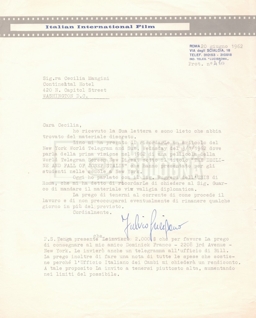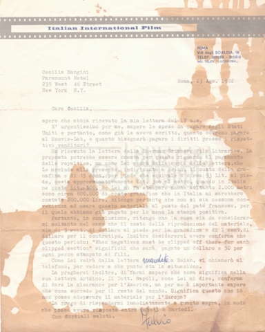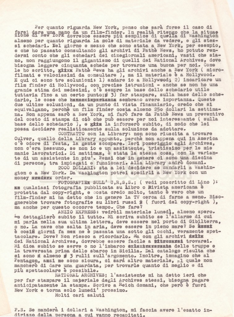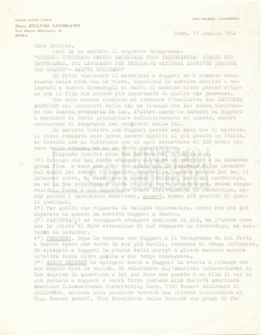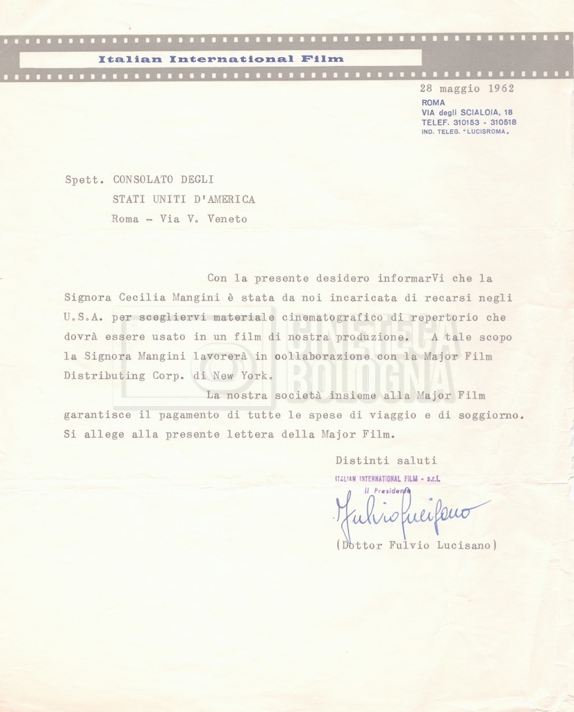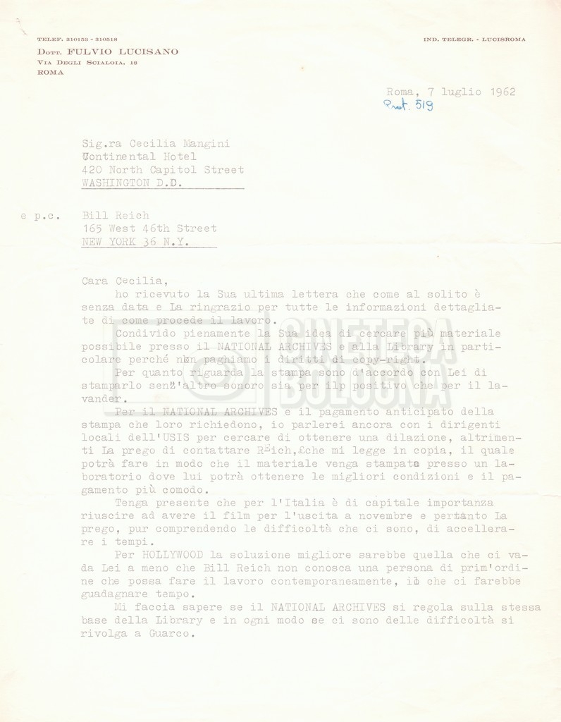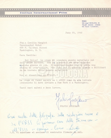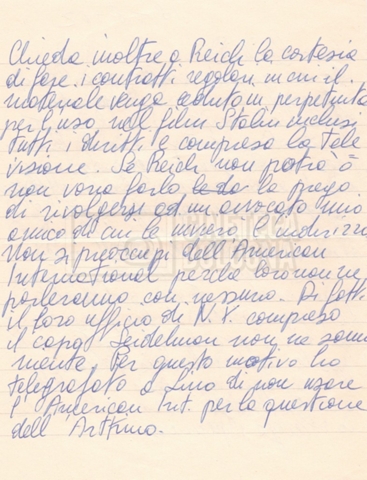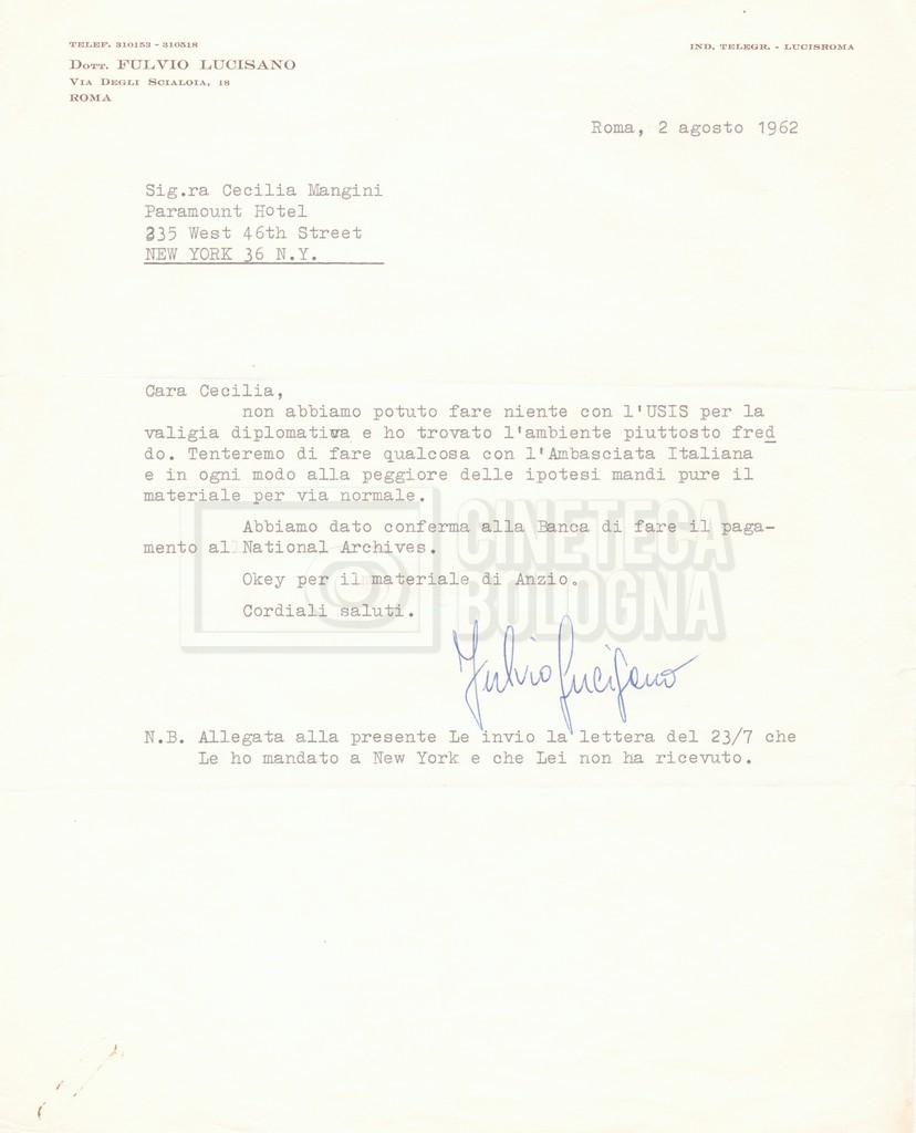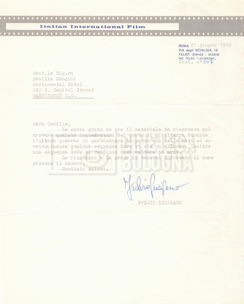 Torna alla banca dati “Corrispondenza Lucisano – Mangini (USA e Inghilterra)” Documento storico Fondo Cecilia Mangini – Lino Del Fra / “Collaborazioni con altri” / “Processo a Stalin” Ambiti e contenuto Contiene corrispondenza riguardante la ricerca e la consultazione dei materiali di studio. Informazioni archivistiche Cronologia: 28 maggio 1962 – 04 gennaio 1963 Numero di ordinamento definitivo: 10.3.11 Numero di ordinamento provvisorio: 59.08 Descrizione fisica: fascicolo Immagini digitalizzate Documenti correlati Vai alla banca dati DOCUMENTO STORICO “Franco Fortini; ‘Stalin’; le varie stesure del testo di Fortini; fotocopie; gli originali sono alla fondazione Fortini a Siena” DOCUMENTO STORICO “Rassegna stampa; la preparazione; Del Fra, Mangini e Fortini ritirano la firma; le recensioni; lettera al Nouvel Observateur” DOCUMENTO STORICO Storia della realizzazione del film DOCUMENTO STORICO “Presentazione di ‘Stalin’ (anche nella lettera a Pennacchi)” DOCUMENTO STORICO “Lettera pre-contratto da Lucisano a Del Fra” DOCUMENTO STORICO “Lettera a noi di Fortini, dopo il primo incontro per il testo; risposta di Lino” DOCUMENTO STORICO “Telegrammi di Fortini (gli originali a Siena). L’originale è stato ritrovato poco tempo fa dentro un libro” DOCUMENTO STORICO “Lettera di Del Fra a Deutscher; lettera di Fortini a Del Fra; lettera di Deutscher a Del Fra; lettera di Del Fra a Mangini per tentativo Deutscher” DOCUMENTO STORICO “Lettere di Lino Del Fra a Cecilia Mangini (in ‘United States of America’ e in Inghilterra)” DOCUMENTO STORICO “Telegramma a Nikita Krutshev” DOCUMENTO STORICO “Dichiarazione di Natalia Sedova” DOCUMENTO STORICO “Testo con correzioni di Lucisano” DOCUMENTO STORICO Materiale preparatorio e appunti DOCUMENTO STORICO “Corrispondenza Fortini; Rottura con Lucisano; Lettera di Trockji accolto come esule in Messico” DOCUMENTO STORICO “Conti USA e GB” DOCUMENTO STORICO Corrispondenza tra Cecilia Mangini e Lino Del Fra DOCUMENTO STORICO Appunti e rassegna stampa DOCUMENTO STORICO Rassegna stampa