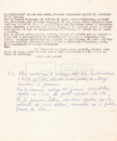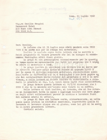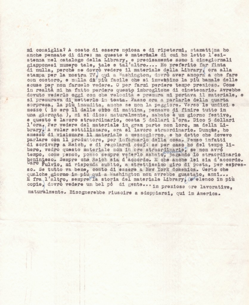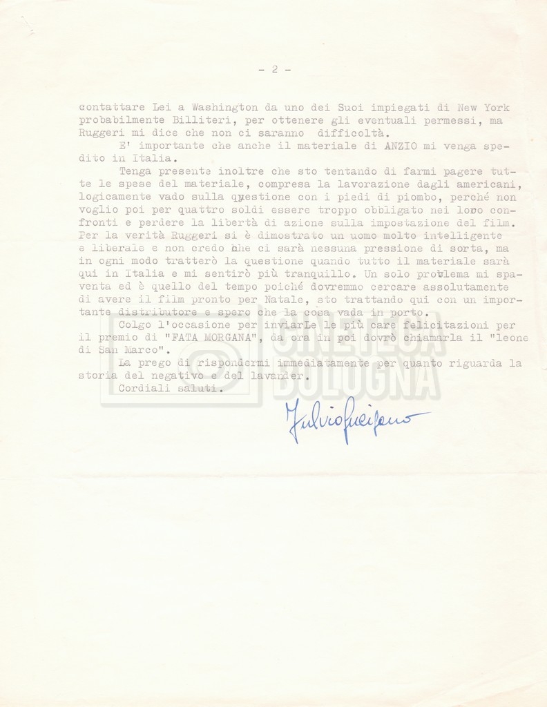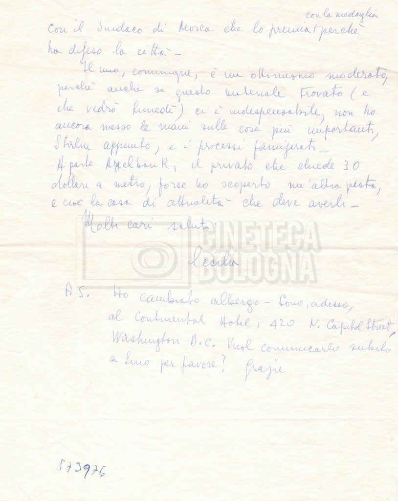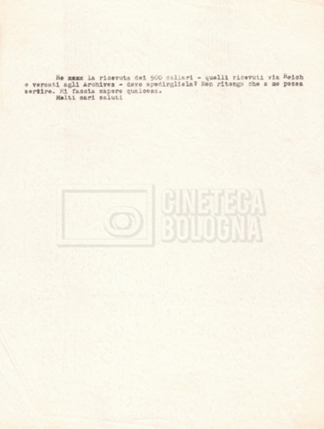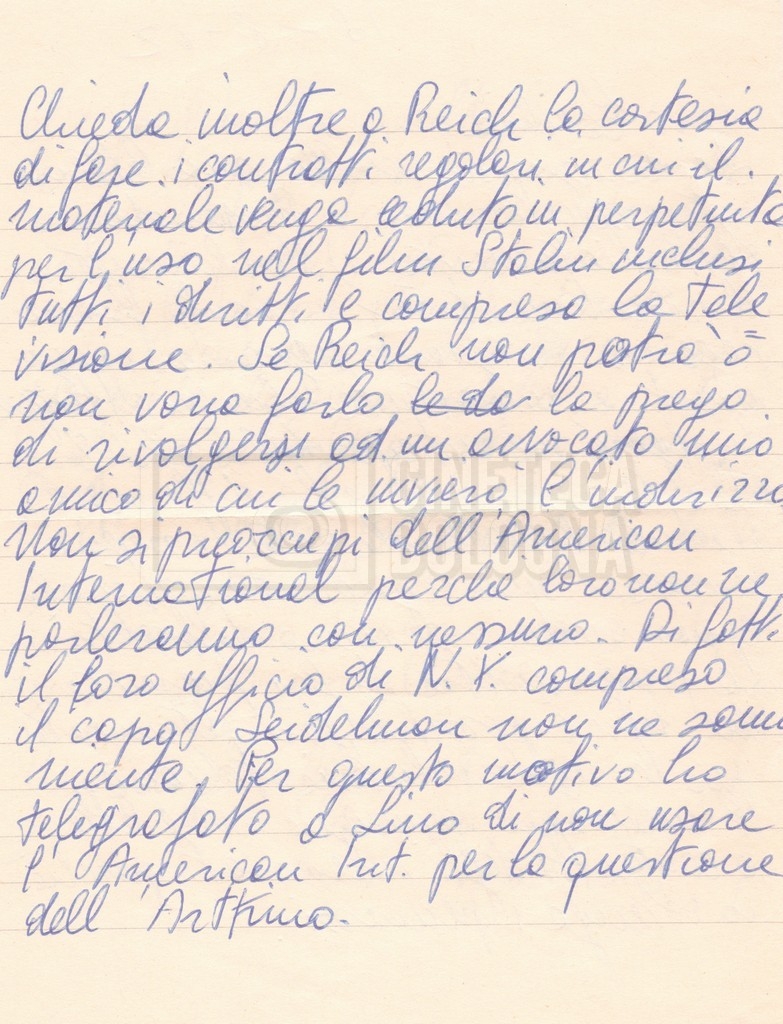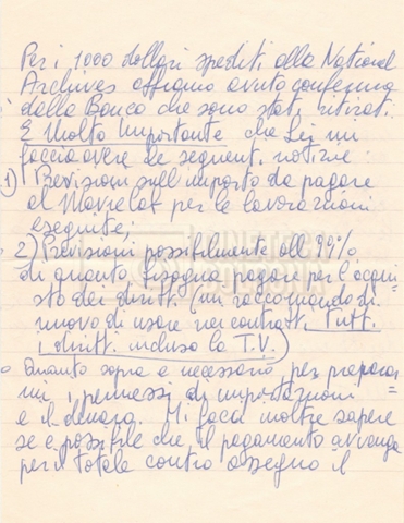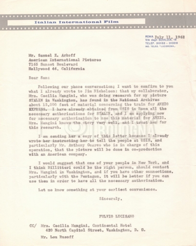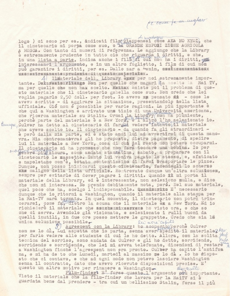 Torna alla banca dati “Corrispondenza Lucisano – Mangini (USA e Inghilterra)” Documento storico Fondo Cecilia Mangini – Lino Del Fra / “Collaborazioni con altri” / “Processo a Stalin” Ambiti e contenuto Contiene corrispondenza riguardante la ricerca e la consultazione dei materiali di studio. Informazioni archivistiche Cronologia: 28 maggio 1962 – 04 gennaio 1963 Numero di ordinamento definitivo: 10.3.11 Numero di ordinamento provvisorio: 59.08 Descrizione fisica: fascicolo Immagini digitalizzate Documenti correlati Vai alla banca dati DOCUMENTO STORICO “Franco Fortini; ‘Stalin’; le varie stesure del testo di Fortini; fotocopie; gli originali sono alla fondazione Fortini a Siena” DOCUMENTO STORICO “Rassegna stampa; la preparazione; Del Fra, Mangini e Fortini ritirano la firma; le recensioni; lettera al Nouvel Observateur” DOCUMENTO STORICO Storia della realizzazione del film DOCUMENTO STORICO “Presentazione di ‘Stalin’ (anche nella lettera a Pennacchi)” DOCUMENTO STORICO “Lettera pre-contratto da Lucisano a Del Fra” DOCUMENTO STORICO “Lettera a noi di Fortini, dopo il primo incontro per il testo; risposta di Lino” DOCUMENTO STORICO “Telegrammi di Fortini (gli originali a Siena). L’originale è stato ritrovato poco tempo fa dentro un libro” DOCUMENTO STORICO “Lettera di Del Fra a Deutscher; lettera di Fortini a Del Fra; lettera di Deutscher a Del Fra; lettera di Del Fra a Mangini per tentativo Deutscher” DOCUMENTO STORICO “Lettere di Lino Del Fra a Cecilia Mangini (in ‘United States of America’ e in Inghilterra)” DOCUMENTO STORICO “Telegramma a Nikita Krutshev” DOCUMENTO STORICO “Dichiarazione di Natalia Sedova” DOCUMENTO STORICO “Testo con correzioni di Lucisano” DOCUMENTO STORICO Materiale preparatorio e appunti DOCUMENTO STORICO “Corrispondenza Fortini; Rottura con Lucisano; Lettera di Trockji accolto come esule in Messico” DOCUMENTO STORICO “Conti USA e GB” DOCUMENTO STORICO Corrispondenza tra Cecilia Mangini e Lino Del Fra DOCUMENTO STORICO Appunti e rassegna stampa DOCUMENTO STORICO Rassegna stampa