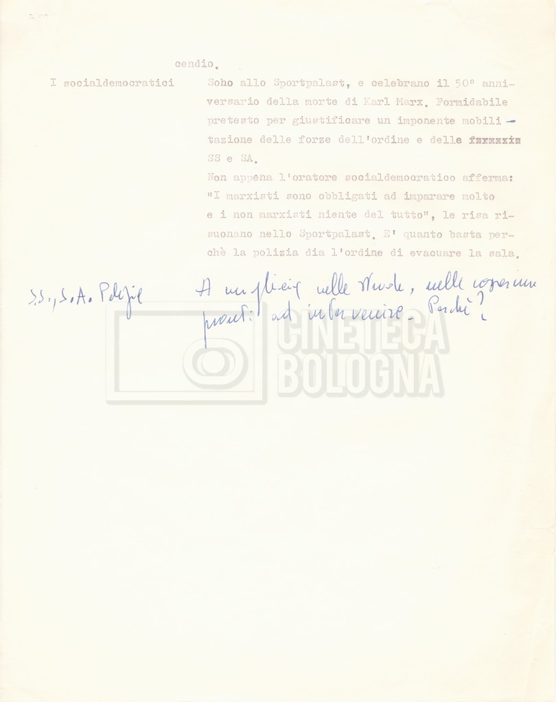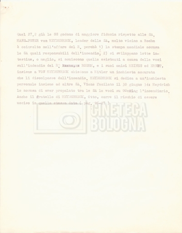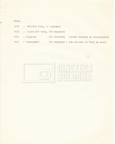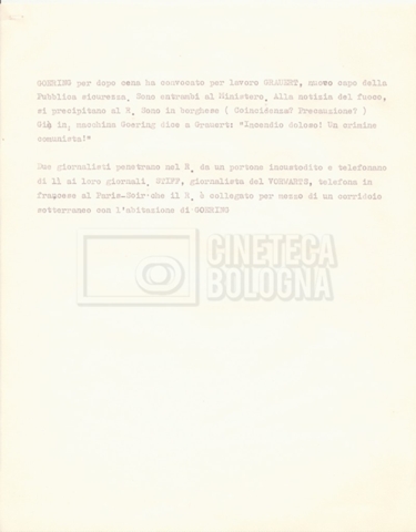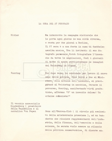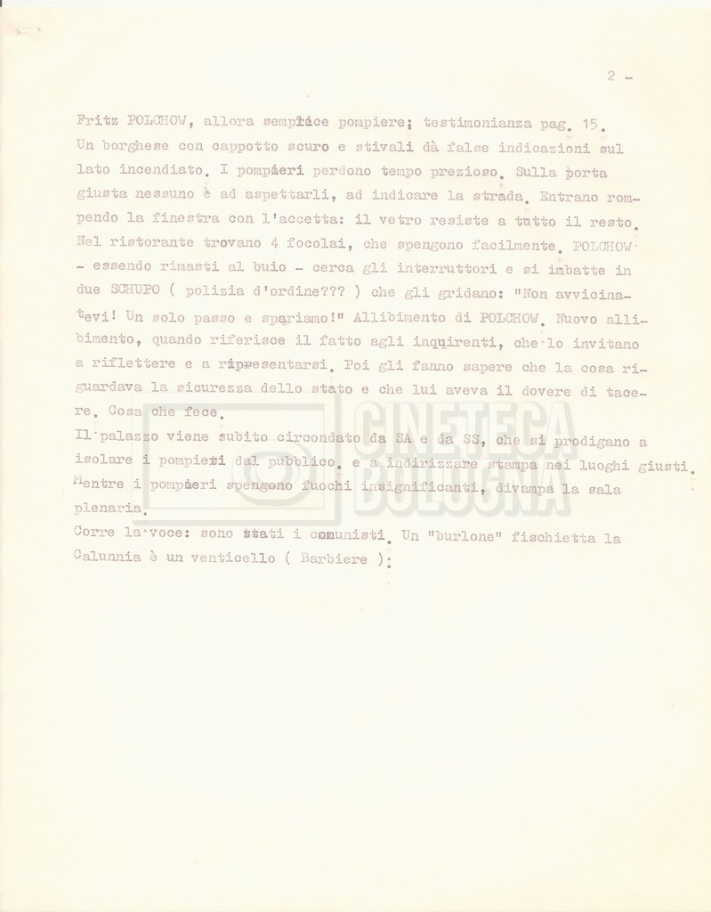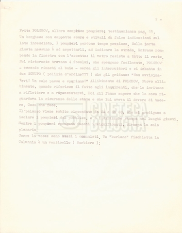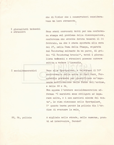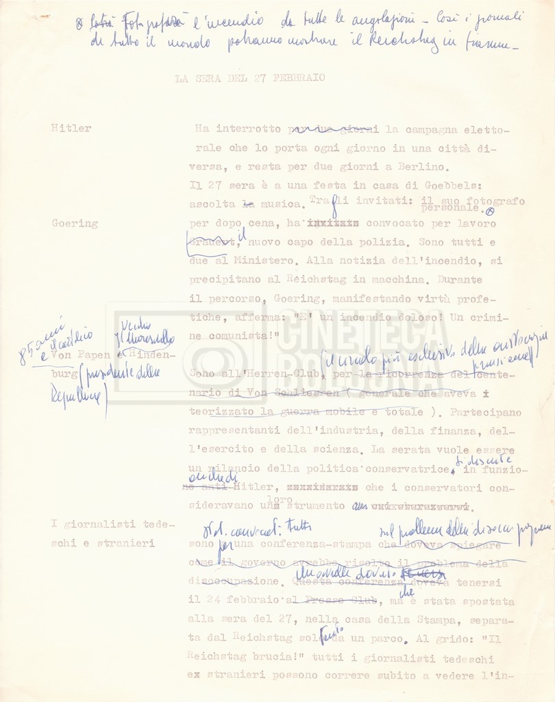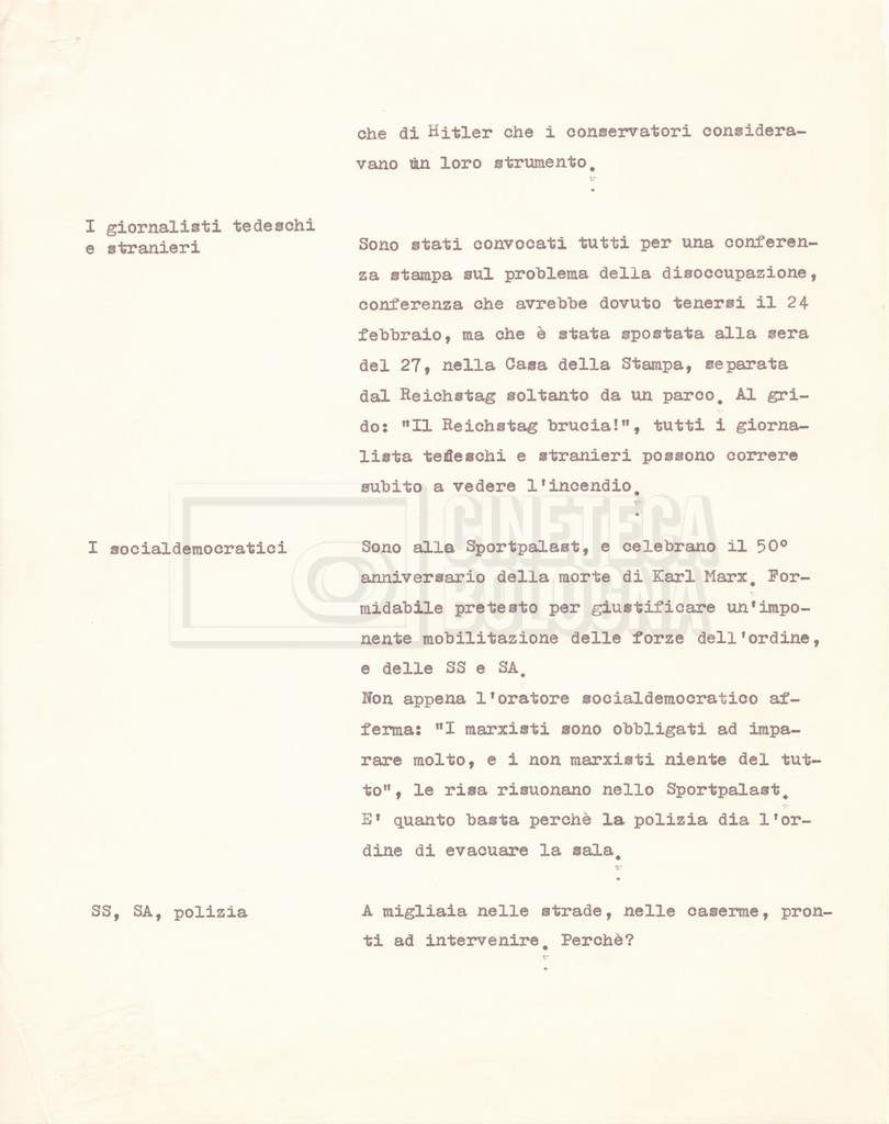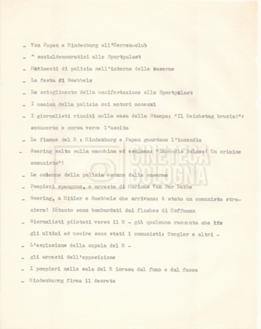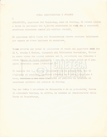 Torna alla banca dati “Cronologie” Documento storico Fondo Cecilia Mangini – Lino Del Fra / “Documentari non realizzati” / “L’incendio del Reichstag” Ambiti e contenuto Contiene i s.fascc.:– “La sera dell’incendio: collocazione dei movimenti dei personaggi desunta da diversi libri”;– “Cronologie”. Informazioni archivistiche Cronologia: [1974 – 1978] Numero di ordinamento definitivo: 5.9.3 Numero di ordinamento provvisorio: 69.05 Descrizione fisica: fascicolo Immagini digitalizzate Documenti correlati Vai alla banca dati DOCUMENTO STORICO Appunti di studio DOCUMENTO STORICO “Controcopertina del trattamento; presentazione del trattamento; scaletta del trattamento; note sulla sceneggiatura; scaletta della sceneggiatura” DOCUMENTO STORICO “La stampa d’epoca” DOCUMENTO STORICO “Appunti su personaggi; Marinus Van Der Lubbe; Dimitrov; Hitler; Goering; Goebbels; Neubauer” DOCUMENTO STORICO “‘L’incendio del Reichstag’. Trattamento” DOCUMENTO STORICO “Interviste: Prof. Kalbe, Glondarewsky, Schrecker; Nebauer materiale estratto; appunti miei da Maid Kohler;materiale da Maid Kohler; Museo Dimitrov a Lipsia; appunti miei su cinegiornale; appunti miei su fotografie; appunti dal libro di Calic; canzone da Cabaret” DOCUMENTO STORICO “Fotocopie dagli atti del processo di Lipsia; seduta del Reichstag 23.3.1933 all’Opera Kroll (Institut fur Zeitgeschichte di Monaco)” DOCUMENTO STORICO “Fotocopie dagli archivi della ‘Deutsche Demokratische Republik’ (DDR)” DOCUMENTO STORICO “Fotocopie da libri tedeschi con brevi note in italiano” DOCUMENTO STORICO “Note di Mario Gallo” DOCUMENTO STORICO “Domande da porre a Collotti” DOCUMENTO STORICO “I giudizi tedeschi; osservazioni di Gian Enrico Rusconi” DOCUMENTO STORICO Lettere Reichstag DOCUMENTO STORICO Rassegna stampa DOCUMENTO STORICO “Mie considerazioni sui cambiamenti apportati da Mario Gallo a ‘L’incendio del Reichstag’” DOCUMENTO STORICO Audiocassette DOCUMENTO STORICO Corrispondenza e rassegna stampa DOCUMENTO STORICO “‘Incendio del Reichstag’. Prima sceneggiatura” DOCUMENTO STORICO “‘Incendio del Reichstag’. Seconda sceneggiatura revisionata e snellita” DOCUMENTO STORICO “‘Incendio del Reichstag’. Revisione di Nicola Badalucco e Mario Gallo”