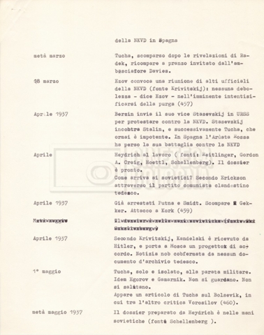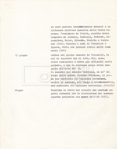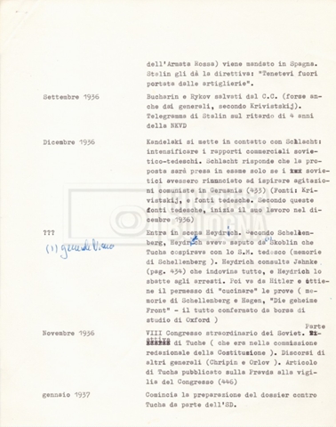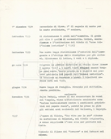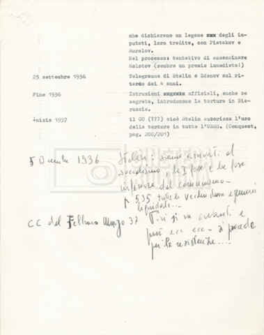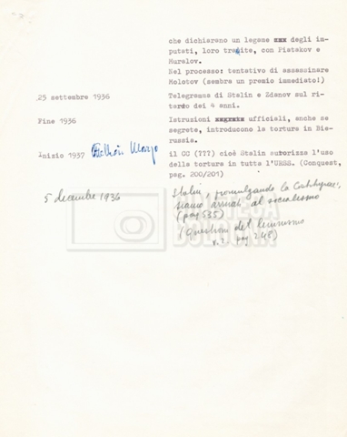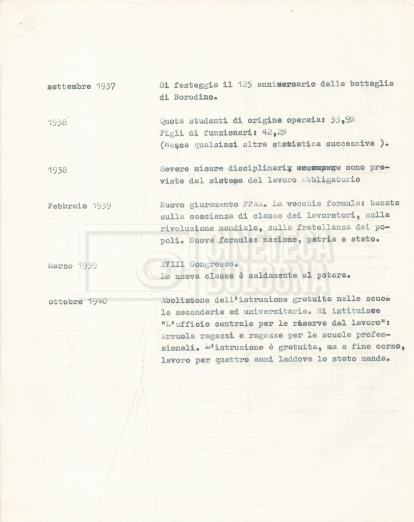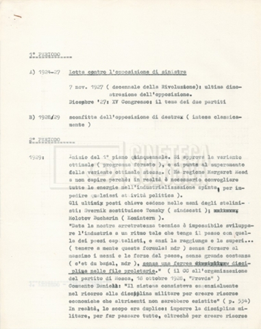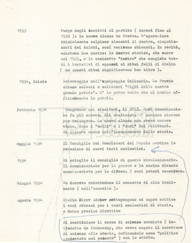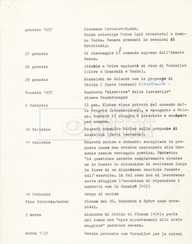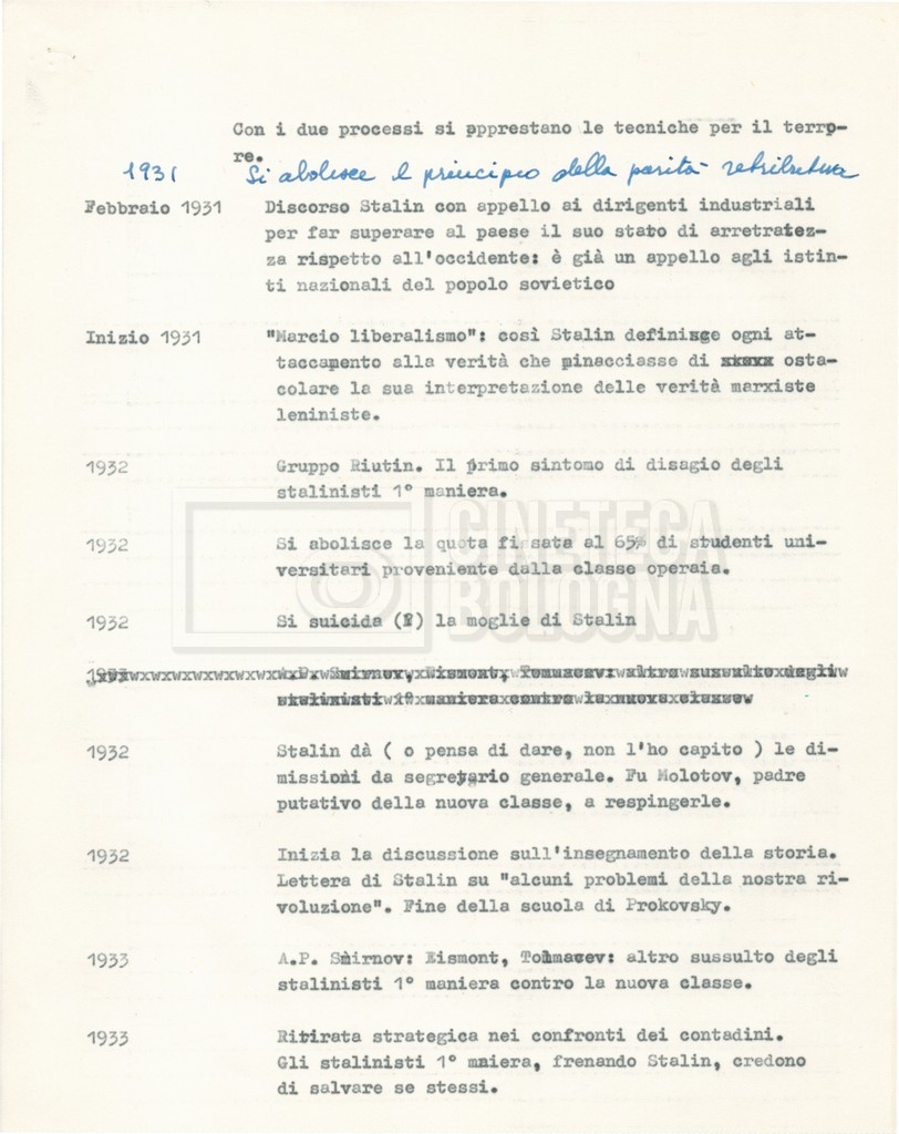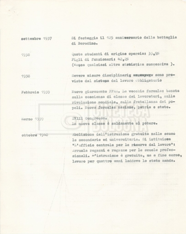 Torna alla banca dati “Cronologie” Documento storico Fondo Cecilia Mangini – Lino Del Fra / “Documentari non realizzati” / “Processo a Bucharin” Ambiti e contenuto Contiene, oltre a cc. sciolte, il s.fasc.: – “Cronologie per la sceneggiatura”; Si segnalano, come materiale sciolto, relazioni datt. riguardanti le date storiche e gli avvenimenti in Russia e appunti mss.. Informazioni archivistiche Cronologia: [1967 – 1980] Integrazione alla data: con informazioni dal 1931 al 1940 Numero di ordinamento definitivo: 5.6.15 Numero di ordinamento provvisorio: 40.06 Descrizione fisica: fascicolo Immagini digitalizzate Documenti correlati Vai alla banca dati DOCUMENTO STORICO “Bibliografie Bucharin” DOCUMENTO STORICO “I testi fotocopiati all’Istituto Feltrinelli” DOCUMENTO STORICO “Archivio Tasca; fotocopie giornali e lettere; elenco articoli fotocopiati e non” DOCUMENTO STORICO Lo studio della figura di Iosif Stalin attraverso gli scambi con Stephen Frand Cohen e Ante Ciliga DOCUMENTO STORICO “Bucharin Francia” DOCUMENTO STORICO “Documentazione; affaire Tourhachevsky; Dimitrov etc.; processi fine anni Venti; 1934 XVII congresso; Riutin; Ulam; Stalin il santo e Trockji il fellone” DOCUMENTO STORICO “Fotocopie: Stalin; Bucharin; Procacci; Mosche Lewin; La societè burocratique” DOCUMENTO STORICO Appunti DOCUMENTO STORICO “Mosca 38” DOCUMENTO STORICO “Alfabeto russo” DOCUMENTO STORICO “Processo I” DOCUMENTO STORICO “Processo II” DOCUMENTO STORICO “Indice: Procés testo stenografico” DOCUMENTO STORICO “Indice di avvenimenti e personaggi” DOCUMENTO STORICO “Riassunto dei libri di Orlov, Medvedev, Ulam, Conquest” DOCUMENTO STORICO “Appunti di Lino” DOCUMENTO STORICO “Ideologia demonologica espressa nei processi; schema: gli impuntati del processo; schema: le udienze del processo” DOCUMENTO STORICO “Fascicoli monografici” DOCUMENTO STORICO Interviste in casa Medvedev a Mosca con Anna Larina, Yuri Bucharin, Roy Medvedev, Yevgeny Gnedin, Edmund Stevens DOCUMENTO STORICO “Appello per la riabilitazione di Bucharin, 1978; la rassegna stampa”