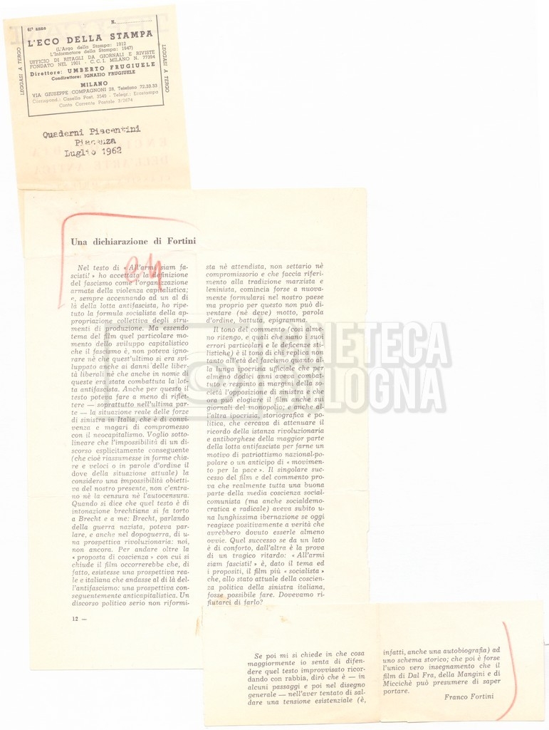 Contiene la dichiarazione di Franco Fortini pubblicata in “Quaderni Piacentini” (a. I, luglio 1962, n. 3).