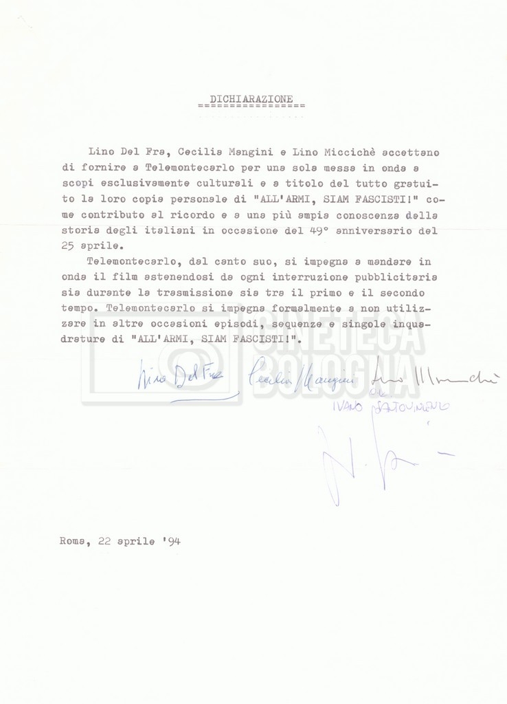 Contiene la dichiarazione, firmata da Lino Del Fra, Cecilia Mangini e Lino Miccichè, letta in occasione della proiezione del film su Telemontecarlo del 25 aprile 1944.