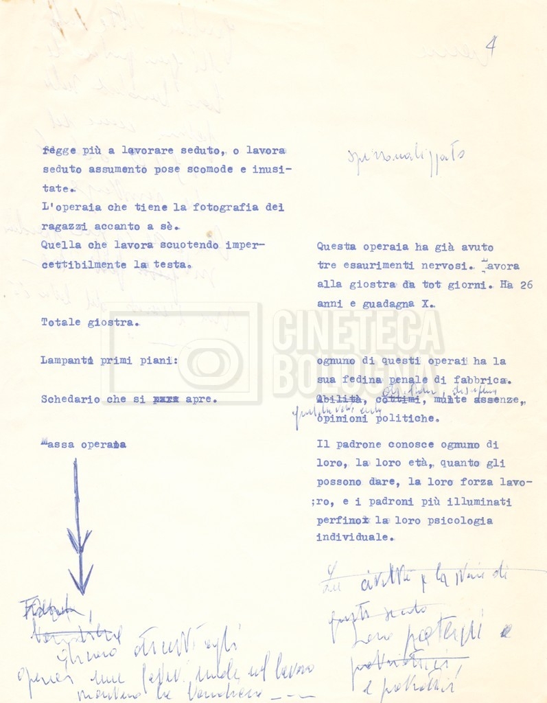- "Tempi Magri": contiene due copie datt. dello stesso découpage tecnico, l'una a nome di Lino Del Fra e l'altra di Cecilia Mangini, con relative note mss.. Inclusi appunti datt. sullo scenario urbano della Milano del miracolo economico e delle vite che l'attraversano, con annotazioni mss.;