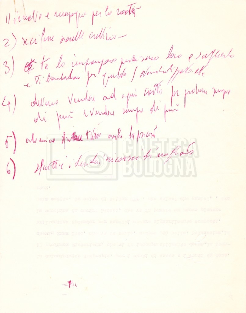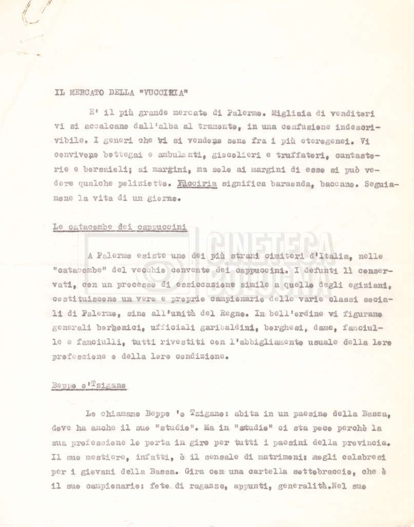 - "Il mercato della 'Vucciria": titolo generale di un progetto che contiene altri sottotitoli: "Le catacombe dei cappuccini", sui sotterranei cimiteriali del convento dei Cappuccini di Palermo; "Beppe o' Tzigano", sul lavoro di un "seminale di matrimoni" nell'Italia del boom economico; "Ugola minore", sulle ambizioni di un bambino cantante e della sua famiglia; "Arrivano i nostri", su "un western made in Italy" nelle borgate di Roma; "Io non t'ho amata mai", omaggio al poeta Guido Gozzano; "Lori e i guerrieri", sui giochi d'armi e di guerra, fantasticati da un bambino, probabilmente sfruttando gli ambienti del Museo Stibbert di Firenze (secondo l'annotazione mss. a lato);