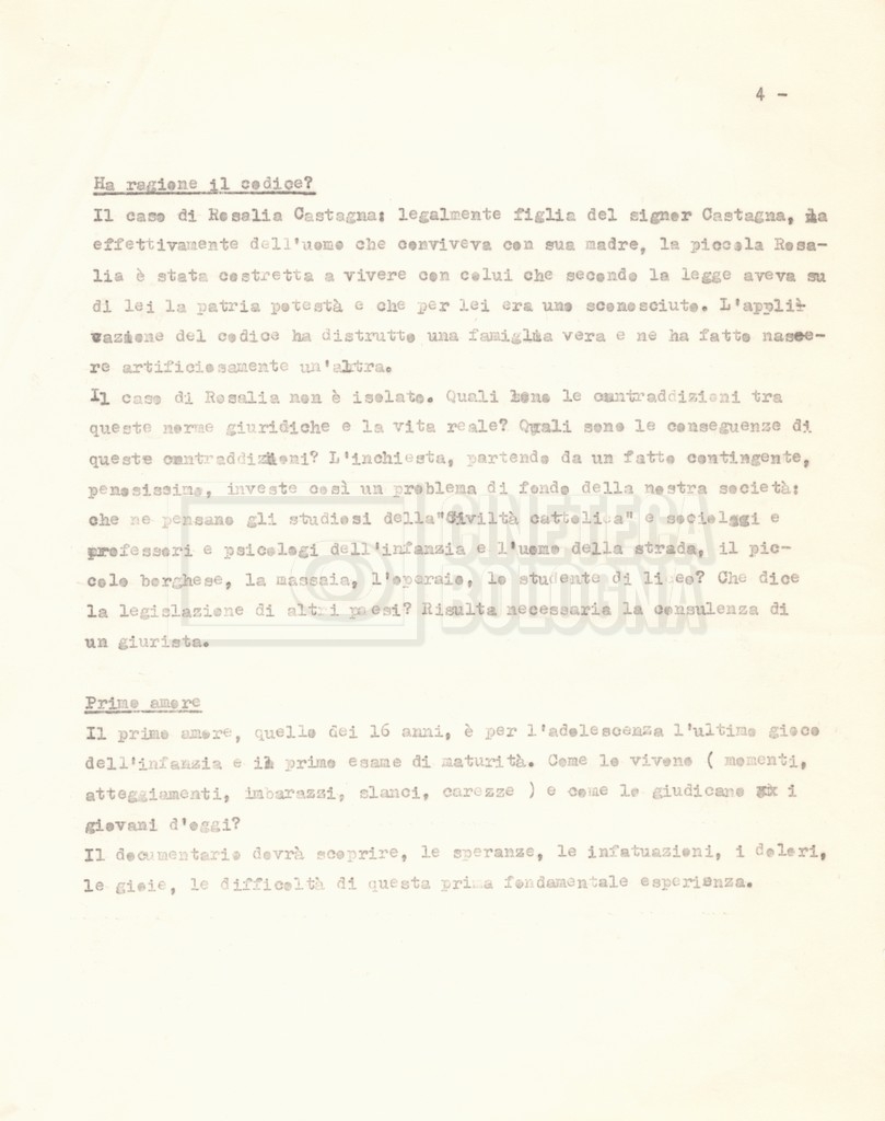 - "L'accalappiacani": contiene un soggetto per un documentario, ambientato alla periferia di Roma, il cui voice-over doveva essere affidato a Pier Paolo Pasolini. Si tratta di uno spaccato sulla quotidianità della borgata, in cui la cattura di un cane randagio da parte di un accalappiacani si svolge in parallelo alle avventure amorose di un giovane;