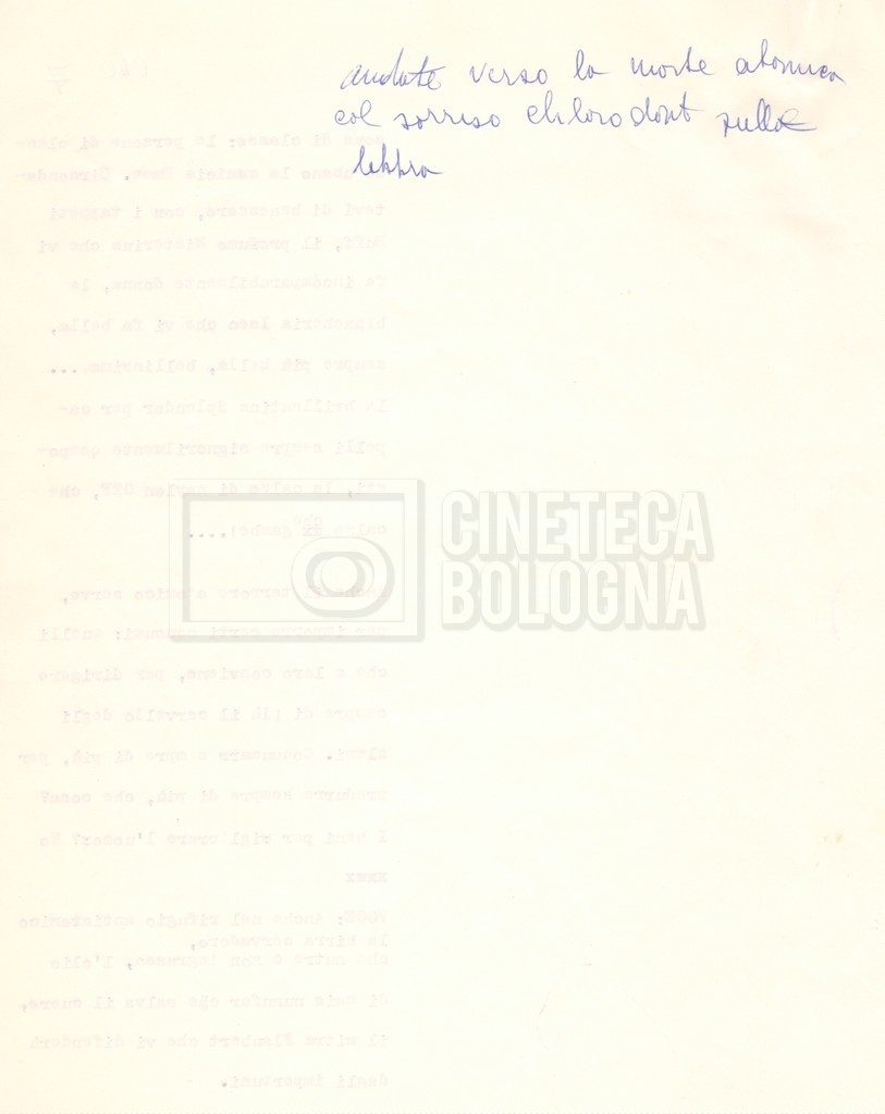 proprietari dell'unica licenza di cinema muto viaggiante esistente oggi in Italia e forse nel mondo". Sul retro del soggetto sono presenti appunti mss.;