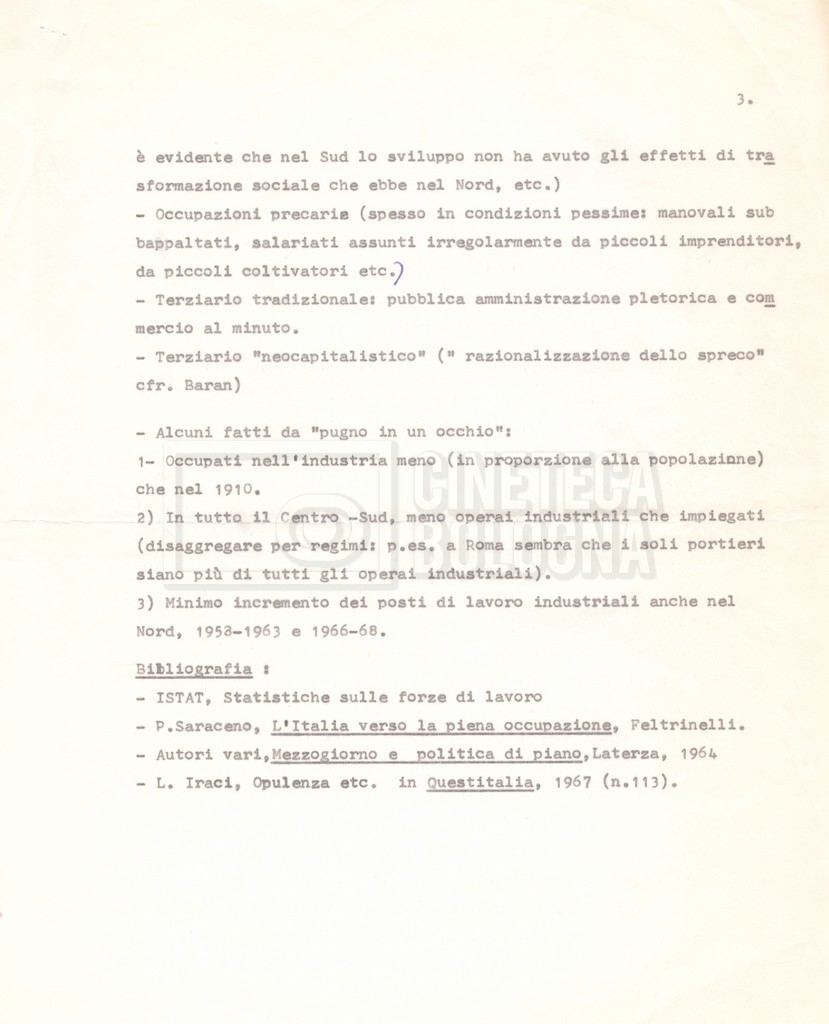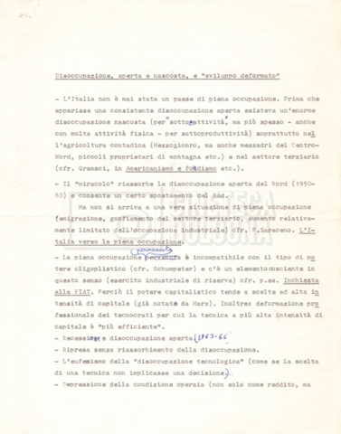 - "Disoccupazione, aperta e nascosta, e 'sviluppo deformato": contiene appunti preparatori datt., contenenti informazioni sull'occupazione e disoccupazione nel settore industriale italiano durante il decennio 1958-1968;