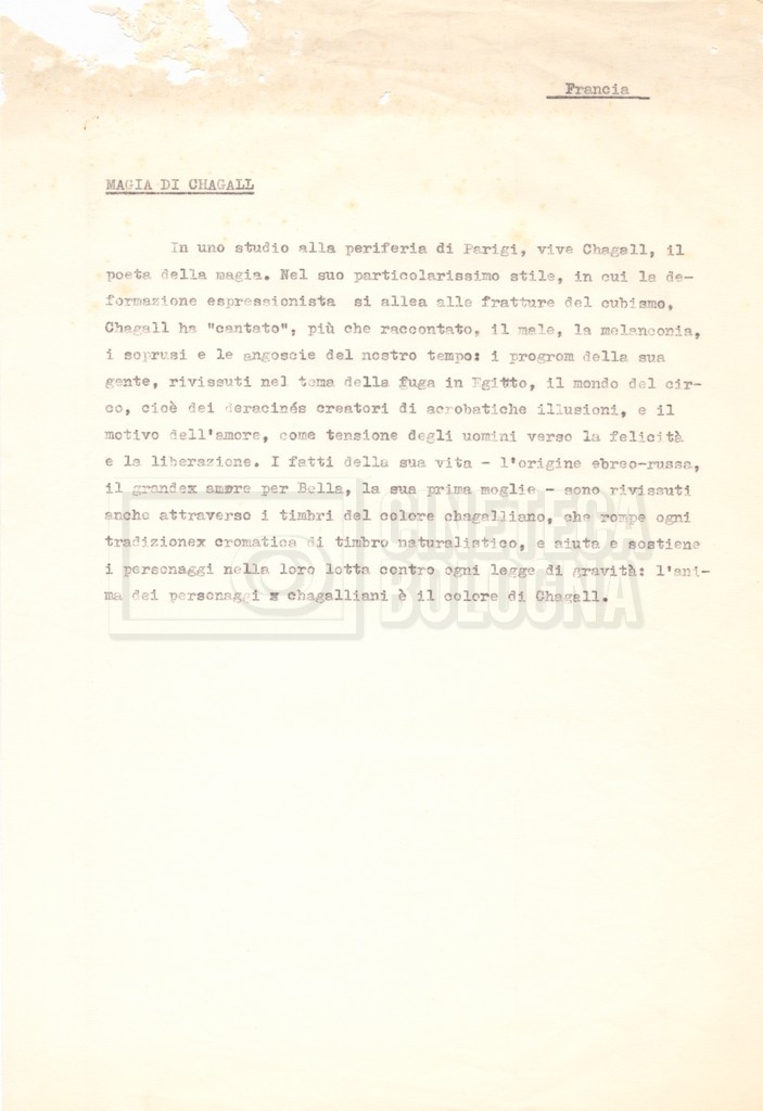 - "Magia di Chagall": contiene una sintetica descrizione del progetto dedicato a Marc Chagall, "il poeta della magia"; la biografia del pittore russo d'origine ebraica viene rivissuta "anche attraverso i timbri del colore chagalliano";
