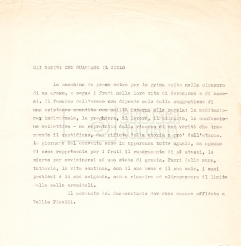 - "Gli uomini che guardano il cielo": contiene il soggetto di un documentario, il cui commento doveva essere affidato a Tullio Pinelli, sui ritmi di vita e preghiera all'interno di un non specificato eremo;