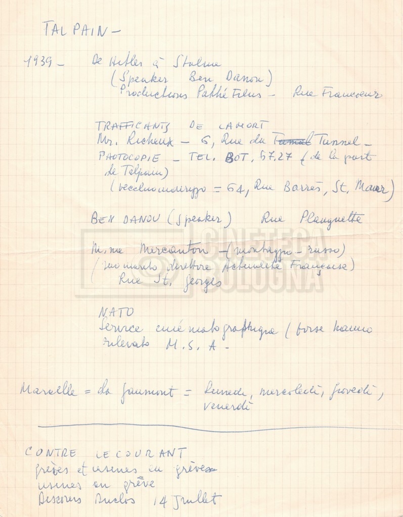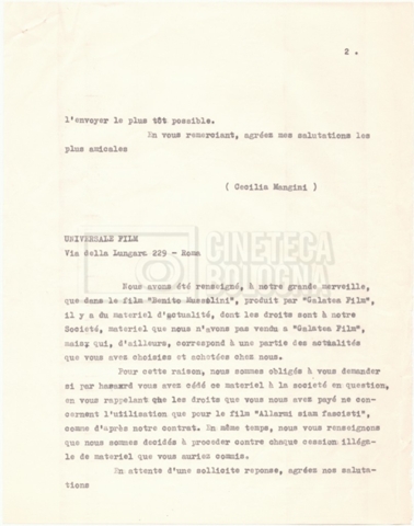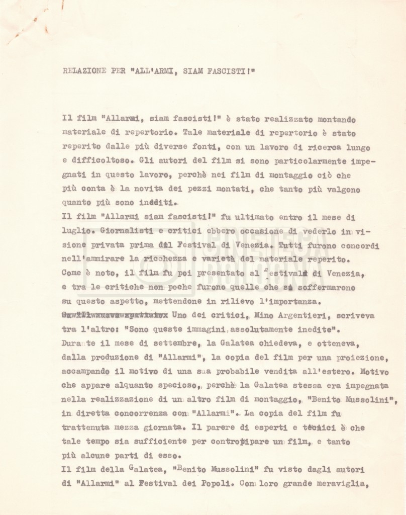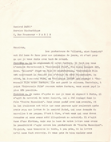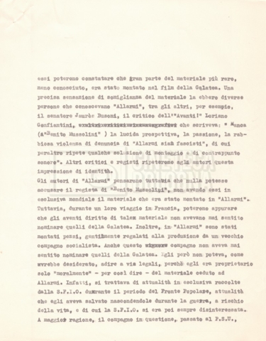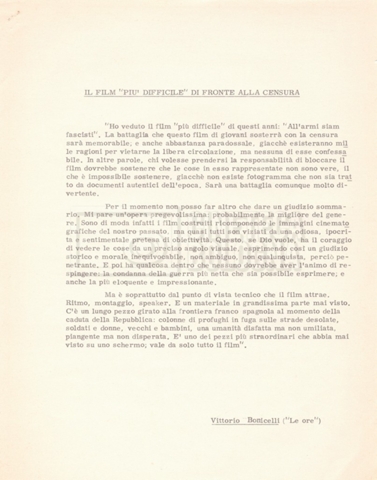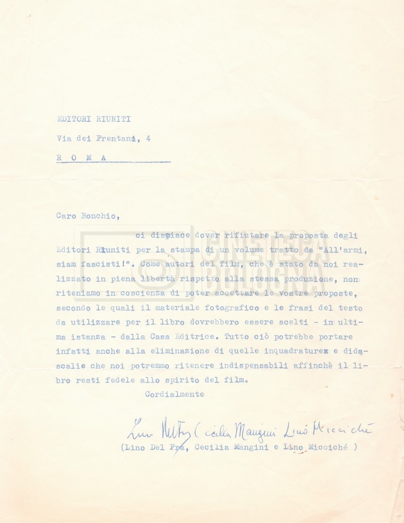 – Una lettera di Lino del Fra, Cecilia Mangini e Lino Micchichè a Roberto Bonchio, rappresentante della casa editrice ‘Editori Riuniti’, in cui rifiutano la proposta per la stampa di un volume tratto dalla pellicola (s.d.);