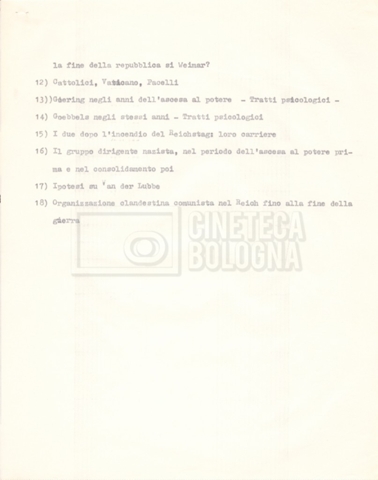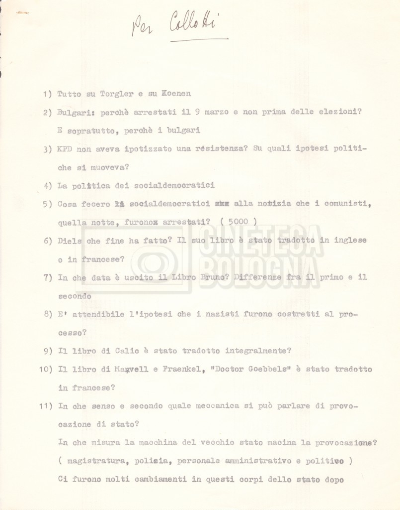 Contiene due pagine datt. con domande su questioni politiche riferite agli eventi narrati nel film da porre allo storico italiano Enzo Collotti.