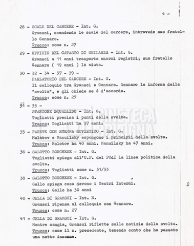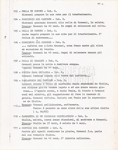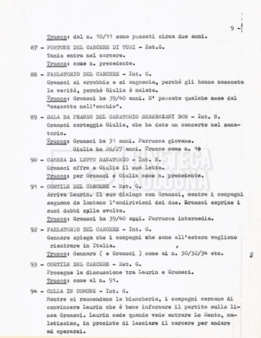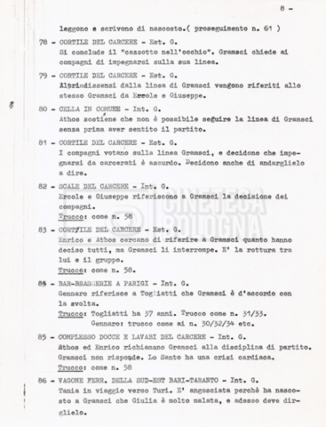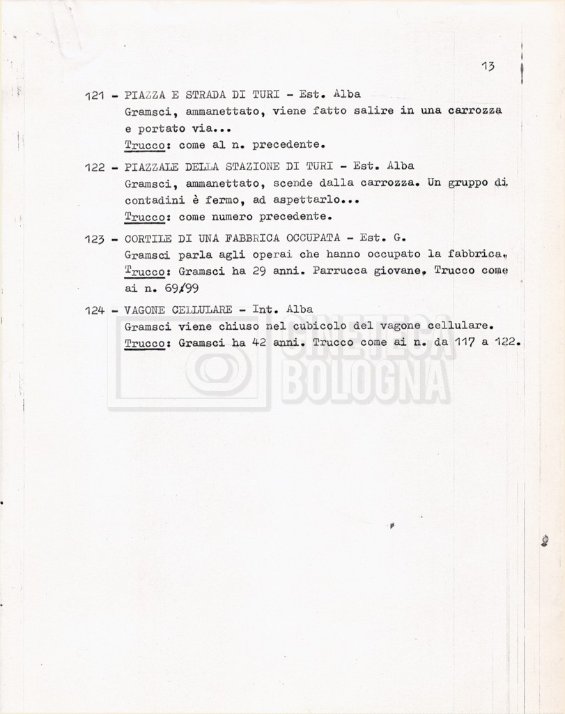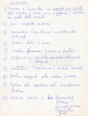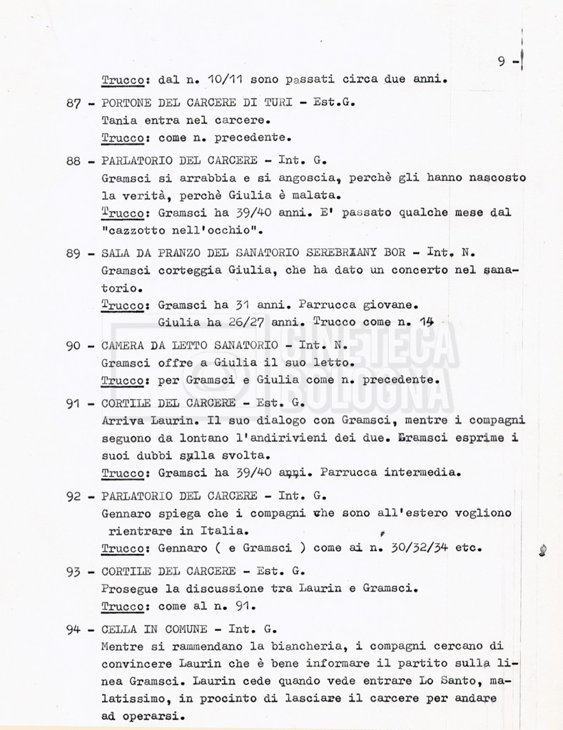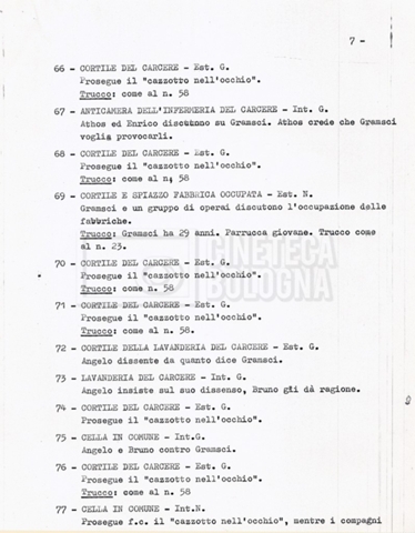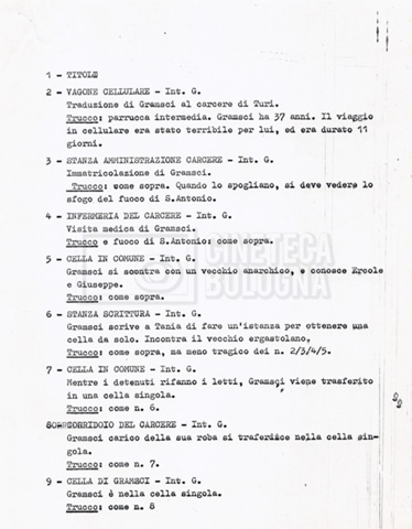 Torna alla banca dati “Durante le riprese” Documento storico Fondo Cecilia Mangini – Lino Del Fra / “Film di fiction realizzati” / “Antonio Gramsci – I giorni del carcere” Ambiti e contenuto Contiene:– Un doc. riguardante il trucco del personaggio Antonio Gramsci;– Un elenco degli attori, in duplice copia;– Un elenco della troupe;– Un appunto mss. di Cecilia Mangini per la costumista Marisa D’Andrea. Informazioni archivistiche Cronologia: [1977] Numero di ordinamento definitivo: 4.2.8 Numero di ordinamento provvisorio: 12.03 Descrizione fisica: fascicolo Immagini digitalizzate Informazioni sul film titolo originale: Antonio Gramsci – I giorni del carcere regia: Del Fra, Lino anno: 1977 paese di produzione: Italia lingua principale: italiana Documenti correlati Vai alla banca dati DOCUMENTO STORICO “Preventivo; piano di lavorazione (il primo)” DOCUMENTO STORICO “Prima versione sceneggiatura; scaletta desunta” DOCUMENTO STORICO “Il soggetto stampato; trattamento; trattamento in francese” DOCUMENTO STORICO “Diari di lavorazione” DOCUMENTO STORICO “Appunti per la sceneggiatura” DOCUMENTO STORICO “Ordini del giorno” DOCUMENTO STORICO “Il casting; gli ambienti” DOCUMENTO STORICO “I titoli di testa; i titoli di coda; le percentuali di grandezza” DOCUMENTO STORICO “Lettere sul film; nota bene: presidente della Camera dei deputati era Sandro Pertini” DOCUMENTO STORICO “I contratti degli attori” DOCUMENTO STORICO “Scene soppresse” DOCUMENTO STORICO “Antonio Gramsci; copia edizione” DOCUMENTO STORICO “Antonio Gramsci; sceneggiatura” DOCUMENTO STORICO “Antonio Gramsci; copia doppiaggio” DOCUMENTO STORICO “Antonio Gramsci; dialoghi definitivi per il doppiaggio e per il ministero” DOCUMENTO STORICO “Materiale Italnoleggio” DOCUMENTO STORICO “Interviste a Lino Del Fra” DOCUMENTO STORICO “Riprese” DOCUMENTO STORICO “Corrispondenza con Claude Ledû” DOCUMENTO STORICO Rassegna stampa