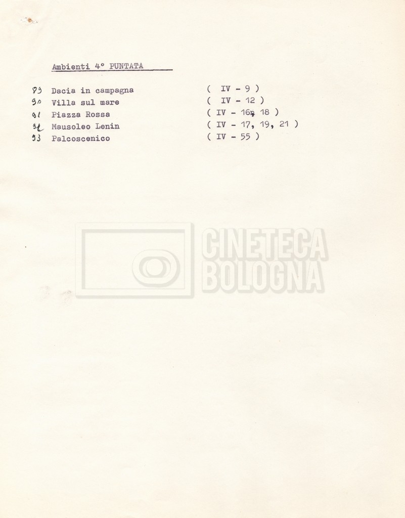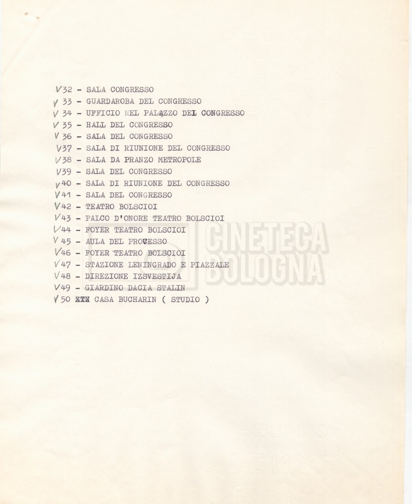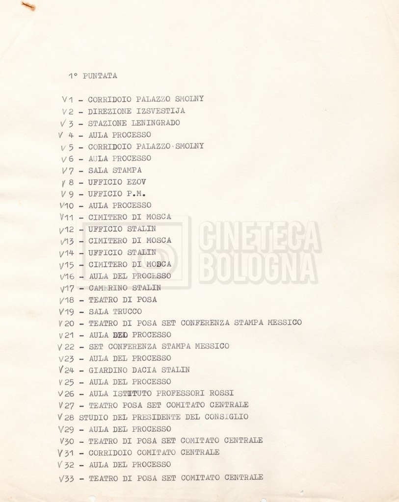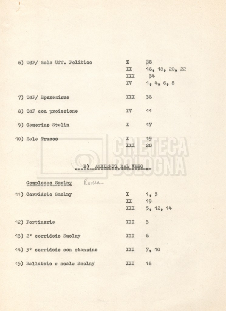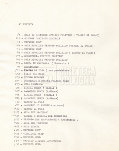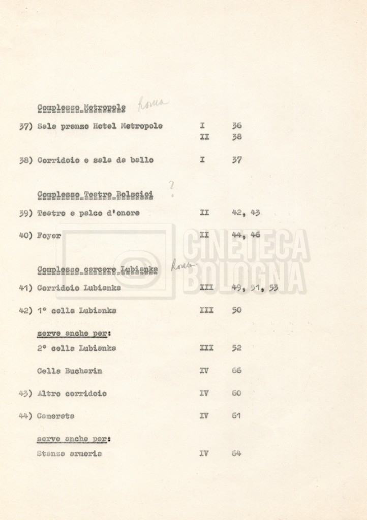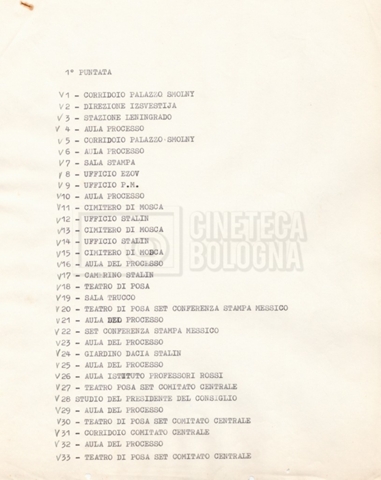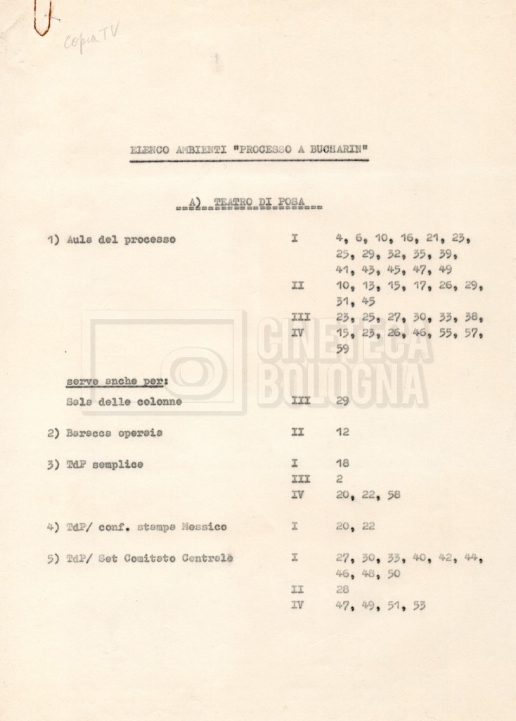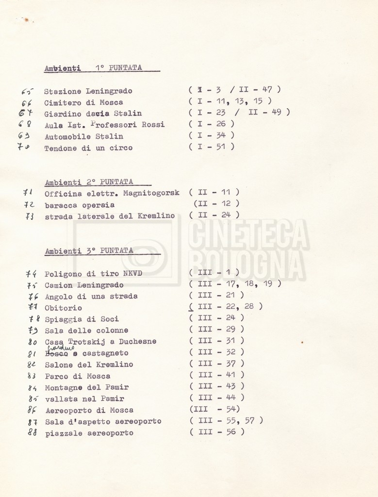– Un copia per la TV dell’elenco degli ambienti con la distinzione in teatro di posa, ambienti dal vero e ricostruzioni in esterno.
