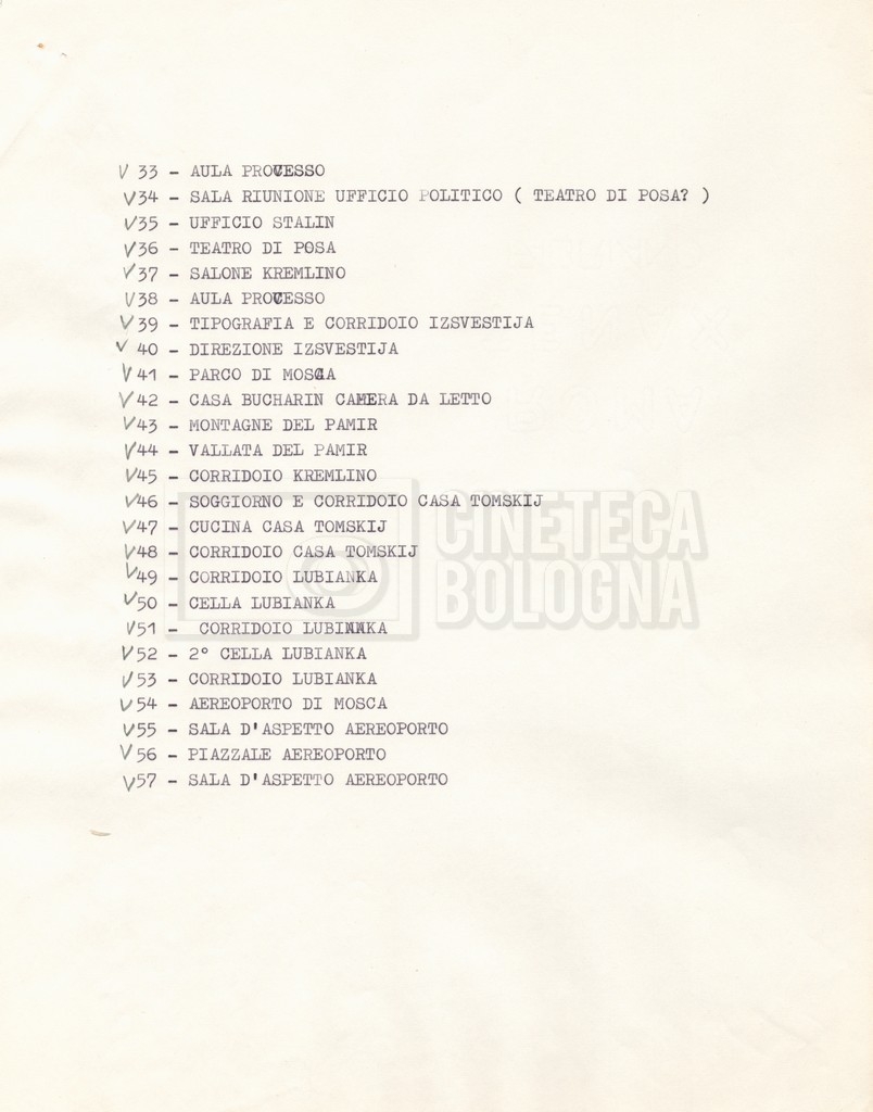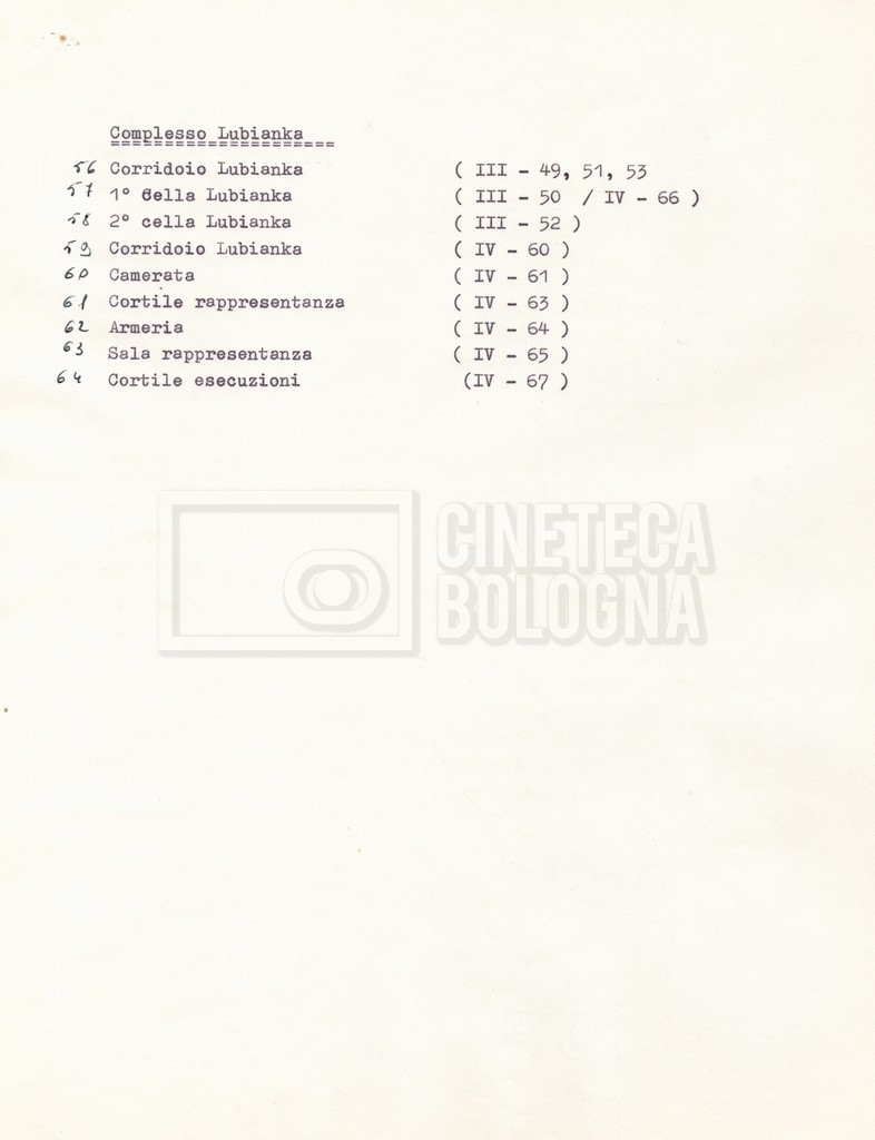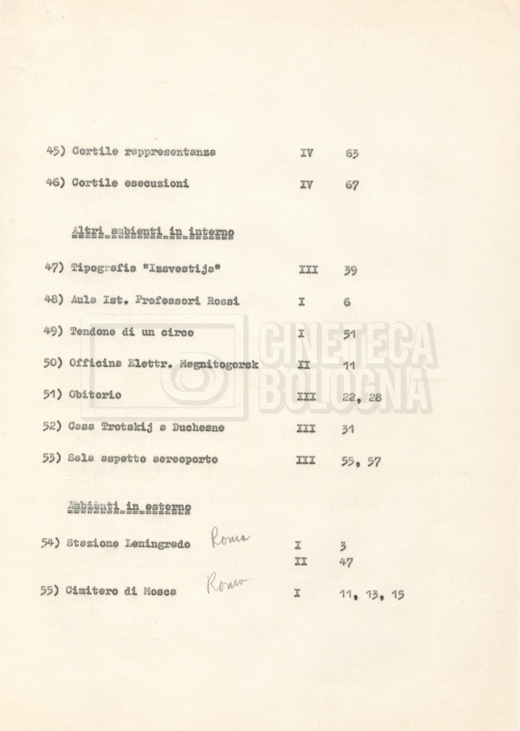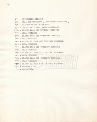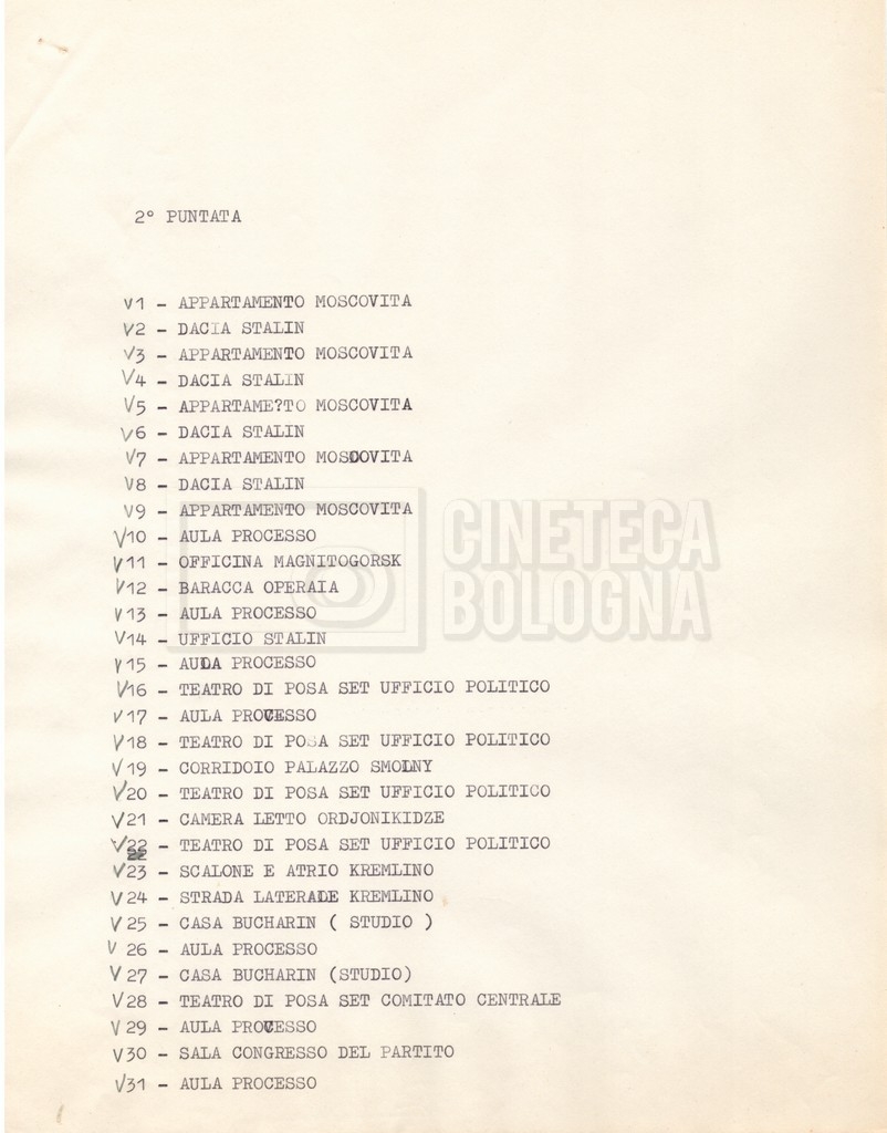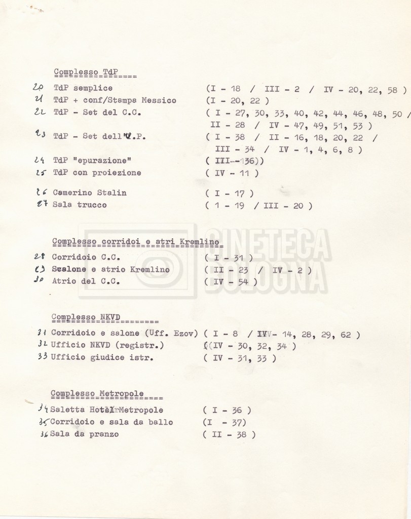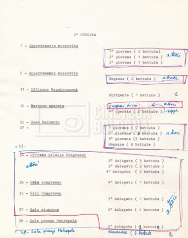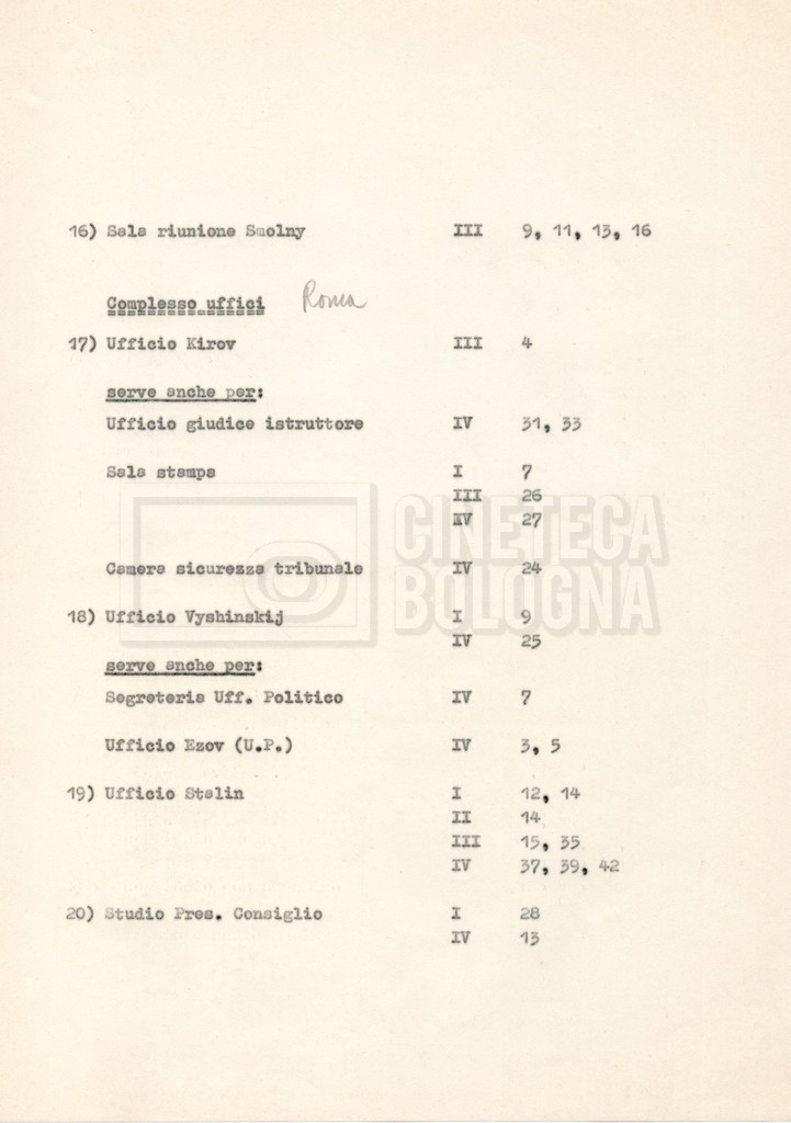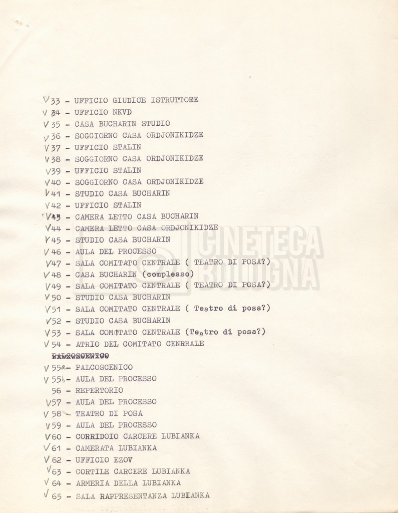 – Un copia per la TV dell’elenco degli ambienti con la distinzione in teatro di posa, ambienti dal vero e ricostruzioni in esterno.