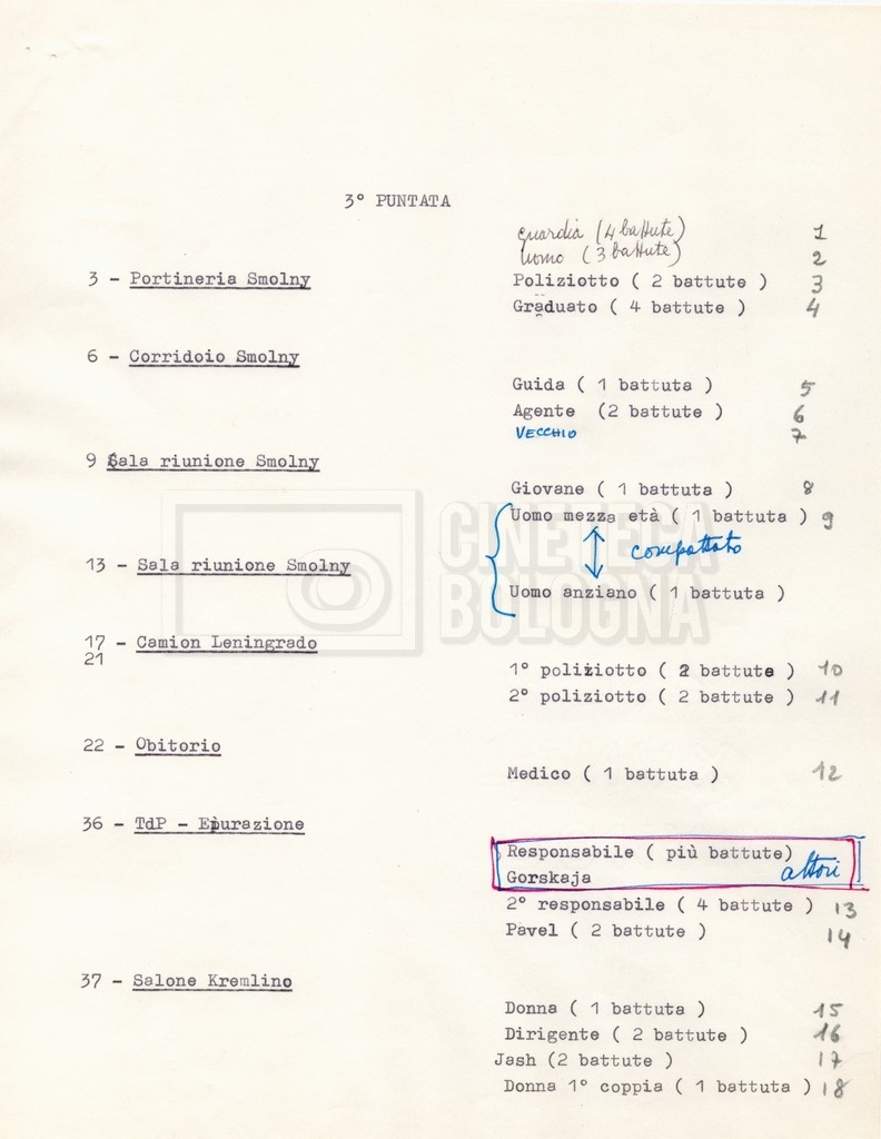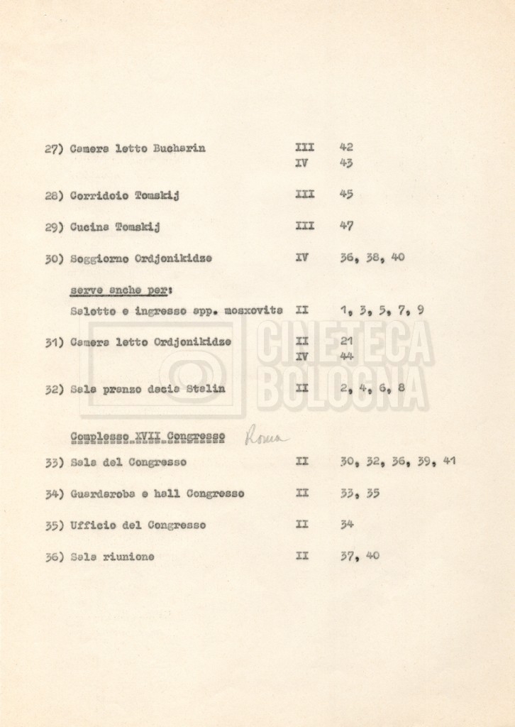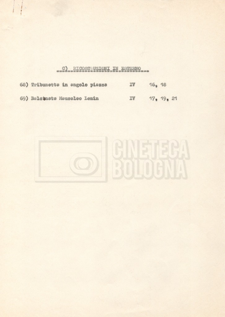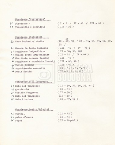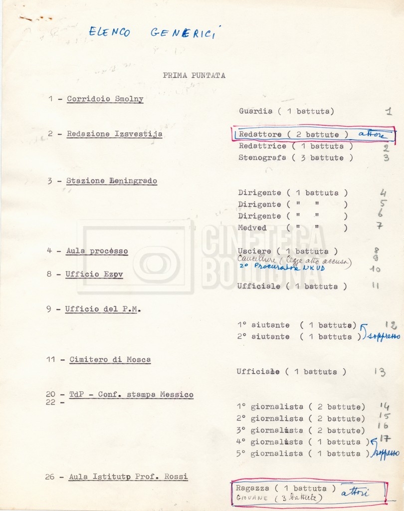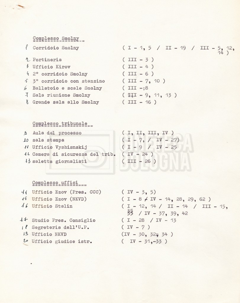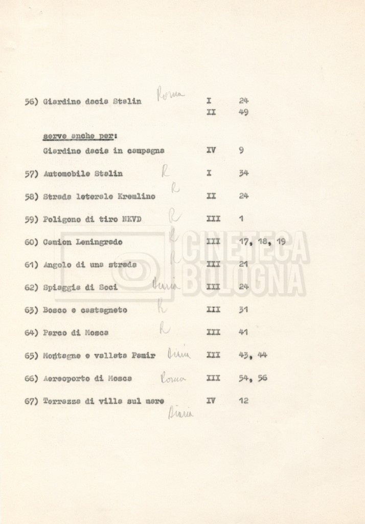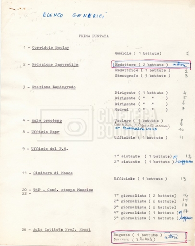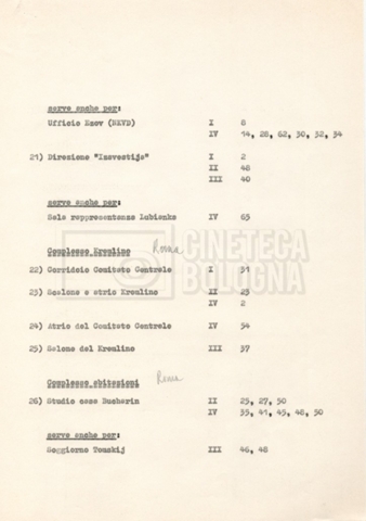 – Un copia per la TV dell’elenco degli ambienti con la distinzione in teatro di posa, ambienti dal vero e ricostruzioni in esterno.