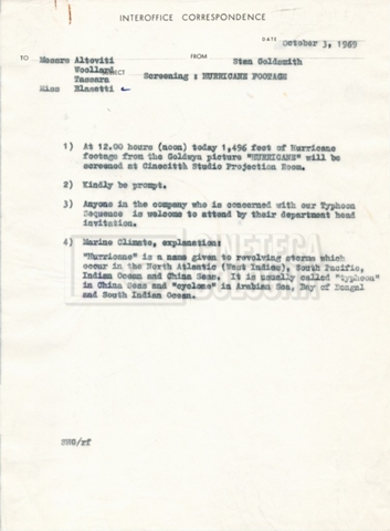 – Due telex da Stan Goldsmith, uno di invito alla proiezione di una scena di un uragano (03 ottobre 1969), il secondo riguardante Michael Anderson (04 ottobre 1969);
