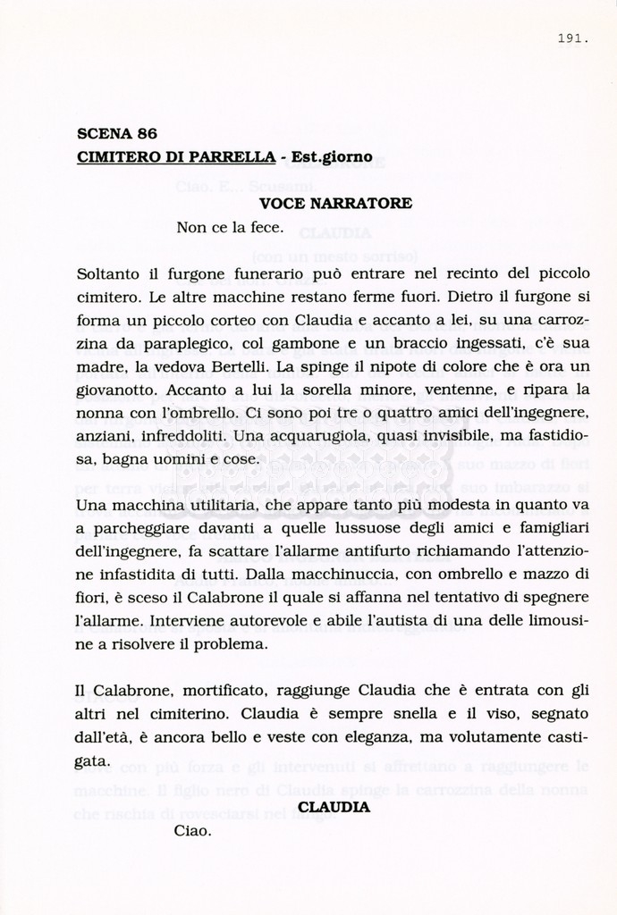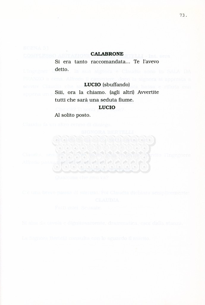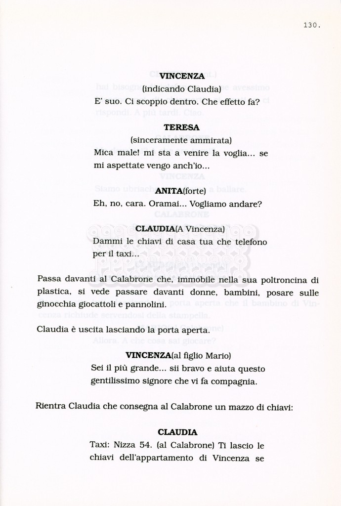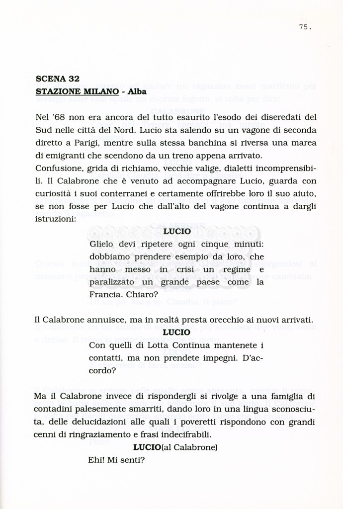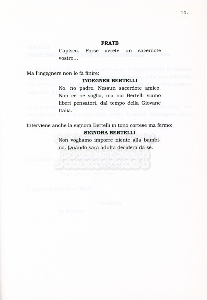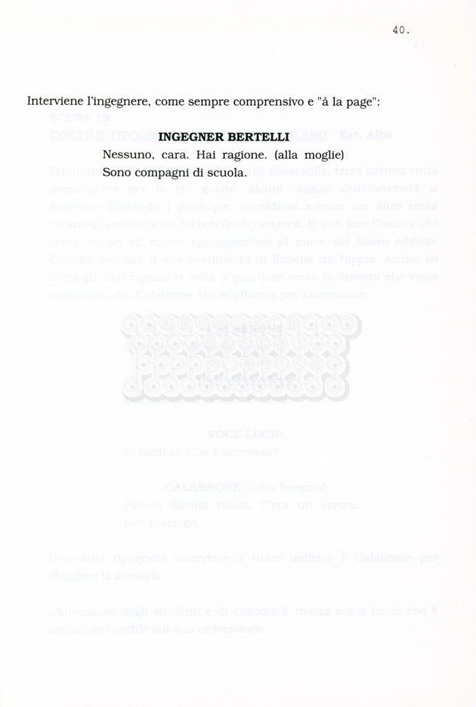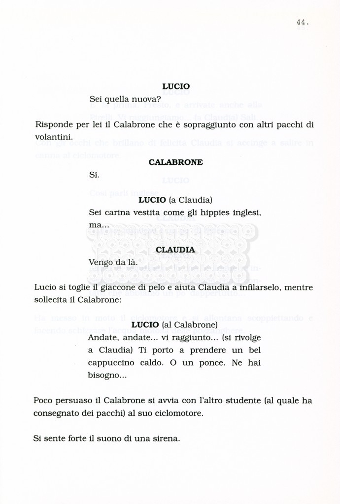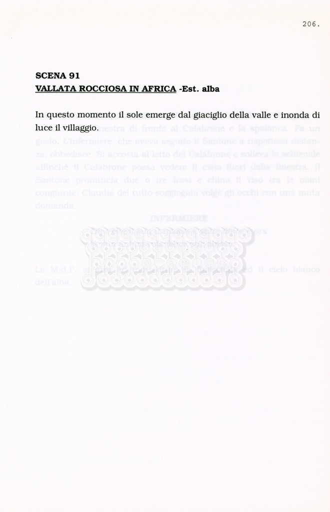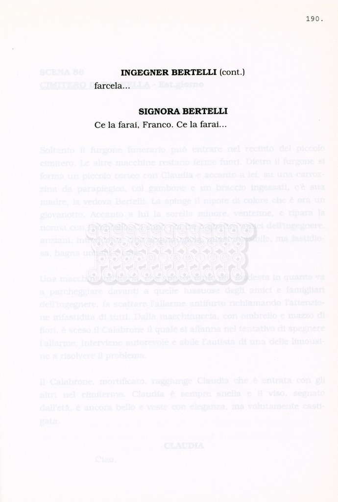 Torna alla banca dati “Facciamo paradiso (titolo provvisorio)” Documento storico Archivio Suso Cecchi d’Amico / Film realizzati / Facciamo Paradiso Ambiti e contenuto Trattasi di una sceneggiatura di Suso Cecchi d'Amico, Leo Benvenuti, Piero De Bernardi e Mario Monicelli. Sul frontespizio compare la dicitura "ultima versione". Informazioni archivistiche Cronologia: maggio 1995 Numero di ordinamento definitivo: 74 Numero di ordinamento provvisorio: 1.18 Descrizione fisica: volume pp. 215 Immagini digitalizzate Informazioni sul film titolo originale: Facciamo paradiso altri titoli: Looking for Paradise regia: Monicelli, Mario anno: 1995 paese di produzione: Italia lingua principale: italiana Documenti correlati Vai alla banca dati
