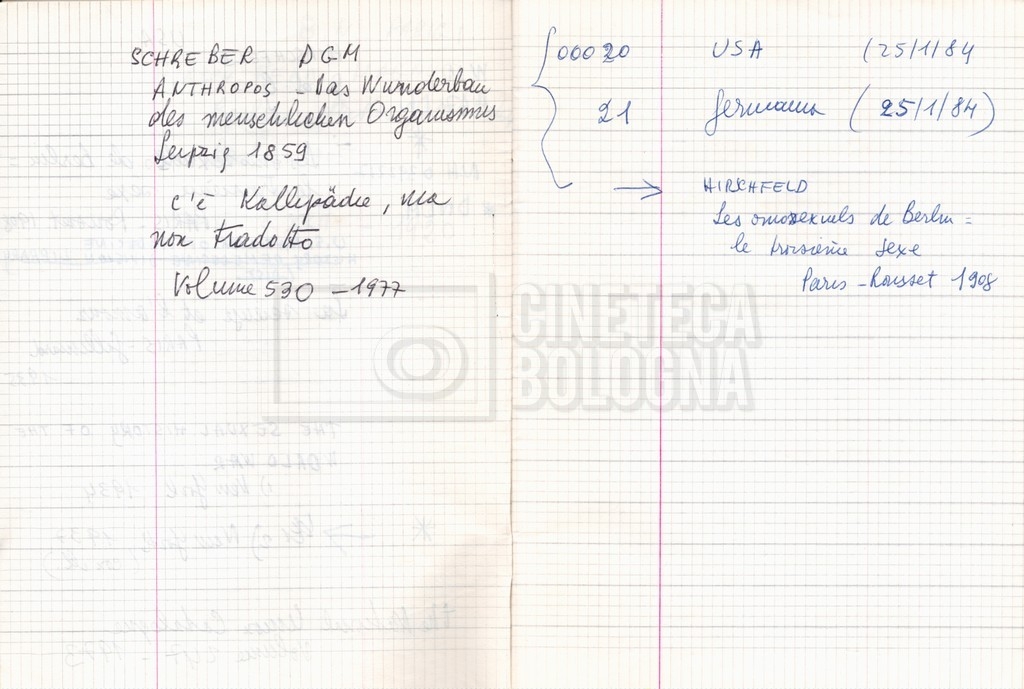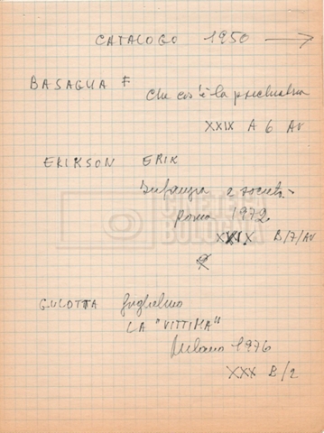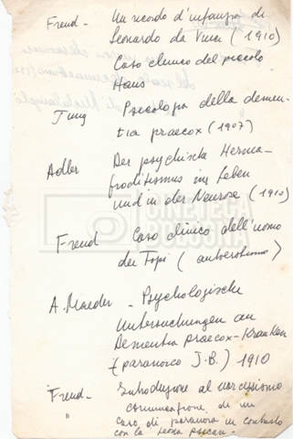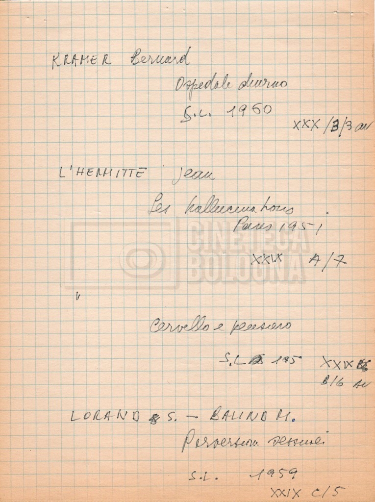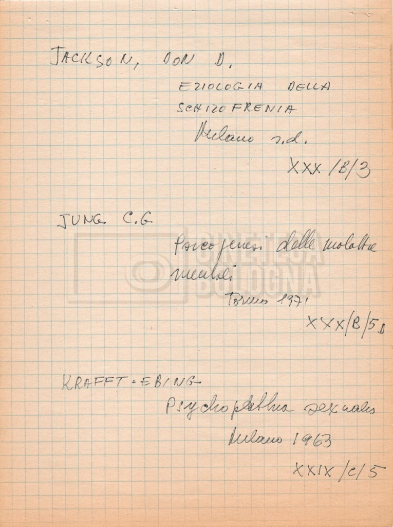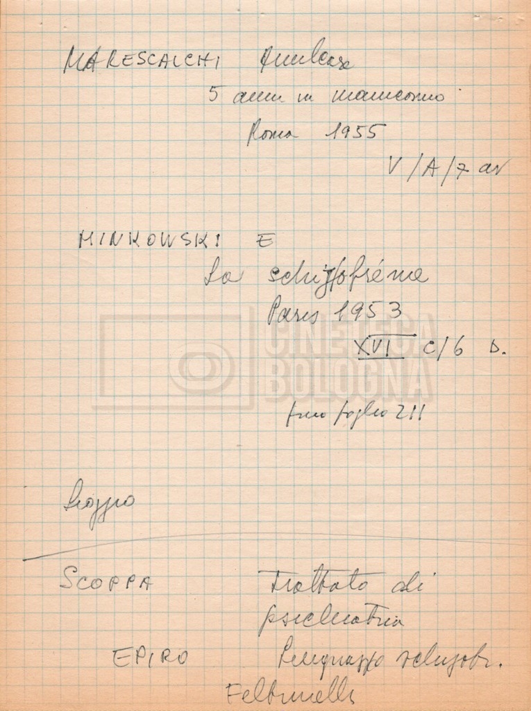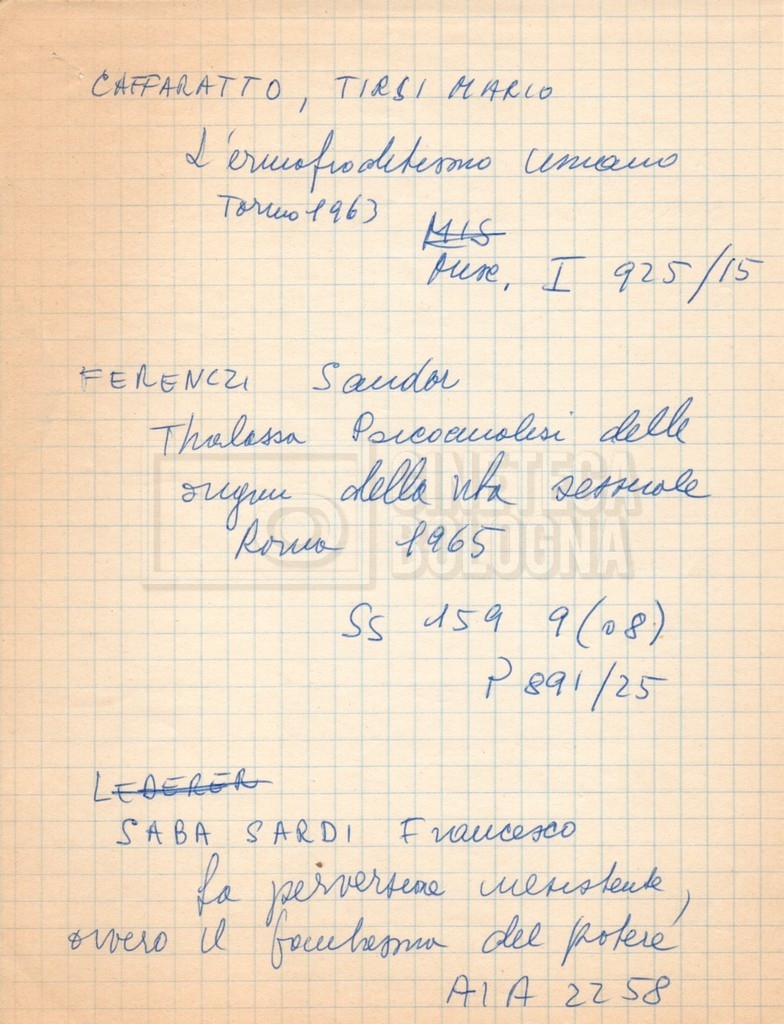 – “Bibliografia”: contiene un catalogo dei periodici della ‘Biblioteca di neurologia neurochirurgia e psichiatria dell’Università di Roma’ (1979), un quaderno sulla catalogazione dei testi riguardanti Schreber nelle biblioteche e appunti mss.