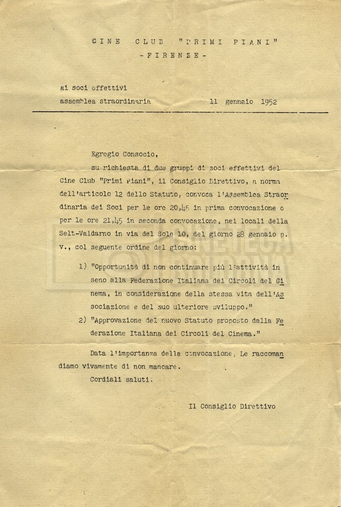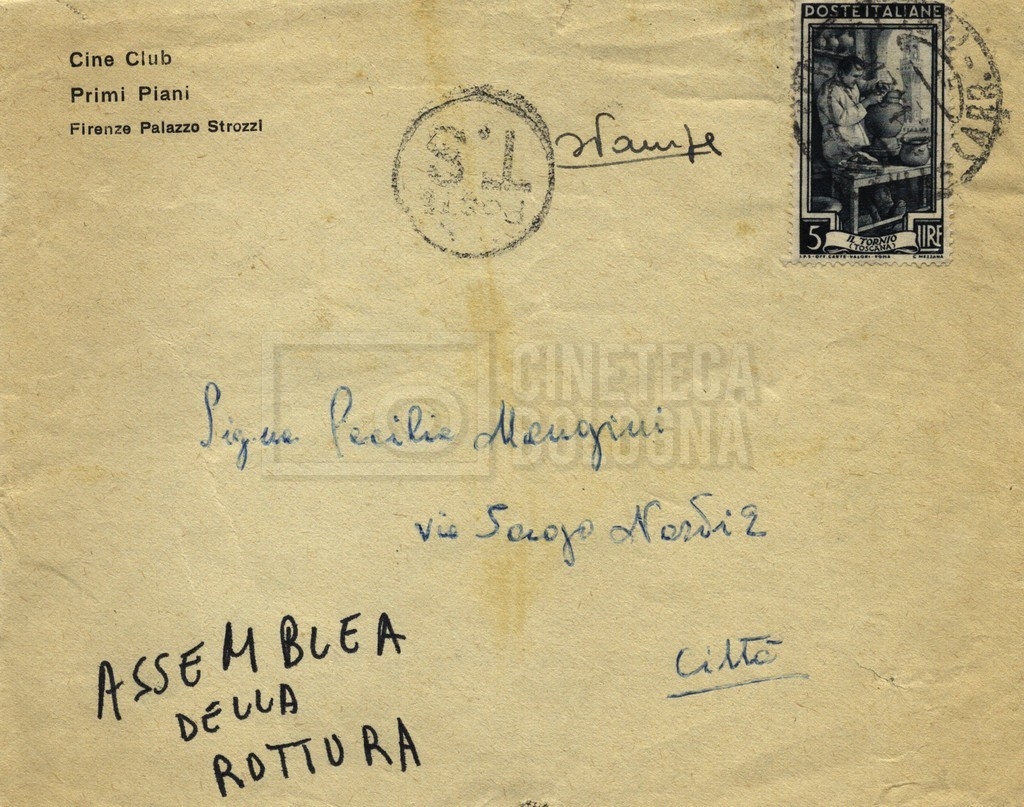 – Una lettera di convocazione per l’assemblea dei soci del cineclub ‘Primi piani’, durante la quale il cineclub votò per uscire dalla FICC. Tra i contrari alla rottura risultano Cecilia Mangini, Callisto Cosulich, Marsili, Libelli e Roberto Manetti, i quali fondarono un nuovo cineclub, ‘Controcampo’, iscritto alla FICC;