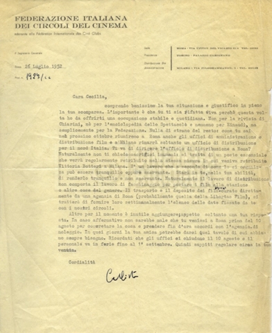 – Una lettera di Callisto Cosulich a Cecilia Mangini, in cui le viene proposto di andare a Roma e lavorare per la FICC.