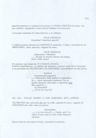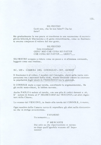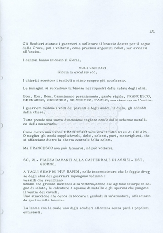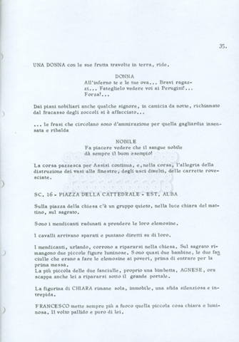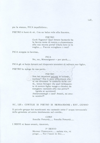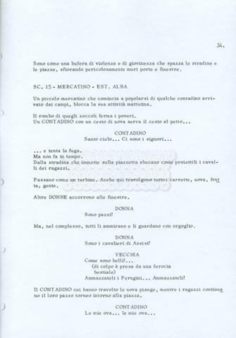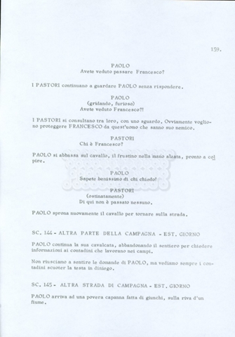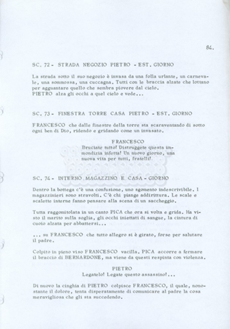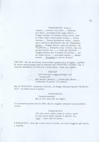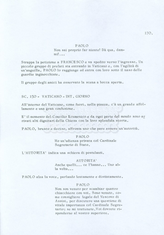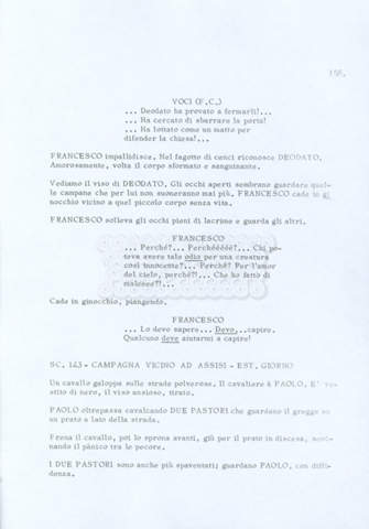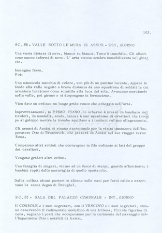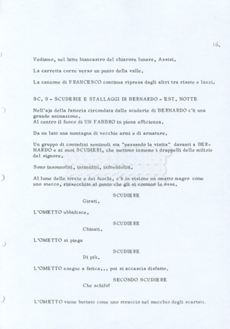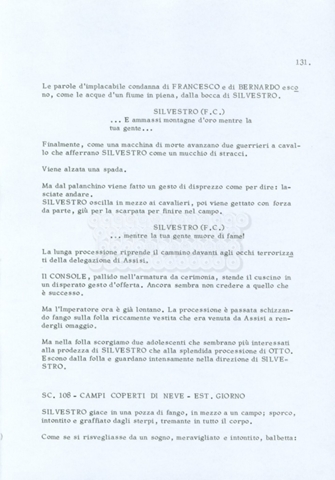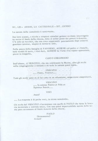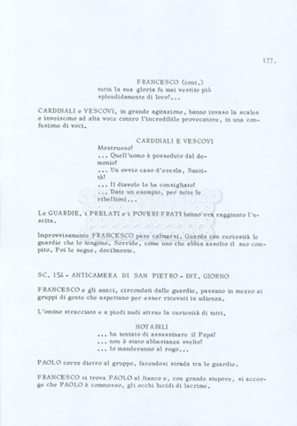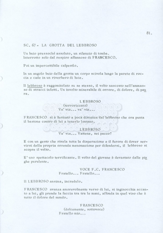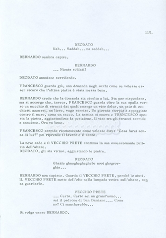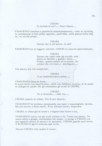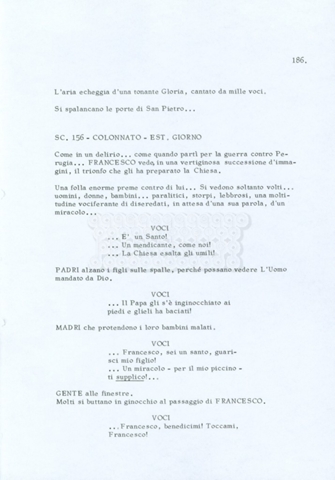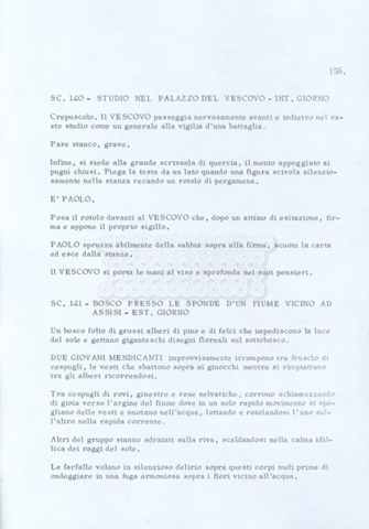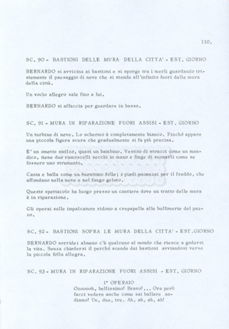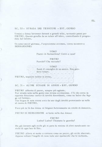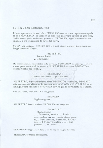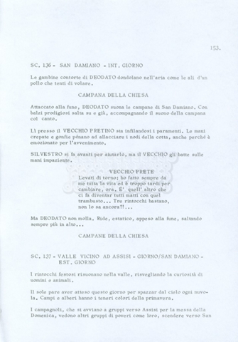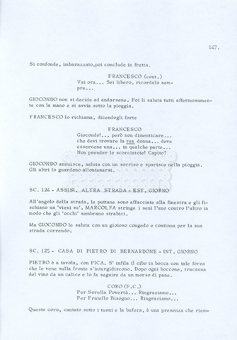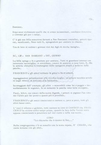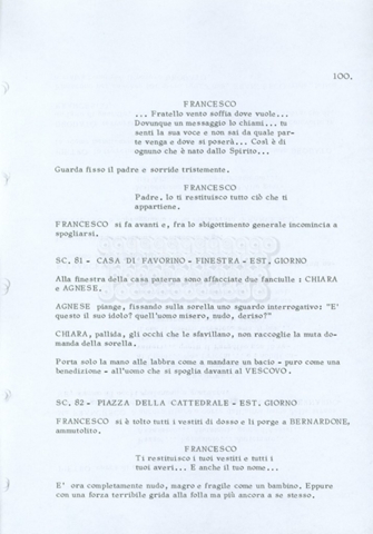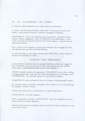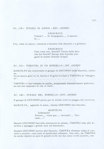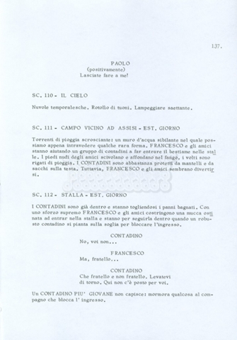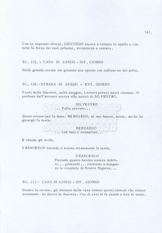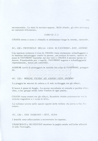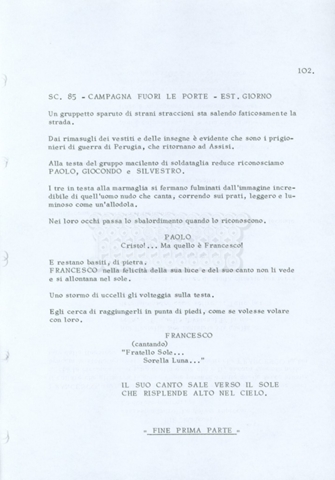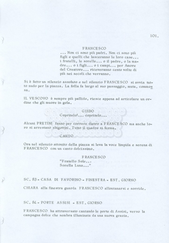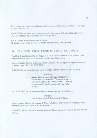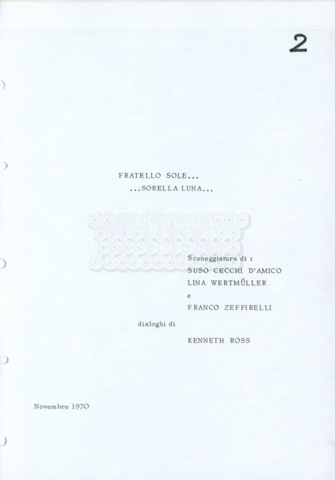Torna alla banca dati “Fratello sole… sorella luna…” Documento storico Archivio Suso Cecchi d’Amico / Film realizzati / Fratello sole sorella luna Ambiti e contenuto Trattasi di una sceneggiatura di Suso Cecchi d’Amico, Lina Wertmüller, Franco Zeffirelli e i dialoghi di Kenneth Ross. Informazioni archivistiche Cronologia: novembre 1970 Numero di ordinamento definitivo: 23 Numero di ordinamento provvisorio: 1.22 Descrizione fisica: volume pp. 188 Immagini digitalizzate Informazioni sul film titolo originale: Fratello sole, sorella luna altri titoli: Brother Sun, Sister Moon regia: Zeffirelli, Franco (Pseudonimo) anno: 1972 paese di produzione: Italia – Regno Unito lingua principale: italiana altre lingue: inglese Documenti correlati Vai alla banca dati DOCUMENTO STORICO Fratello sole…sorella luna
