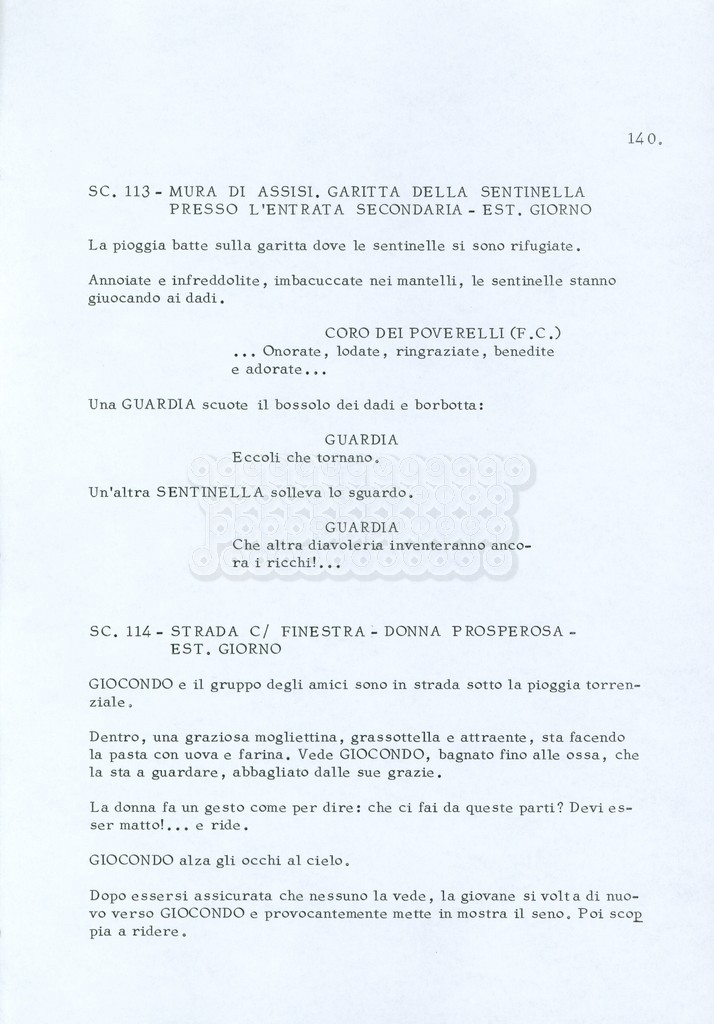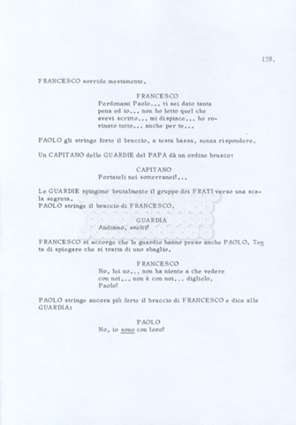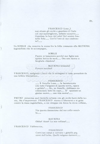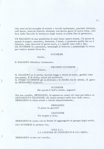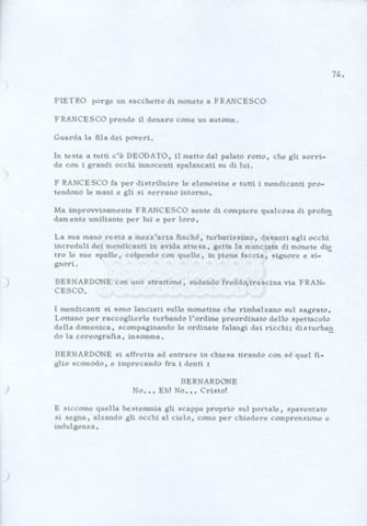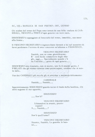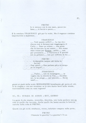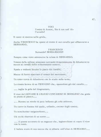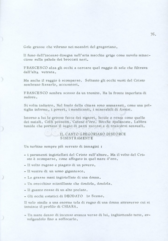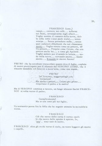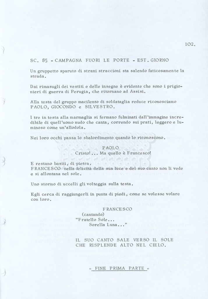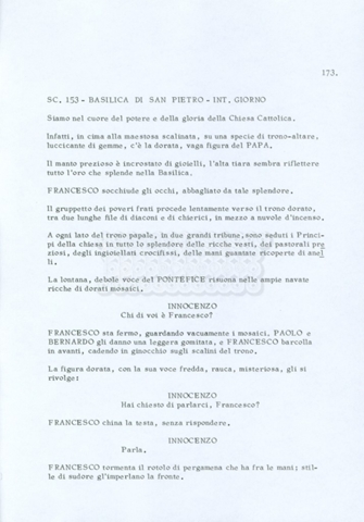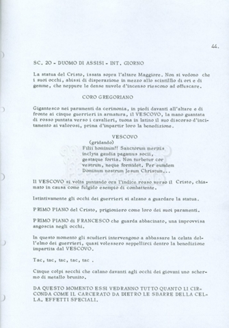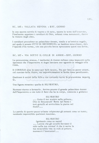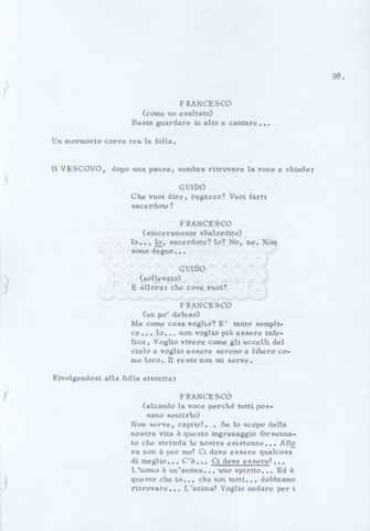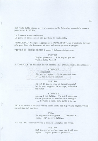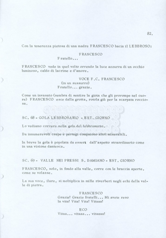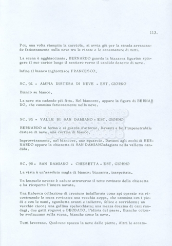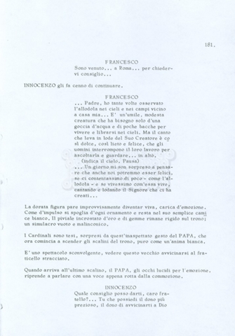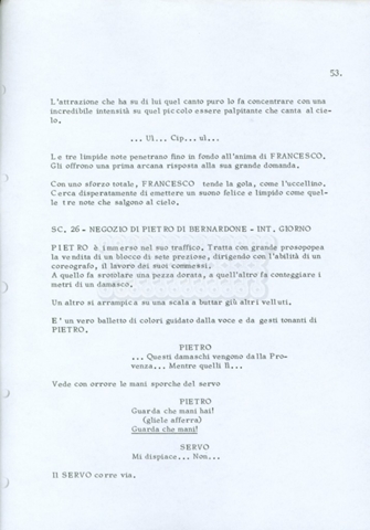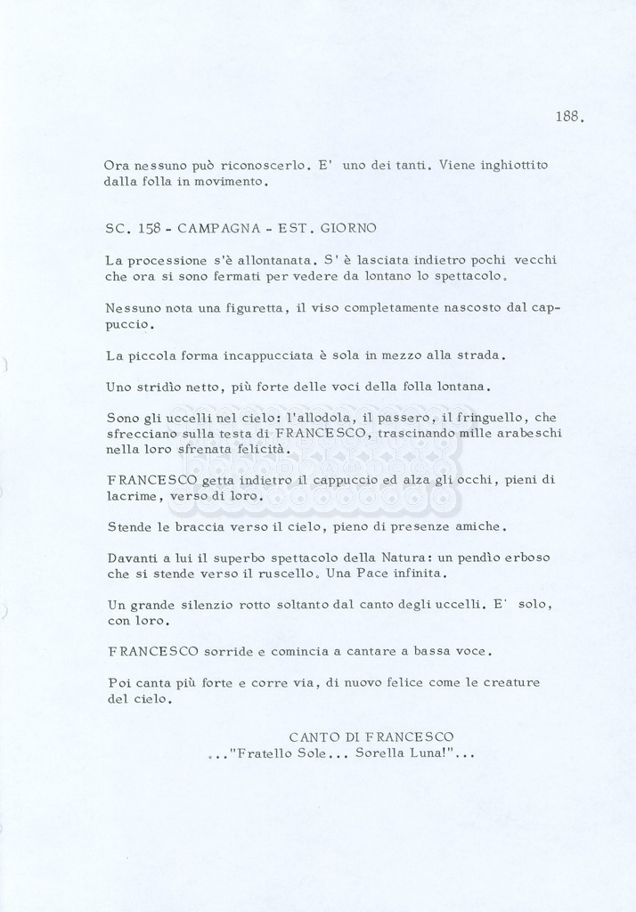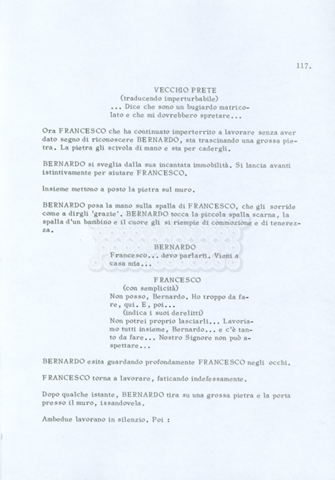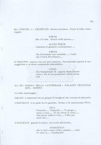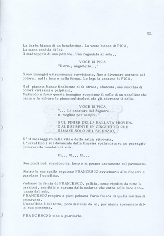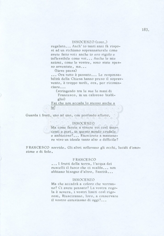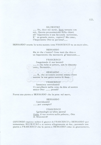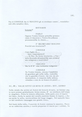 Torna alla banca dati “Fratello sole… sorella luna…” Documento storico Archivio Suso Cecchi d’Amico / Film realizzati / Fratello sole sorella luna Ambiti e contenuto Trattasi di una sceneggiatura di Suso Cecchi d’Amico, Lina Wertmüller, Franco Zeffirelli e i dialoghi di Kenneth Ross. Informazioni archivistiche Cronologia: novembre 1970 Numero di ordinamento definitivo: 23 Numero di ordinamento provvisorio: 1.22 Descrizione fisica: volume pp. 188 Immagini digitalizzate Informazioni sul film titolo originale: Fratello sole, sorella luna altri titoli: Brother Sun, Sister Moon regia: Zeffirelli, Franco (Pseudonimo) anno: 1972 paese di produzione: Italia – Regno Unito lingua principale: italiana altre lingue: inglese Documenti correlati Vai alla banca dati DOCUMENTO STORICO Fratello sole…sorella luna