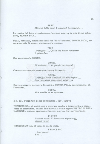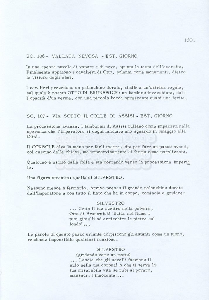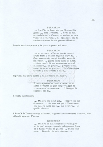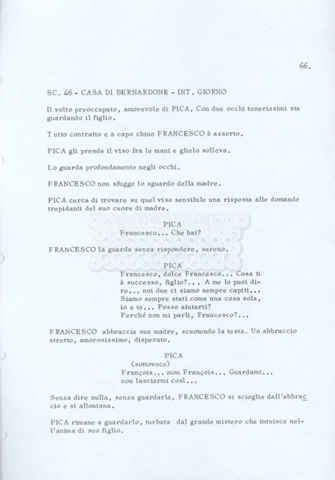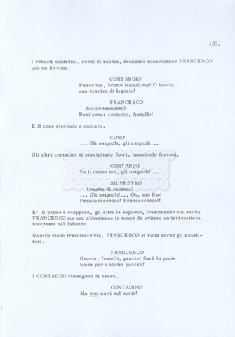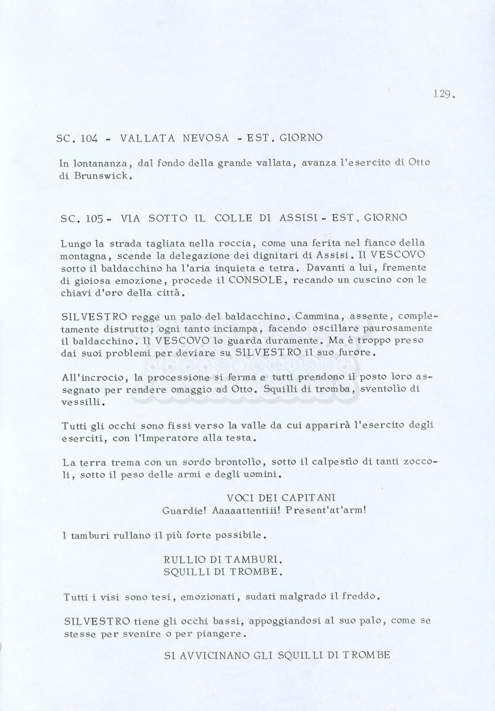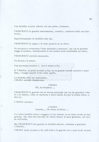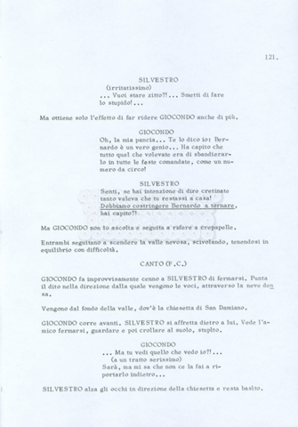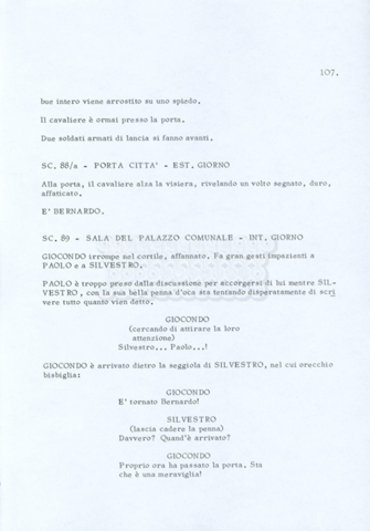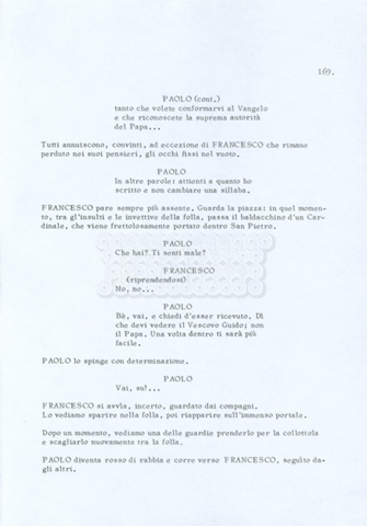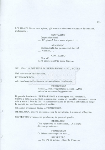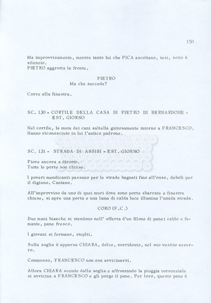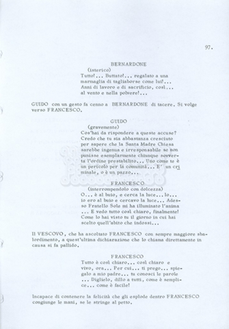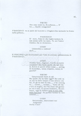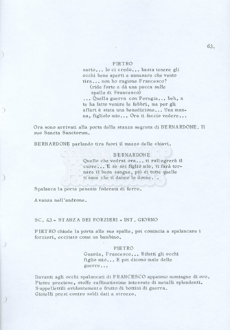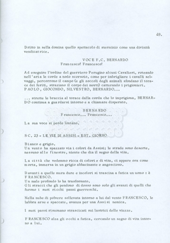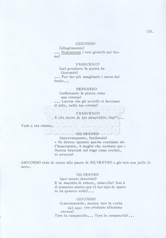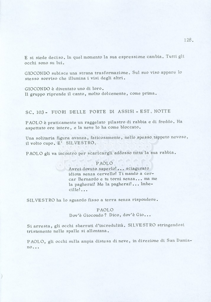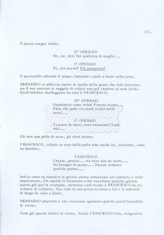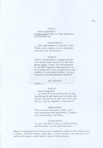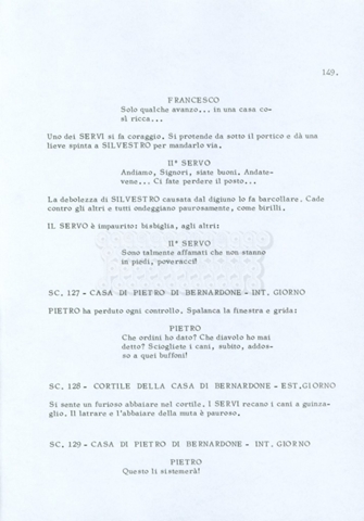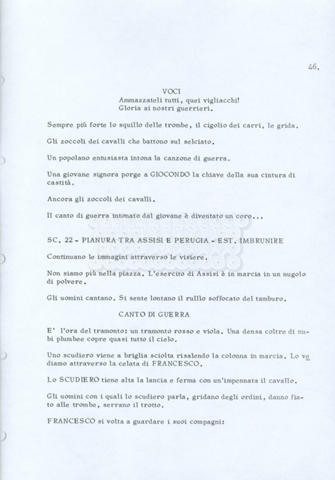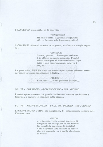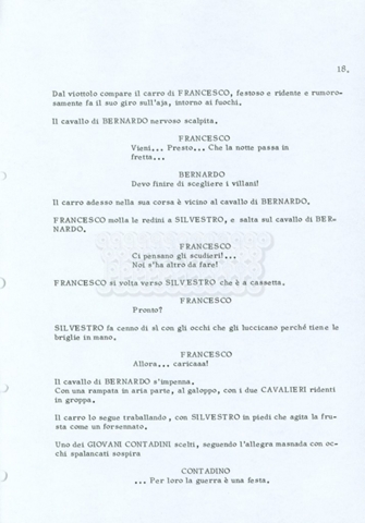 Torna alla banca dati “Fratello sole… sorella luna…” Documento storico Archivio Suso Cecchi d’Amico / Film realizzati / Fratello sole sorella luna Ambiti e contenuto Trattasi di una sceneggiatura di Suso Cecchi d’Amico, Lina Wertmüller, Franco Zeffirelli e i dialoghi di Kenneth Ross. Informazioni archivistiche Cronologia: novembre 1970 Numero di ordinamento definitivo: 23 Numero di ordinamento provvisorio: 1.22 Descrizione fisica: volume pp. 188 Immagini digitalizzate Informazioni sul film titolo originale: Fratello sole, sorella luna altri titoli: Brother Sun, Sister Moon regia: Zeffirelli, Franco (Pseudonimo) anno: 1972 paese di produzione: Italia – Regno Unito lingua principale: italiana altre lingue: inglese Documenti correlati Vai alla banca dati DOCUMENTO STORICO Fratello sole…sorella luna